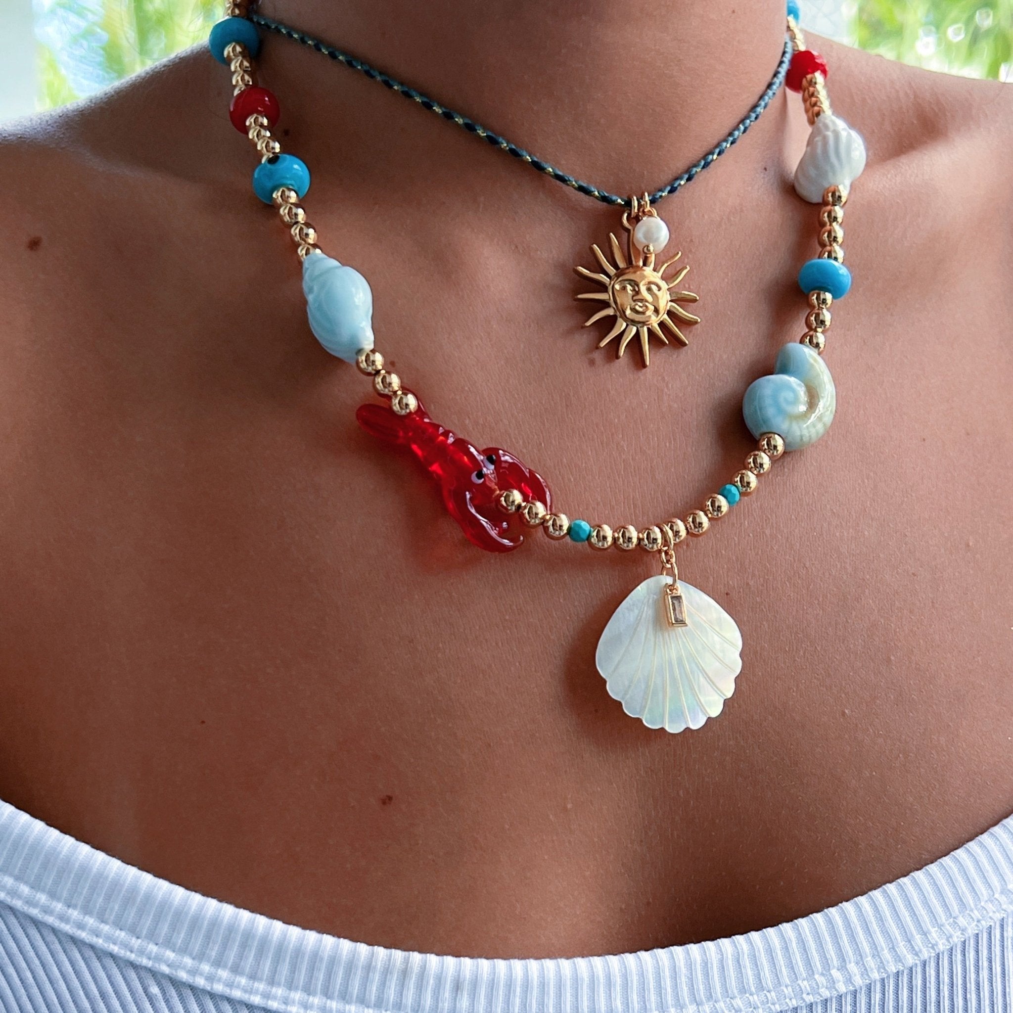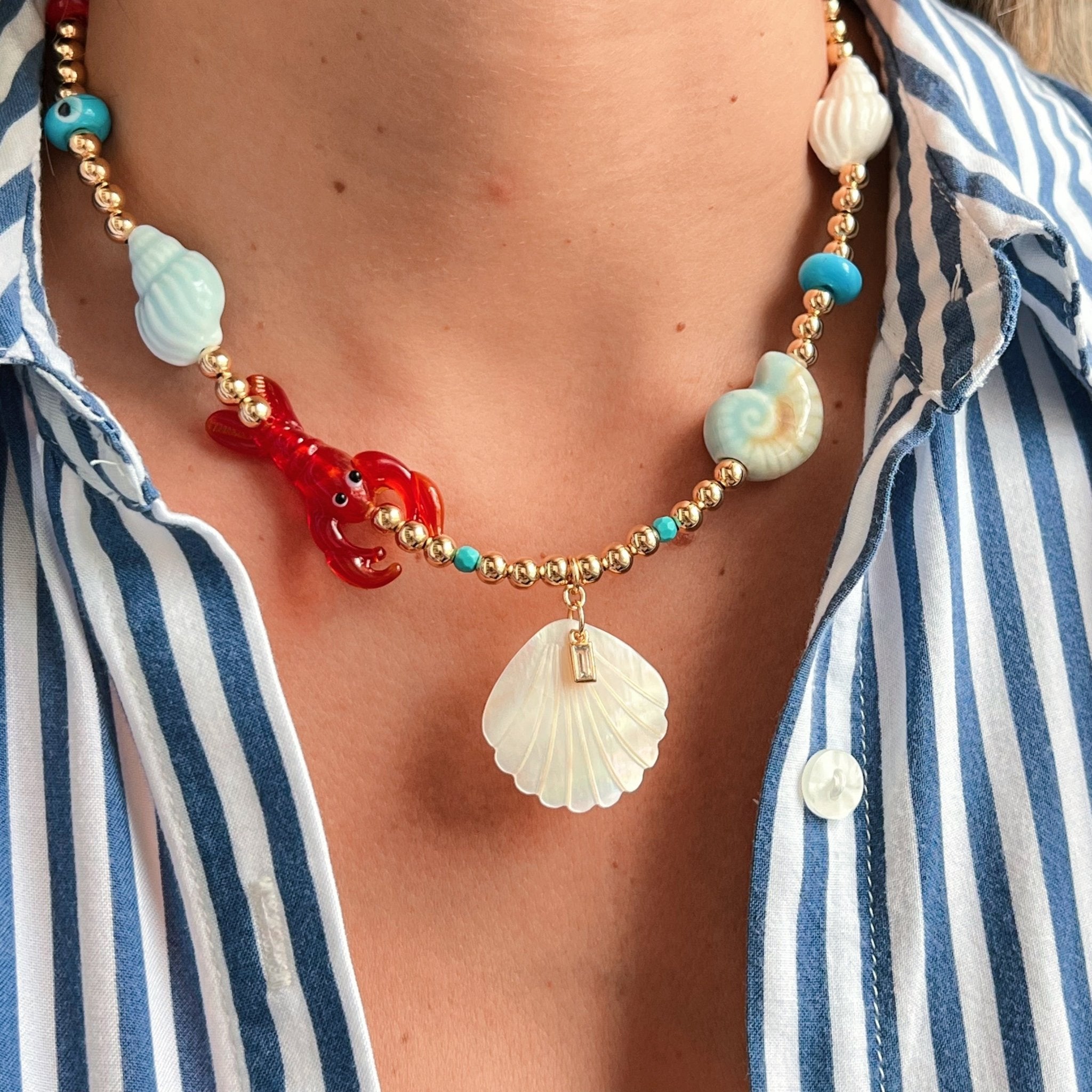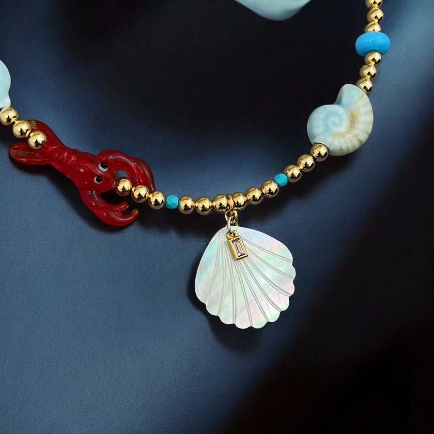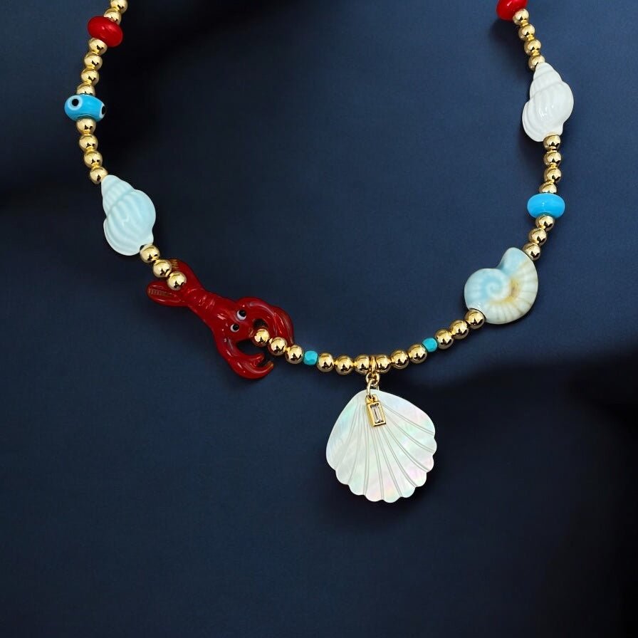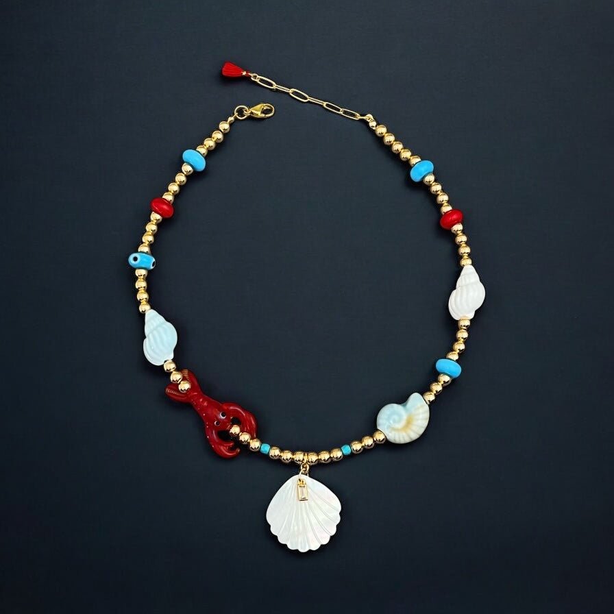 A summer-ready piece that radiates joy, elegance, and protection. This limited-edition necklace blends coastal symbols with vibrant Murano glass details and bold, chic color accents. Each charm tells a story — of abundance, light, and playful energy flowing freely, just like the ocean. The red lobster, blue seashells, and evil eye are all made of Murano glass, handcrafted to elevate your summer look with personality and meaning. At the center, a natural white seashell with a sparkling Cz detail adds sophistication and divine connection. The gold-plated beads enhance the composition with warm, elegant contrast, and the red tassel at the extender adds a vibrant finishing touch. Pair it with linen outfits, swimsuits, white shirts, or layered with delicate chains. This is your ultimate statement piece for sunny days and breezy nights.