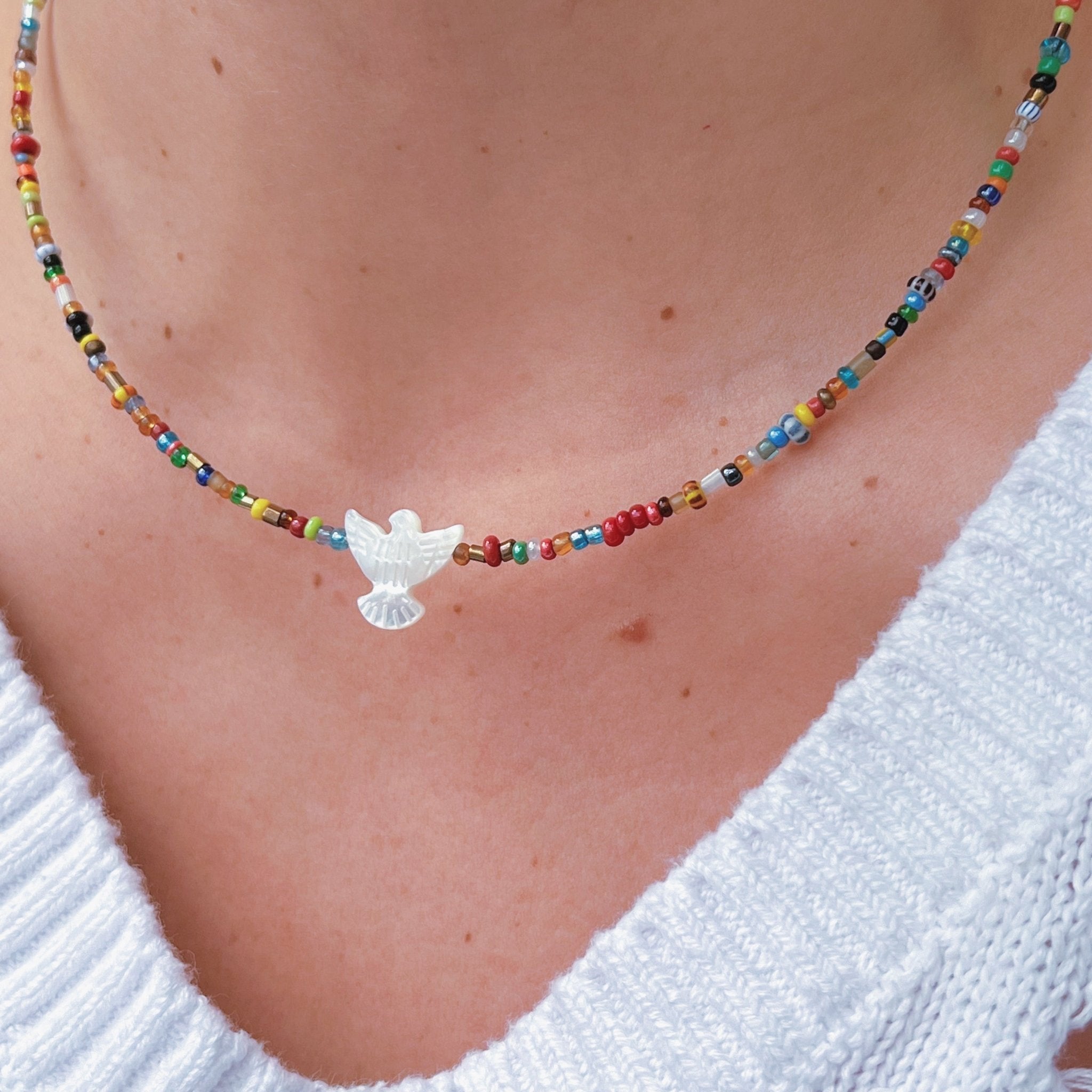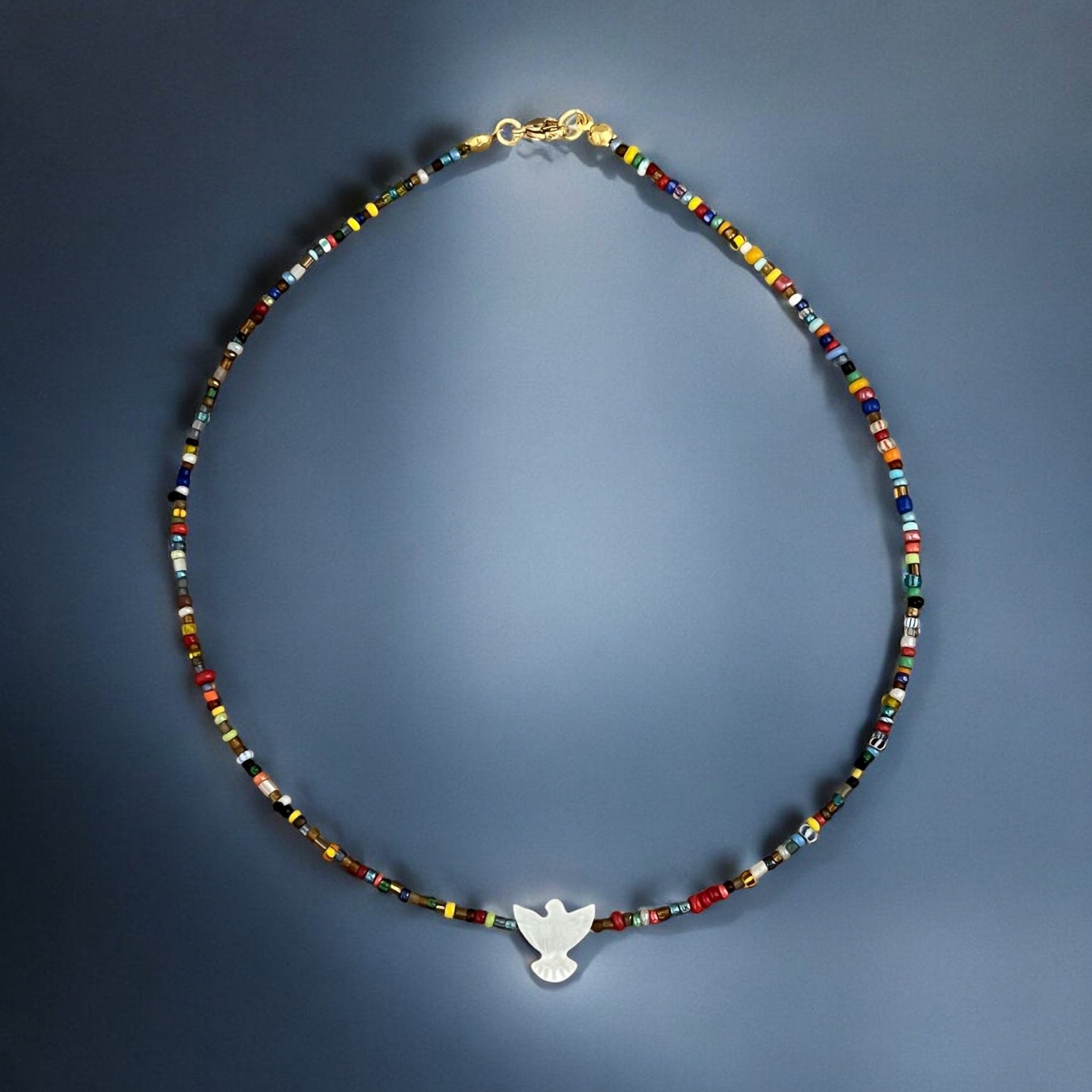 This multicolor beaded necklace features a radiant mother of pearl dove, a universal symbol of peace, hope, and divine presence. Designed to inspire serenity and elevate your energy, it’s a meaningful piece that feels as beautiful as it looks. Handmade with care, each necklace carries its own unique charm.