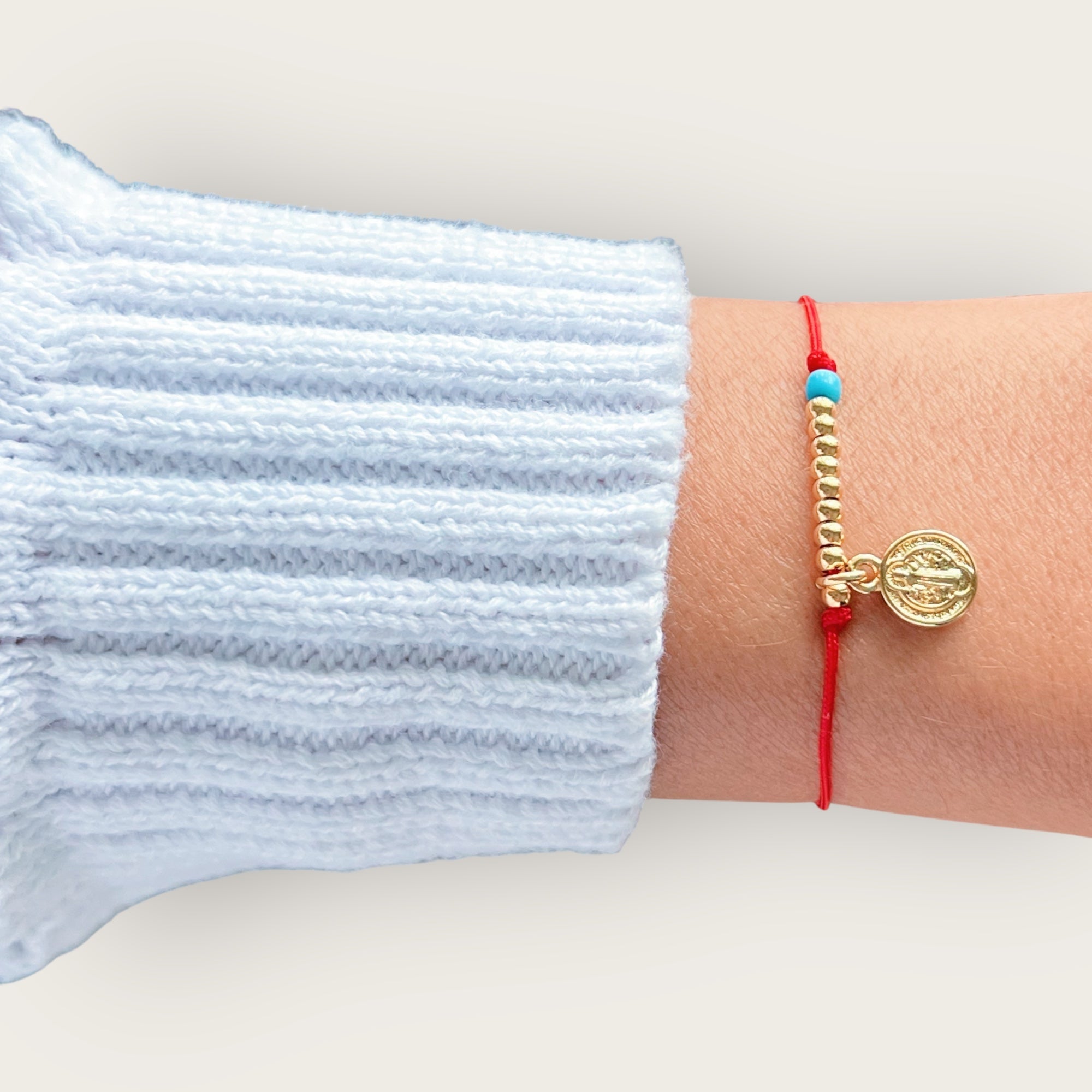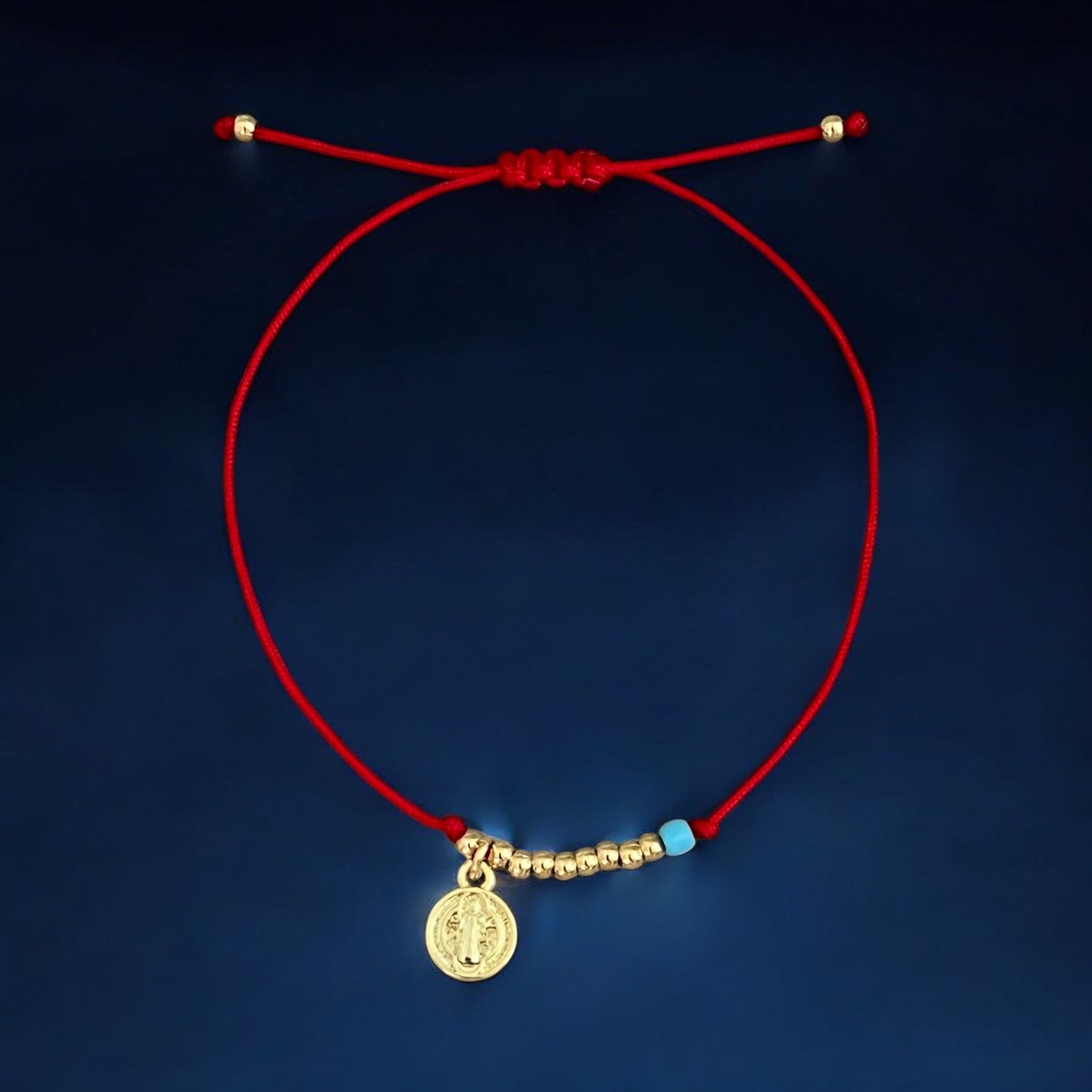 This bracelet features the Saint Benedict medal, a sacred symbol of protection and strength, paired with the traditional red string, known for warding off negativity and attracting good fortune. Enhanced with delicate gold-plated beads and an adjustable sliding closure, this piece is both meaningful and versatile — perfect for daily wear or as a gift filled with faith and blessings.
