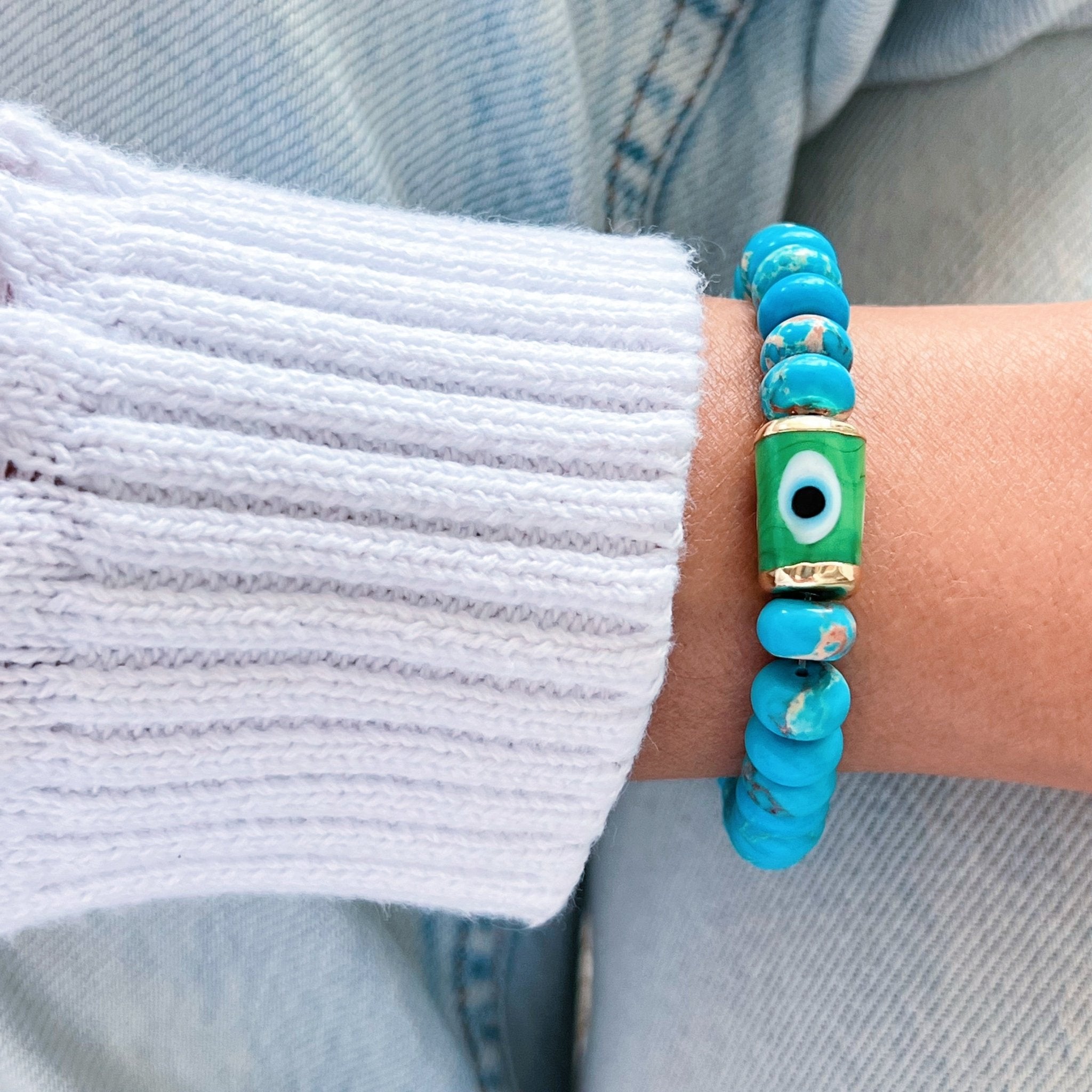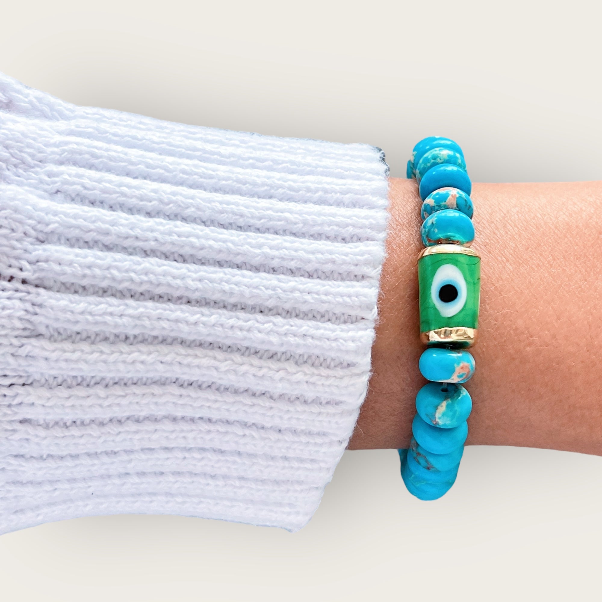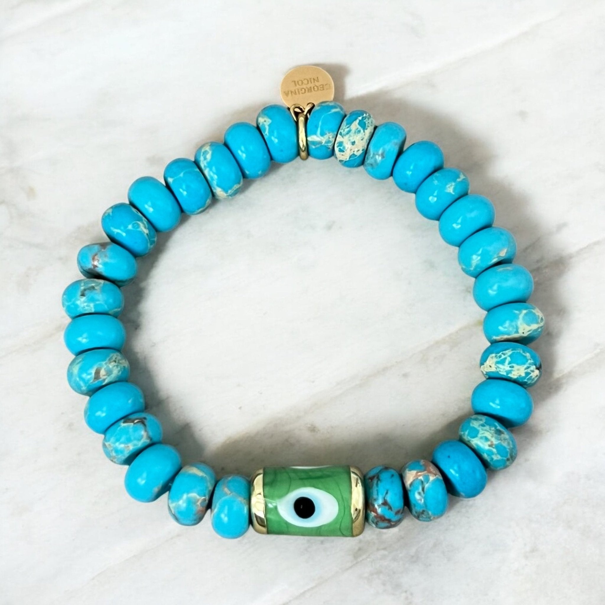 This turquoise stretch bracelet is designed to align you with clarity, serenity, and energetic protection. At the center, a striking green Murano glass evil eye acts as a powerful symbol of good fortune and spiritual awareness.