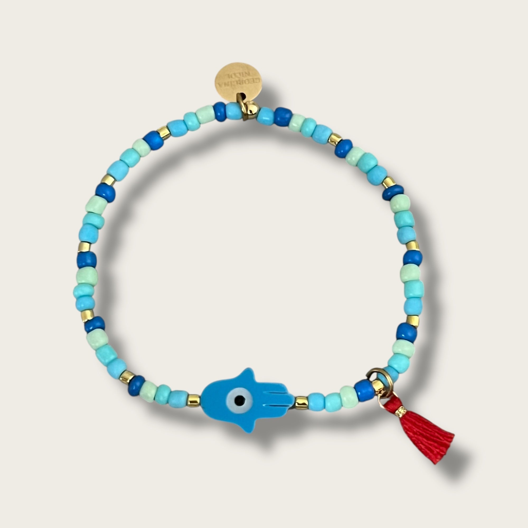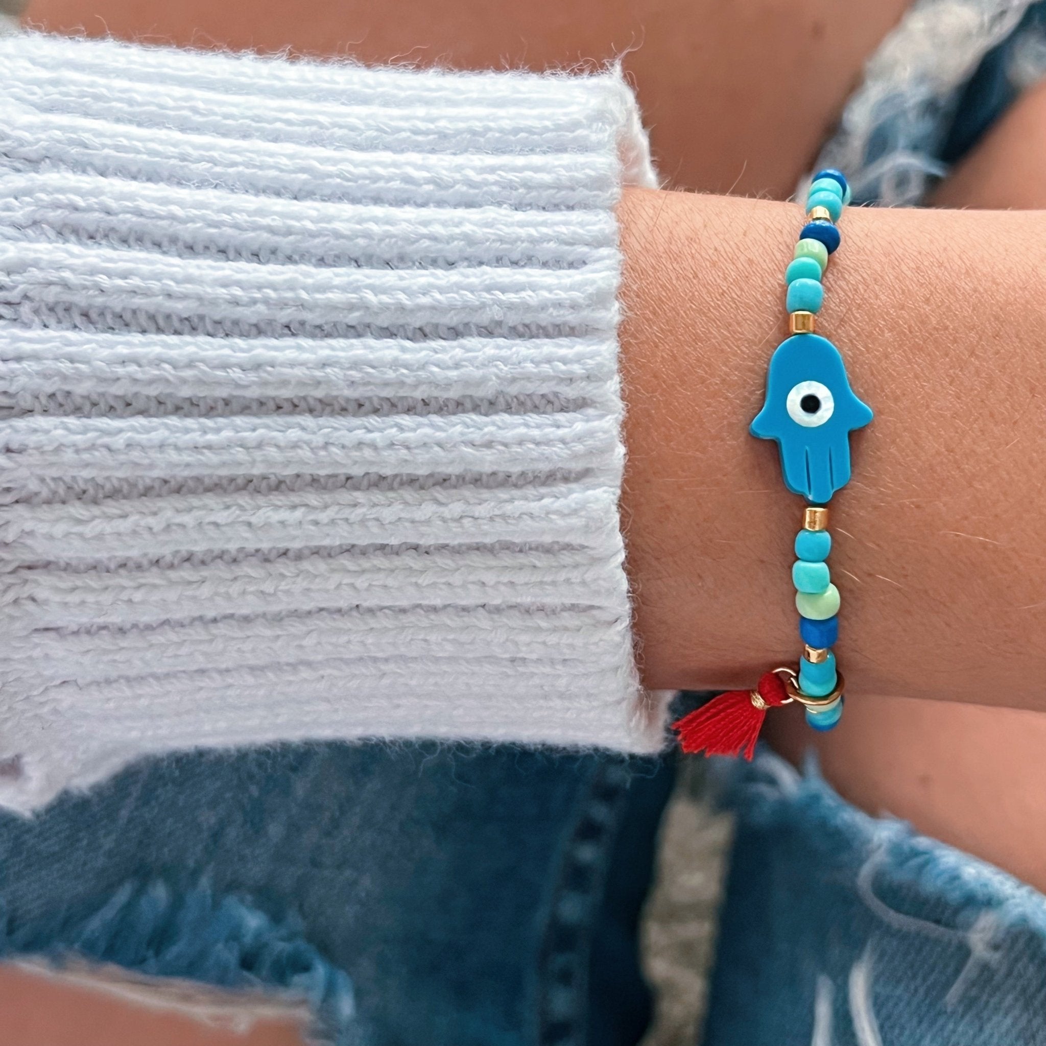 This handmade bracelet blends the timeless symbolism of the Hamsa hand and the evil eye, bringing strength, blessings, and balance. Designed in soothing blue tones with gold hematite accents and finished with a red tassel, it’s a modern piece with deep meaning.