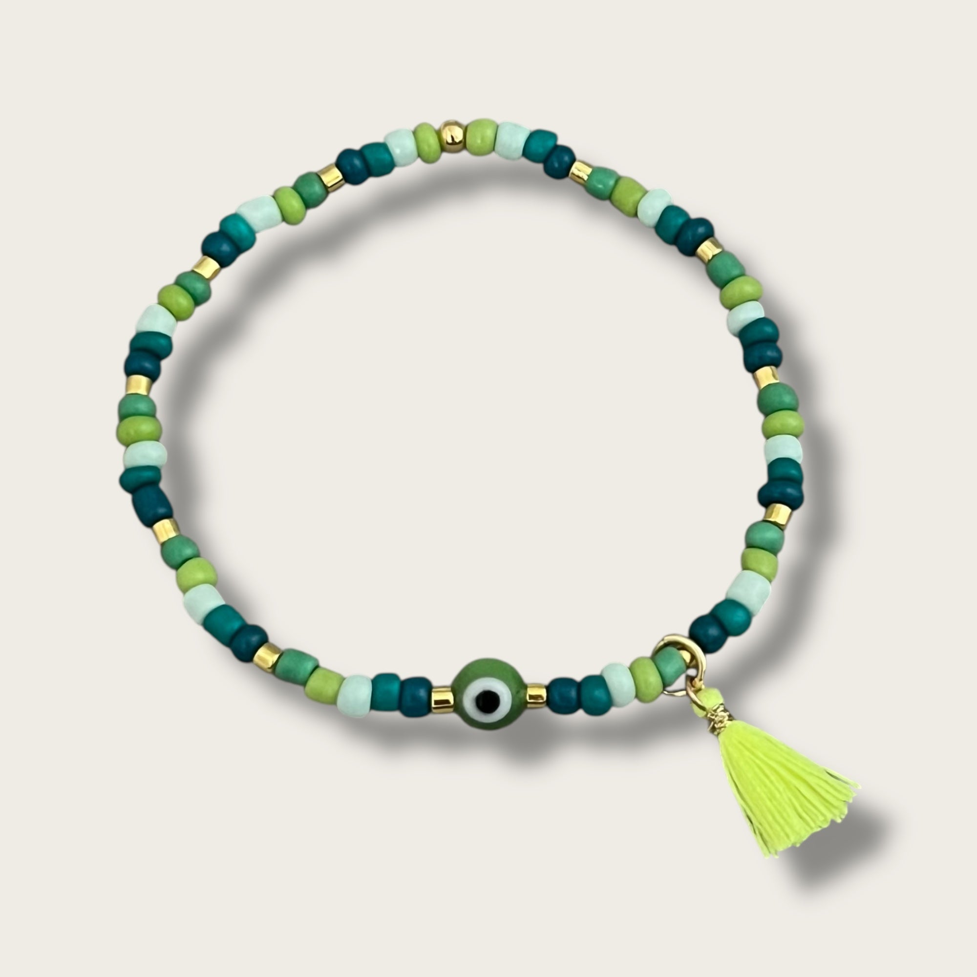 Handmade green tones beaded bracelet, designed with symbolic accents that bring harmony and a touch of protection. At its center, a green evil eye bead enhances its spiritual meaning, while the tassel adds a chic and playful finish. Perfect to wear alone or layered, this bracelet brings fresh energy to your daily style.