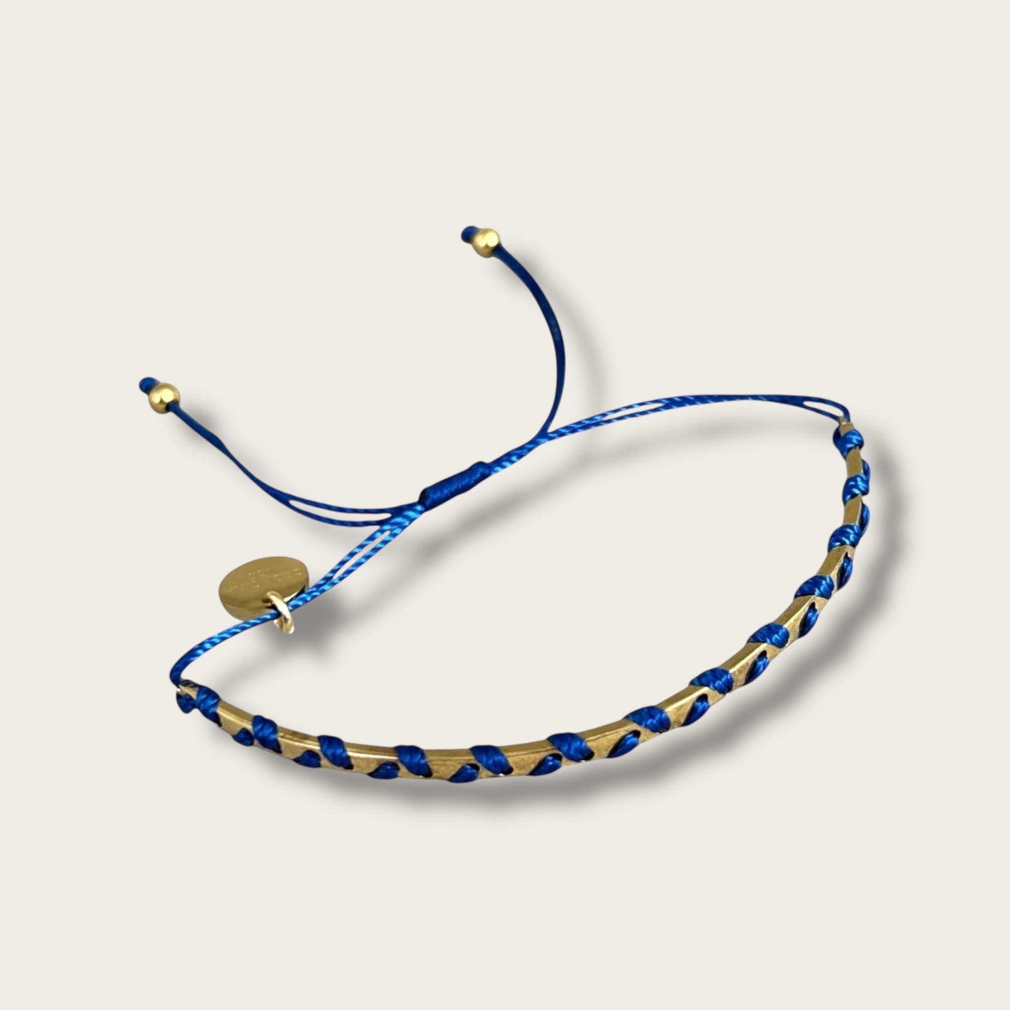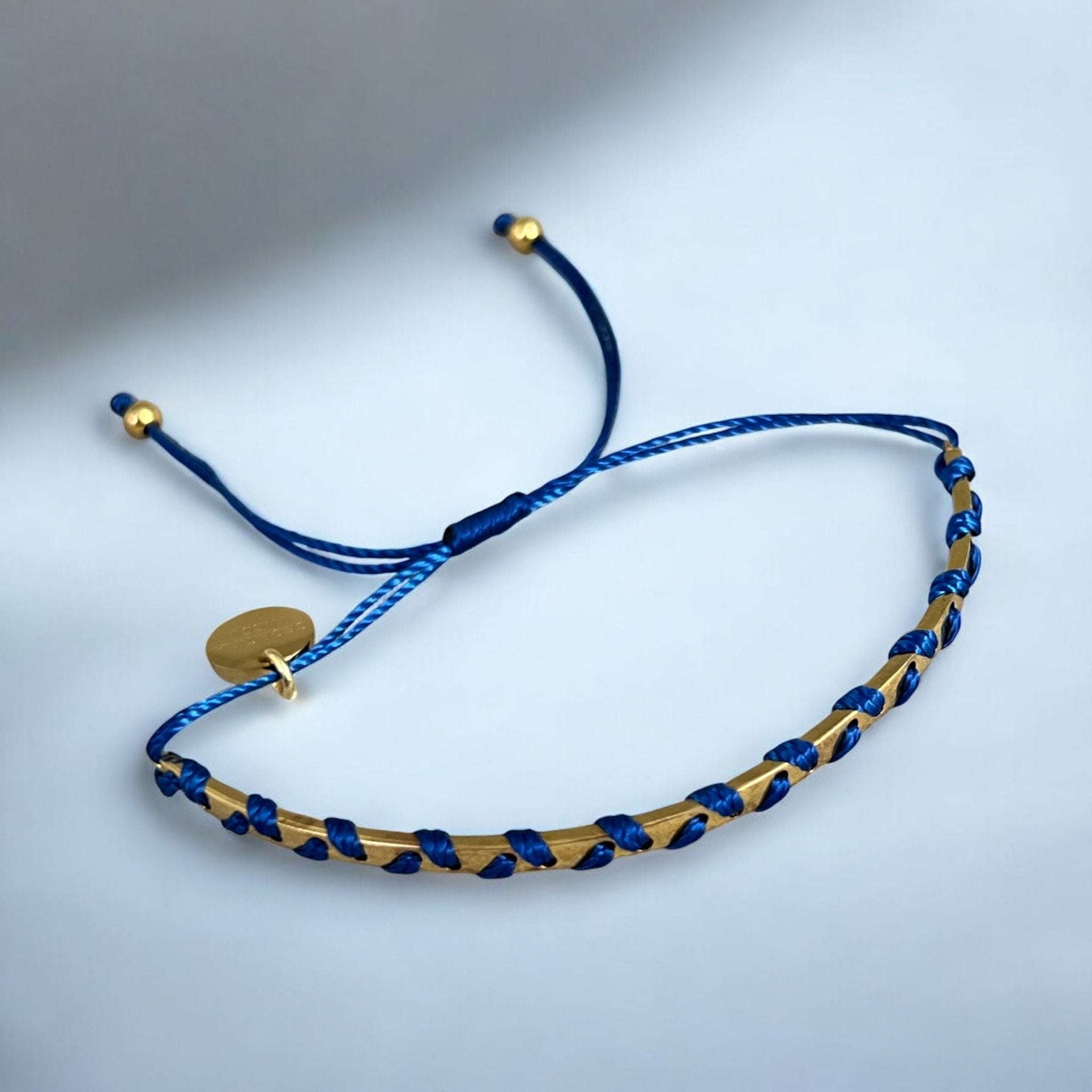 Blue silk bracelet with adjustable sliding closure, handwoven around a sleek 8cm gold filled bar. A modern piece crafted to move with you, offering both comfort and style in every detail. Subtle, refined, and full of intention.