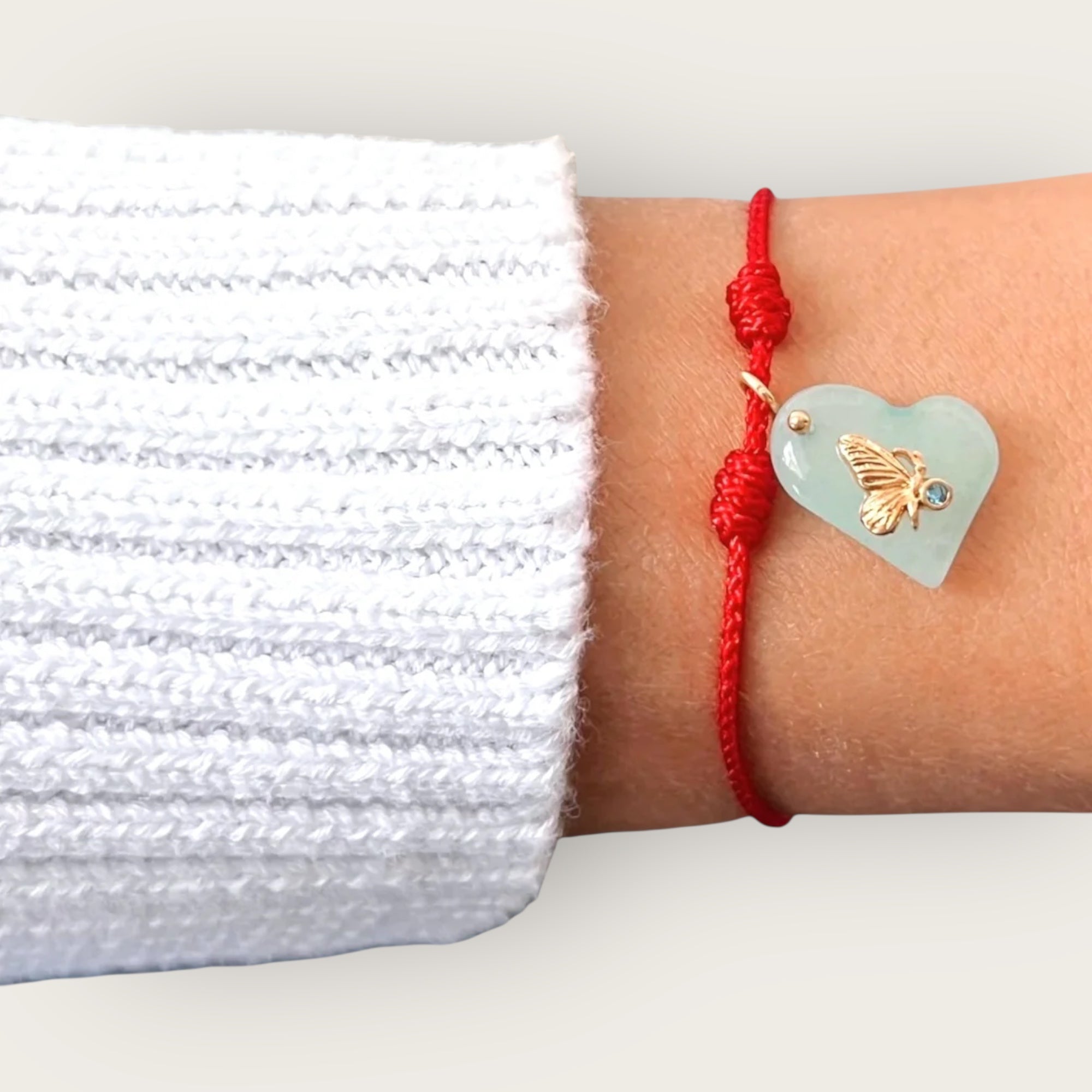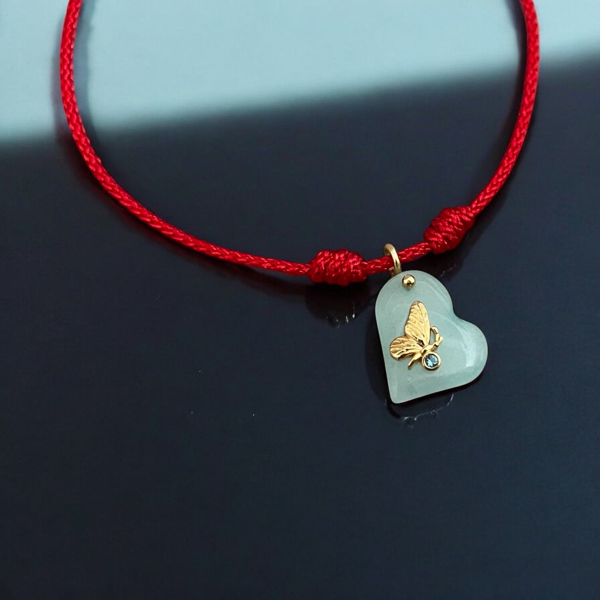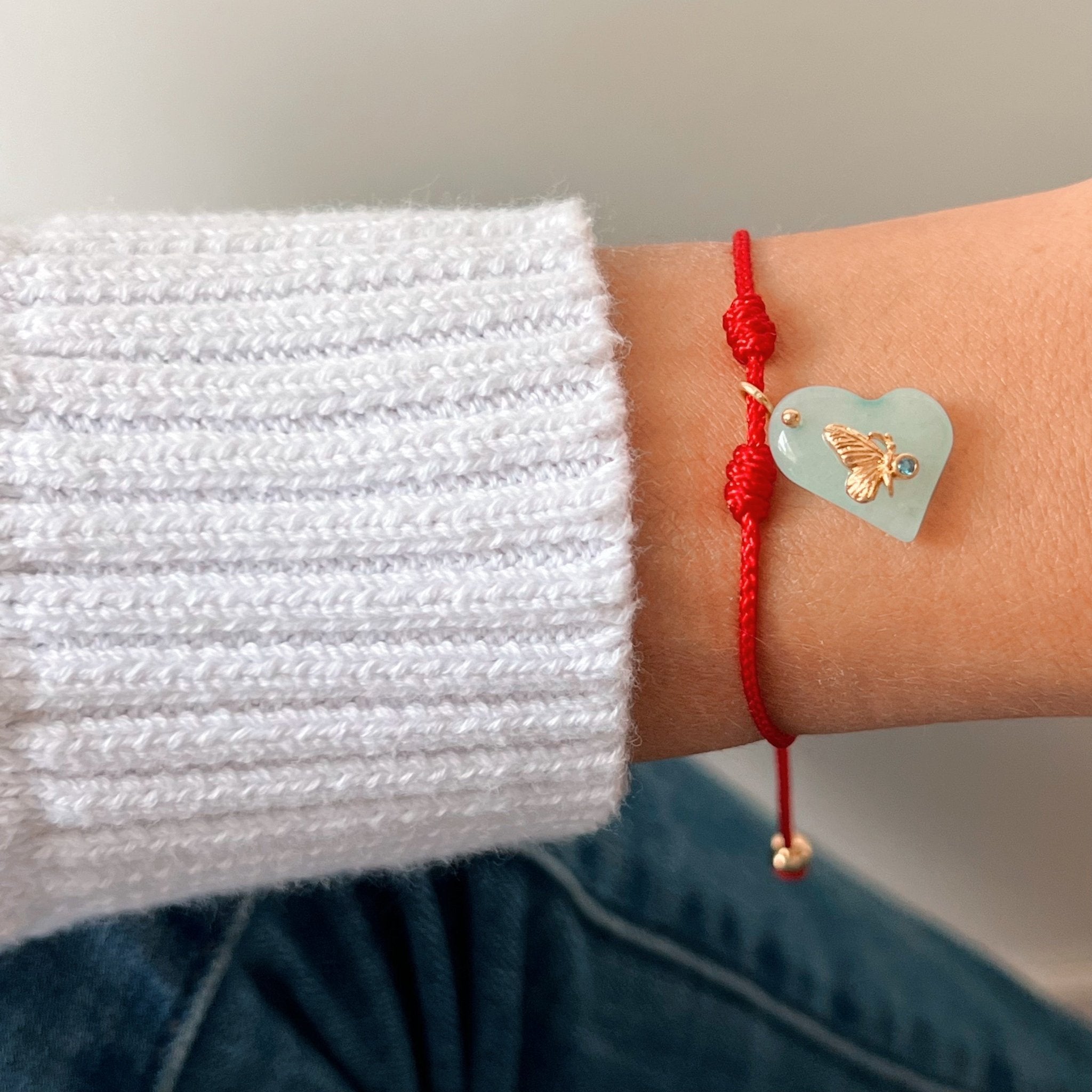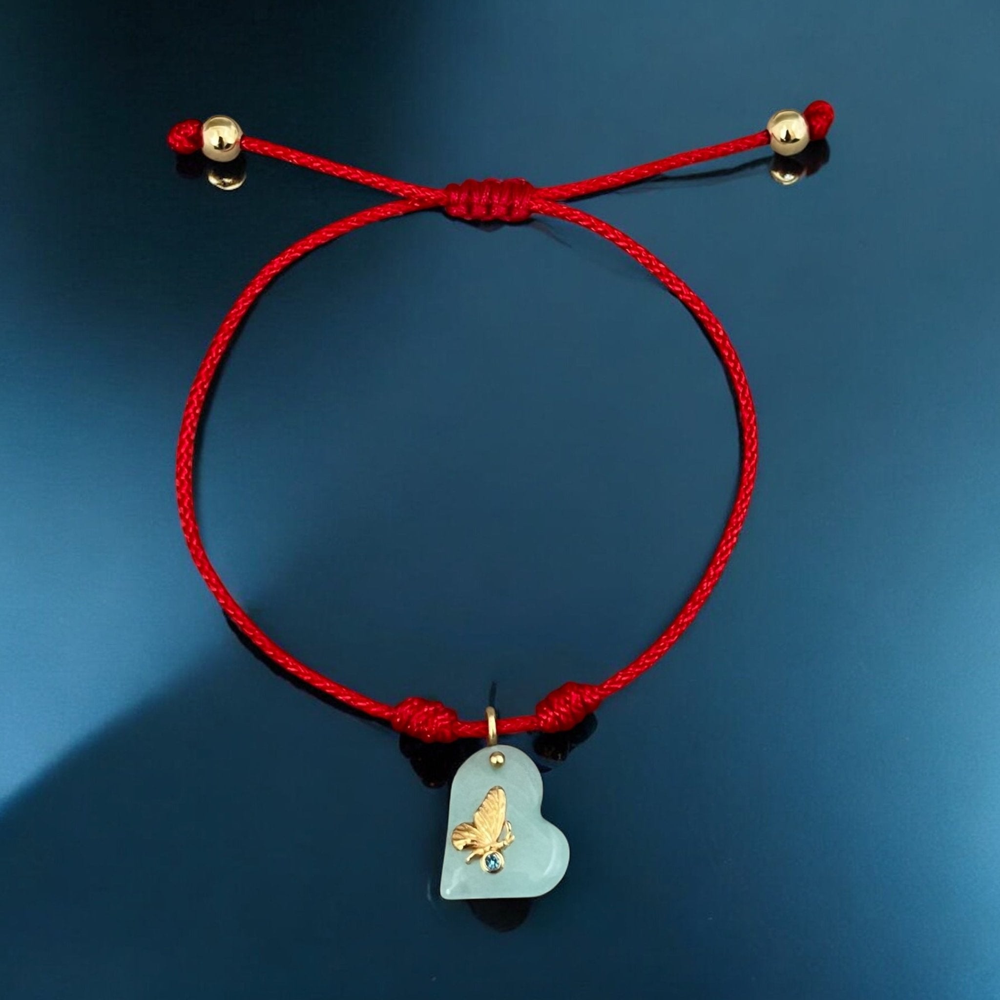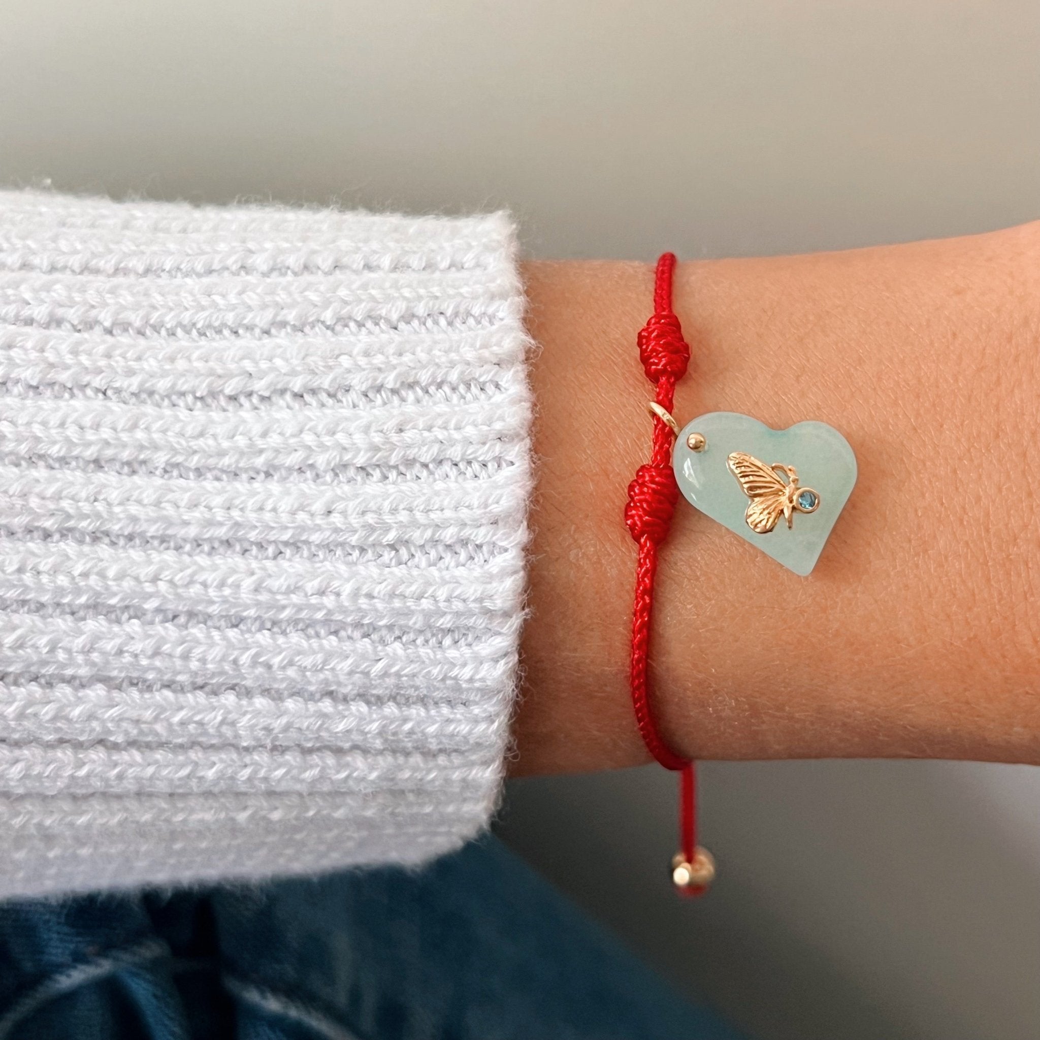 This bracelet is a symbol of emotional growth and transformation. The red cord represents protection, intention and personal strength. At the center, a heart-shaped blue quartz charm holds a delicate gold butterfly — the ultimate symbol of change and softness — with a deep blue cubic zirconia that brings clarity and intuition. It's a tender reminder that transformation begins in the heart and radiates through your energy.