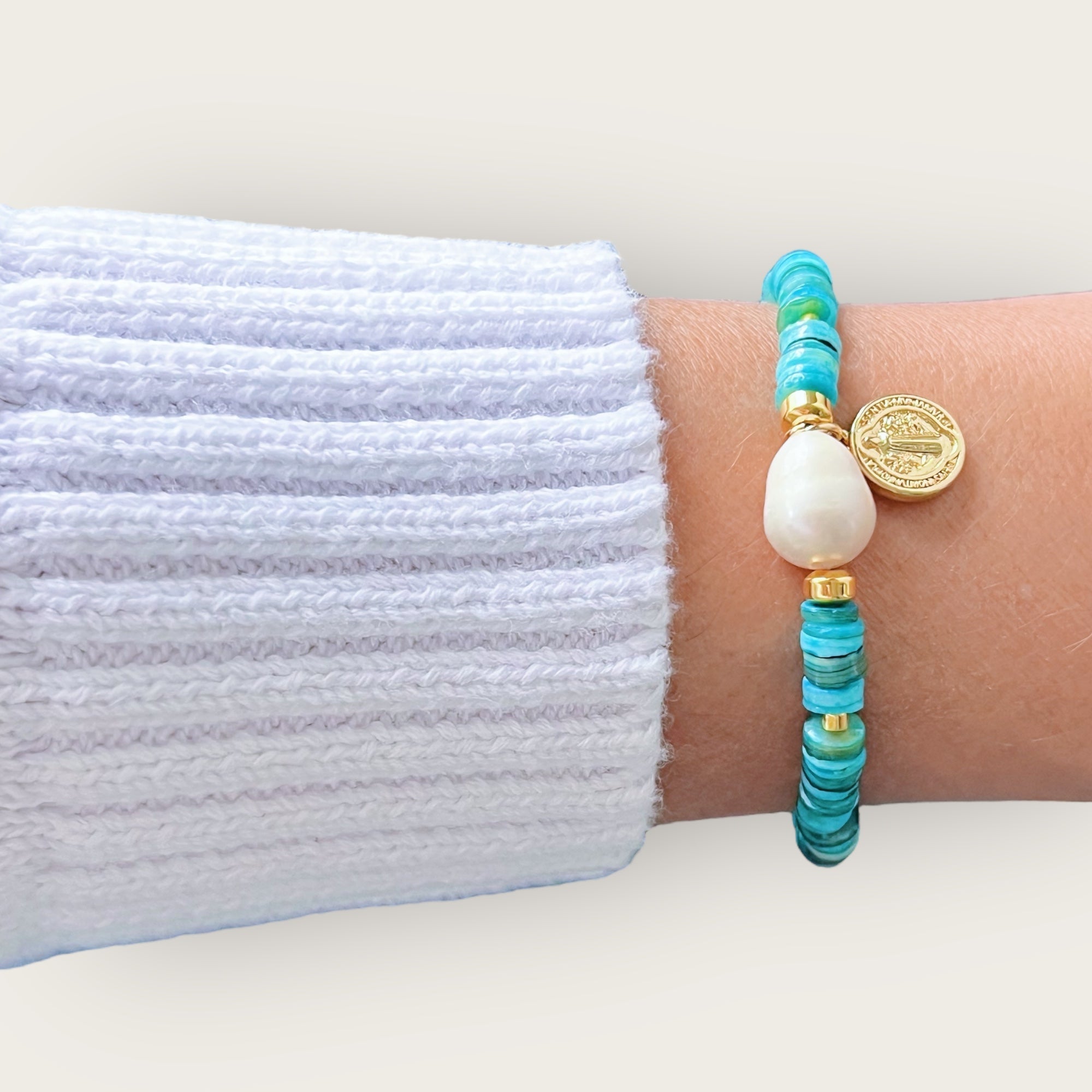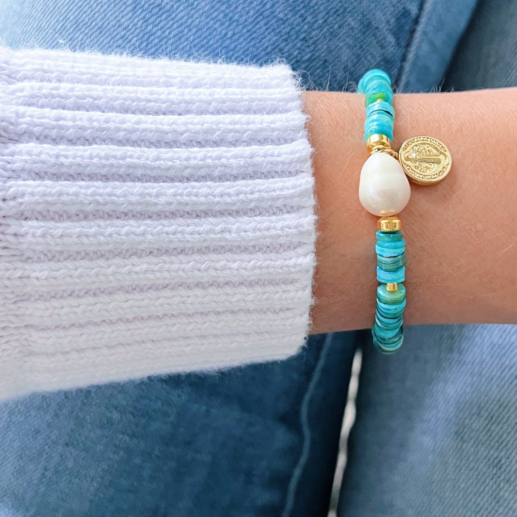 This one-of-a-kind bracelet blends spiritual symbolism with ocean-inspired beauty. Featuring a genuine freshwater pearl, turquoise-toned beads, and a Saint Benedict charm, it’s designed to offer both style and protection in every wear.