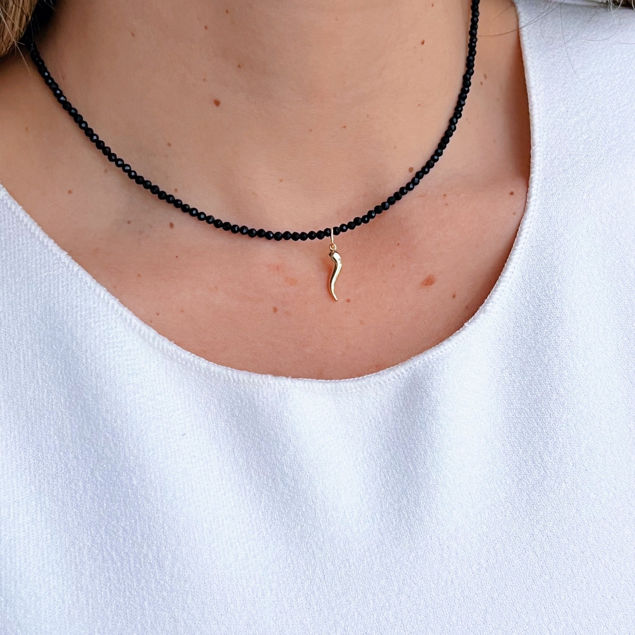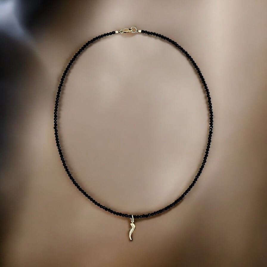 Good Luck & Protection - Black Spinel Necklace with 14K Solid Gold Cornicello