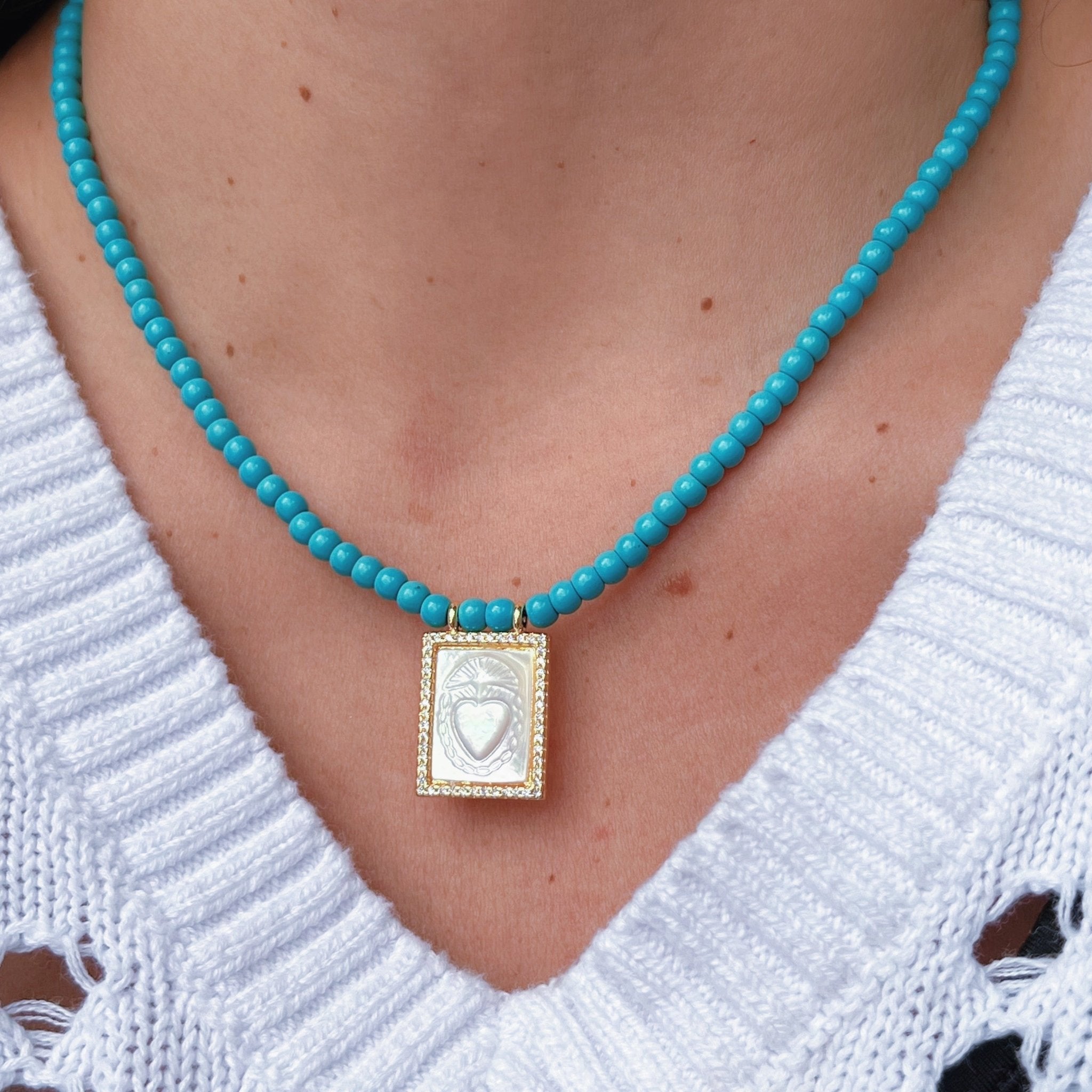 A meaningful necklace that carries a deep spiritual message. This handmade piece features a turquoise beaded strand and a radiant mother of pearl Sacred Heart of Jesus framed with sparkling cubic zirconia. The Sacred Heart represents divine love, healing, and unwavering protection — a powerful reminder of faith and inner peace.