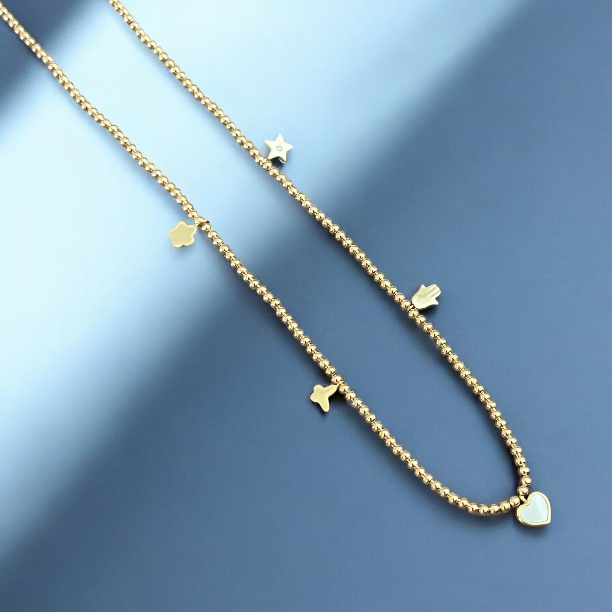 This delicate necklace brings together five meaningful charms to brighten your path and lift your spirit. Each symbol is a reminder of joy, love, protection, and magic. Wear it to invite light into every moment — and feel beautifully aligned with your own essence.