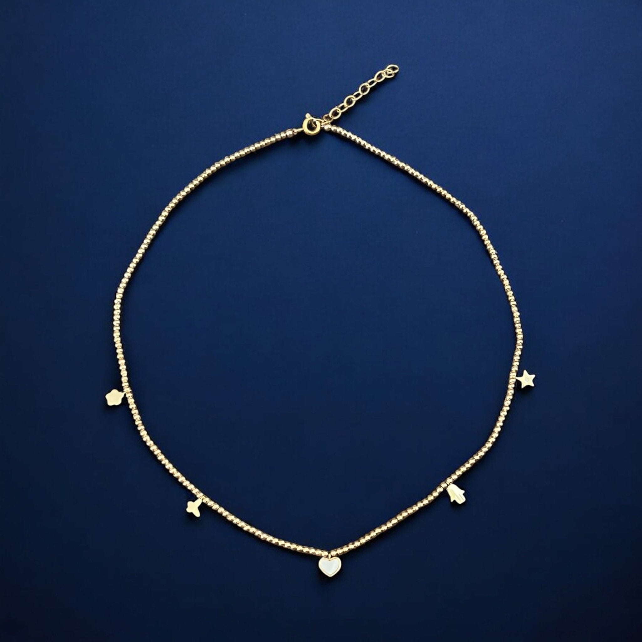 • Charms: flower 5 mm, butterfly 5 mm, mother of pearl heart 6 mm, cz star 5 mm, hamsa hand 5 mm.