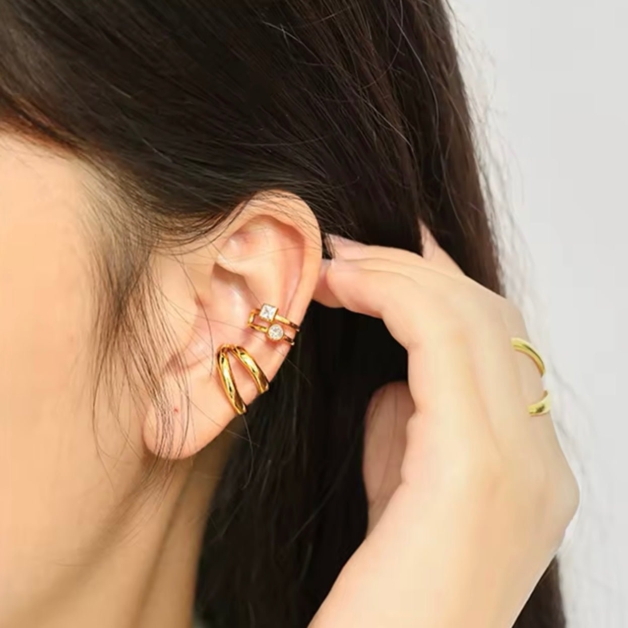 Add a modern twist to your jewelry collection with our CZ Geometric Ear Cuff. Featuring a sleek double-layered design adorned with a round and a square cubic zirconia, this piece radiates minimalist sophistication. Crafted from 18k gold-plated over 925 sterling silver, it offers a timeless shine and hypoallergenic comfort. Its compact size (1.2 cm approx.) ensures a snug yet elegant fit, perfect for layering or wearing solo for a subtle statement.