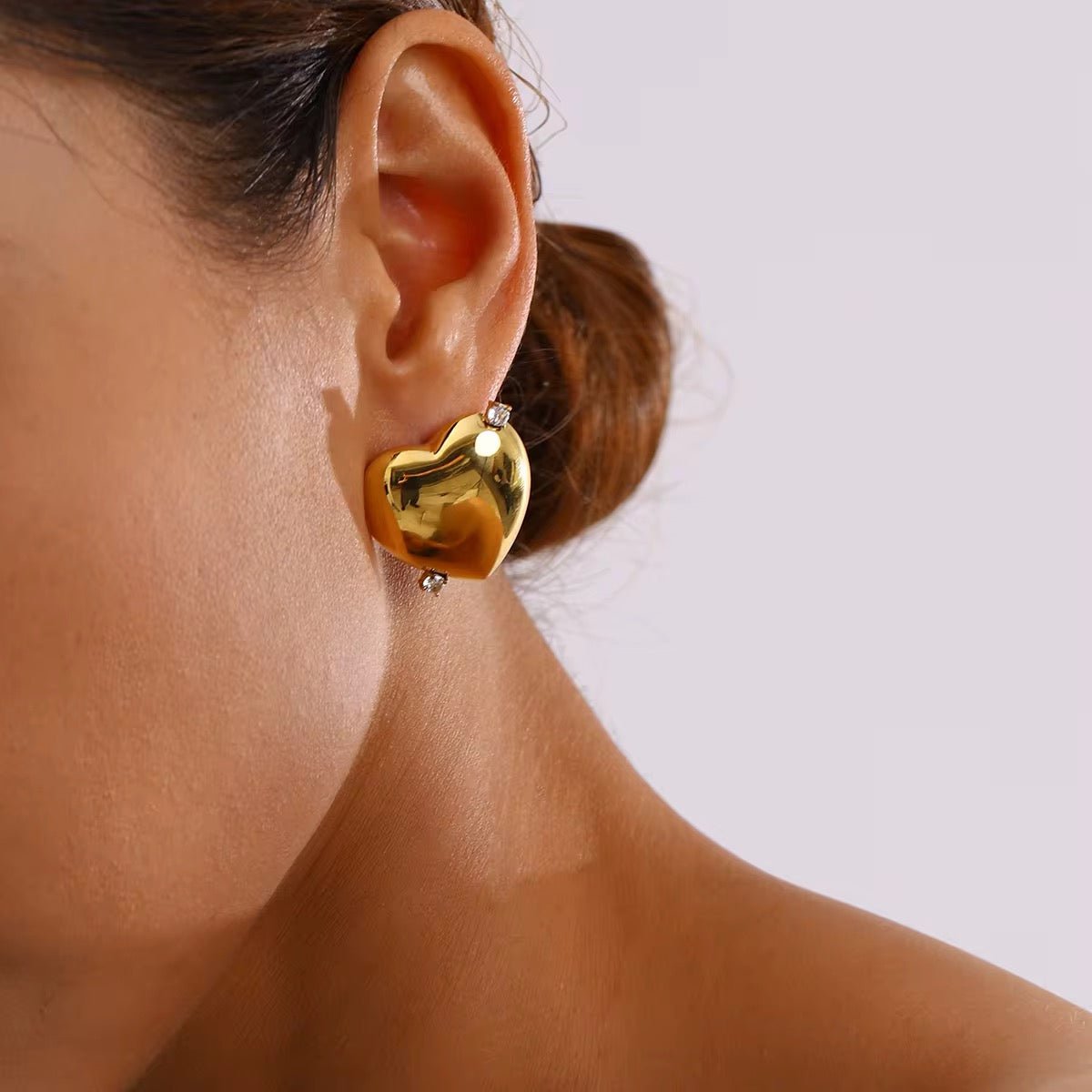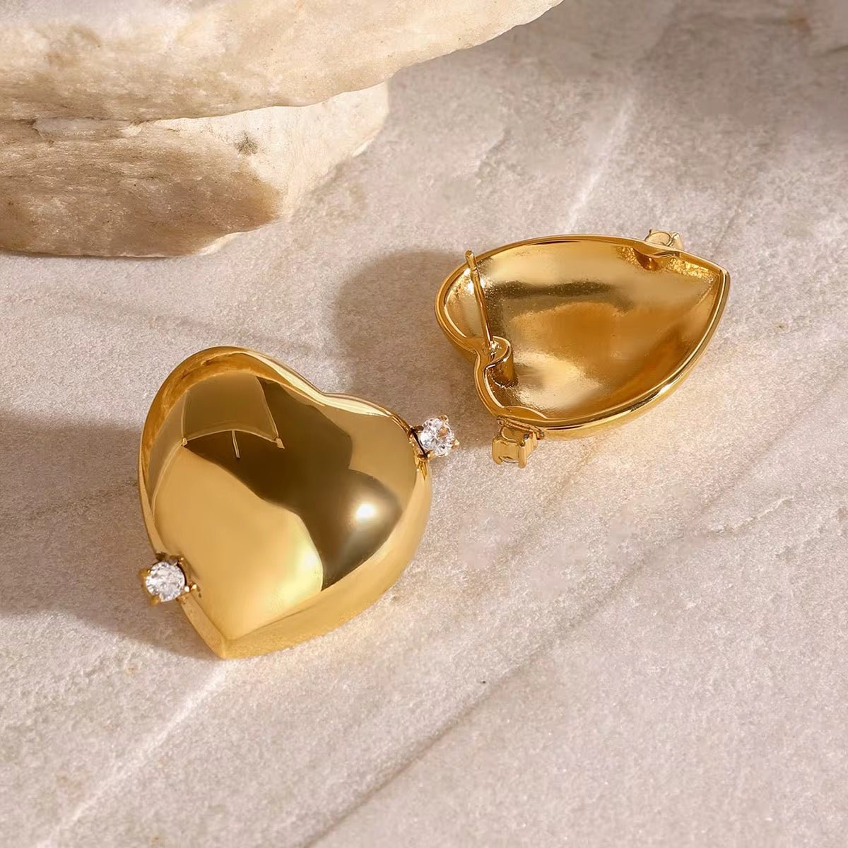 Add a touch of elegance and sparkle to your look with our Gold Cz Heart Earrings. Crafted from 18k gold plated over stainless steel, these earrings feature a stunning heart-shaped charm adorned with dazzling cubic zirconia stones. Perfect for dressing up your everyday style or complementing formal attire, they offer a lightweight, comfortable fit for all-day wear. A timeless design that makes a thoughtful gift for someone special or a beautiful addition to your jewelry collection.