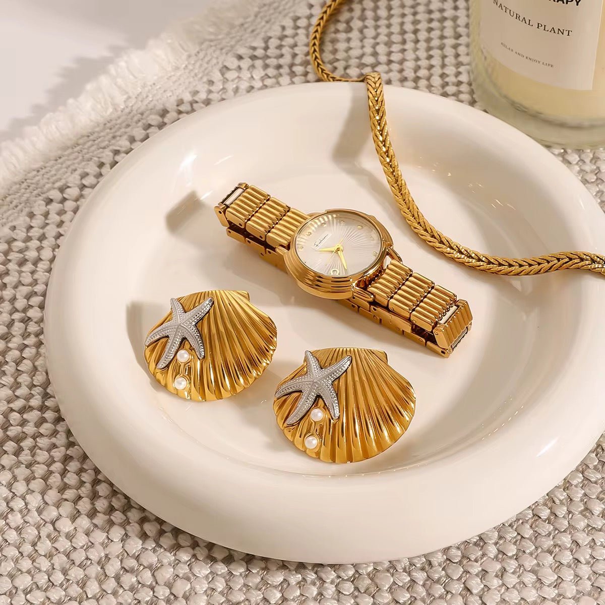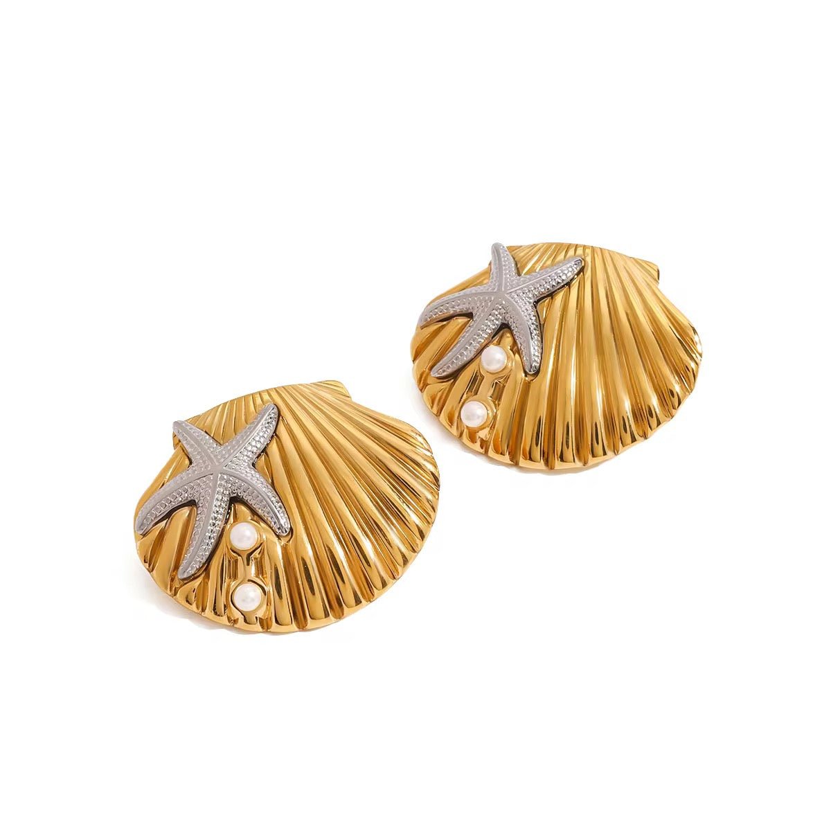 Embrace the beauty of the sea with these stunning Gold Seashell Earrings featuring a charming Silver Starfish accent. The two-tone design combines the warm glow of gold with the cool elegance of silver, creating a perfect balance between sophistication and playful beach vibes. Whether you're strolling along the shore or adding a coastal touch to your evening look, these earrings will elevate your style with a touch of nature’s beauty. A must-have for any ocean lover, these earrings will become a timeless part of your collection.