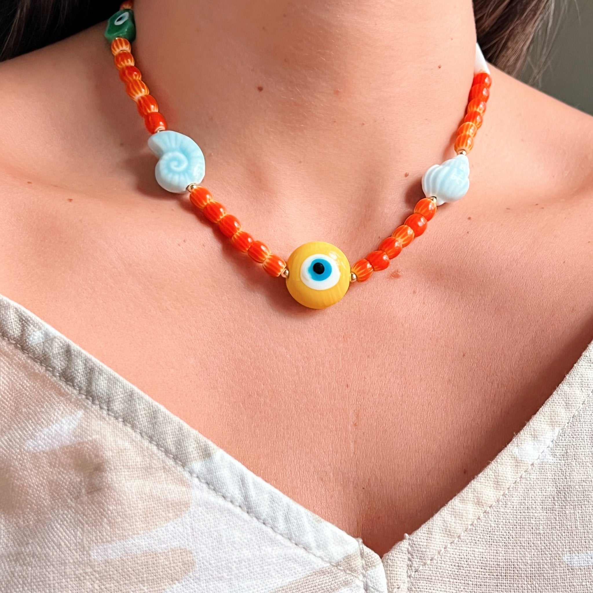 A vibrant talisman designed to energize your spirit while keeping your energy shielded. This one-of-a-kind necklace features a powerful yellow Murano evil eye for joy and protection, ceramic seashells for emotional healing, and accent beads in fiery orange to awaken vitality. Every element is symbolic, handcrafted, and charged with intention.