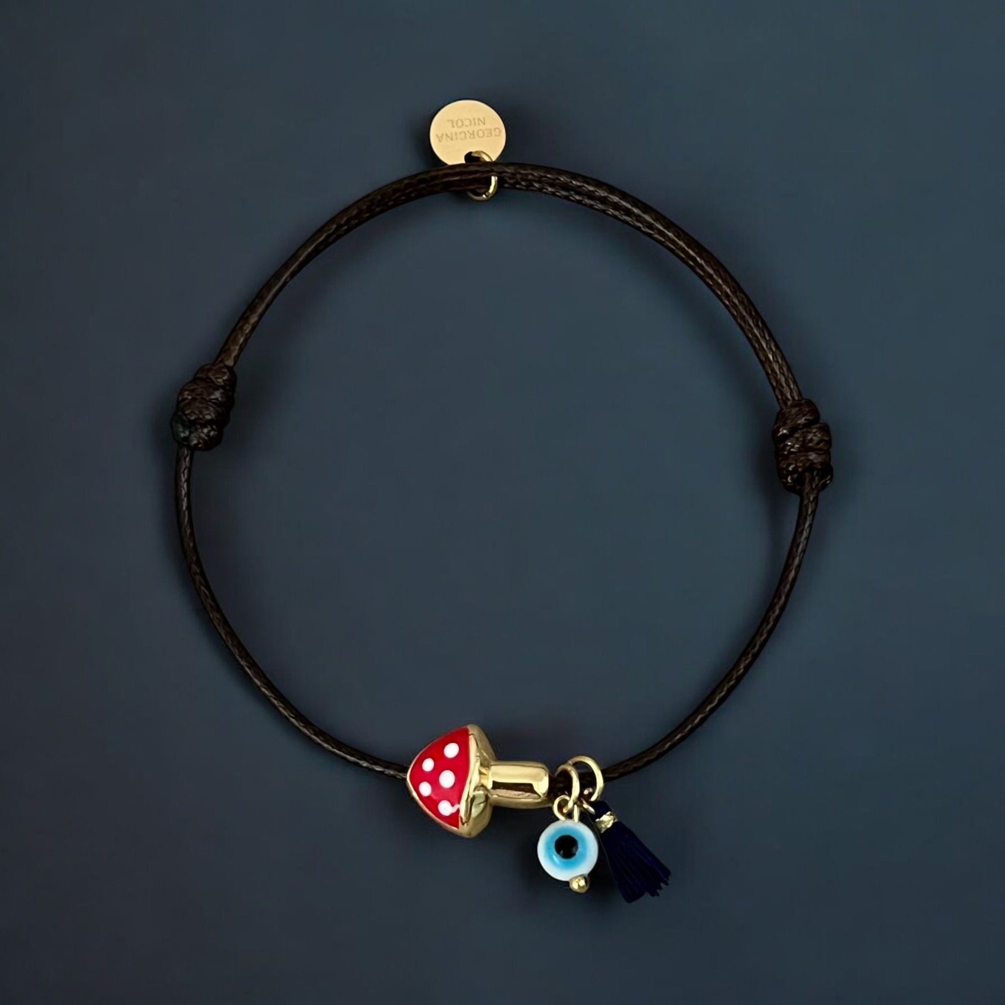 This playful yet symbolic bracelet combines three powerful charms: the red mushroom, a sign of luck and vitality; the evil eye bead, a timeless protector against negativity; and the blue tassel, a touch of energy and joy. Designed with a dark adjustable cord and gold-plated details, it’s a chic way to carry protection and good fortune wherever you go.