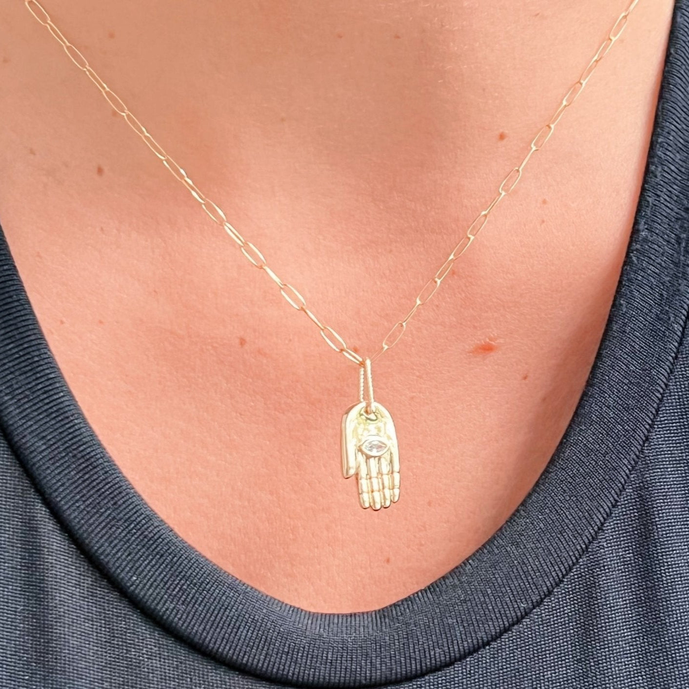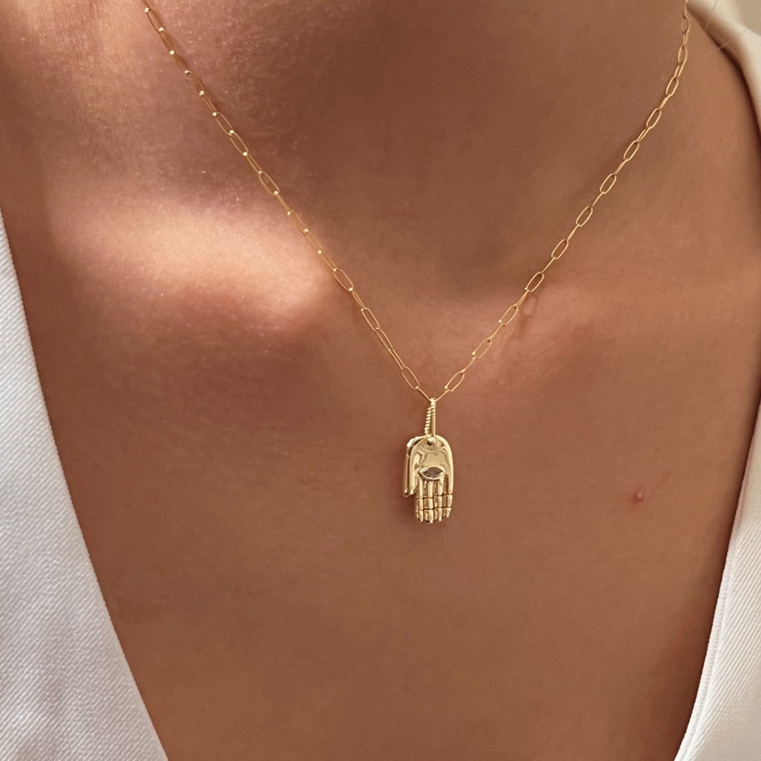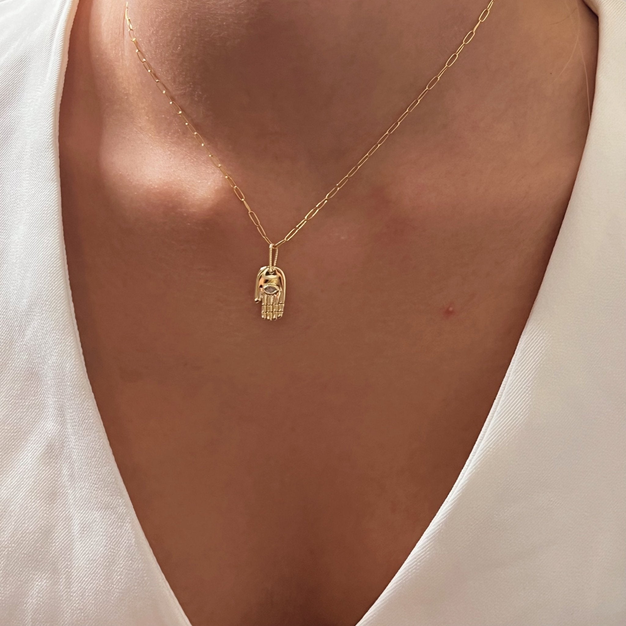 The Hamsa is a powerful symbol of divine protection, intuition, and balance. This version, crafted in Italy 925 sterling silver and set with a CZ stone in the center, is a modern amulet designed to elevate your everyday. The gold filled paper clip chain adds a sleek and contemporary finish — one that holds meaning without saying a word.