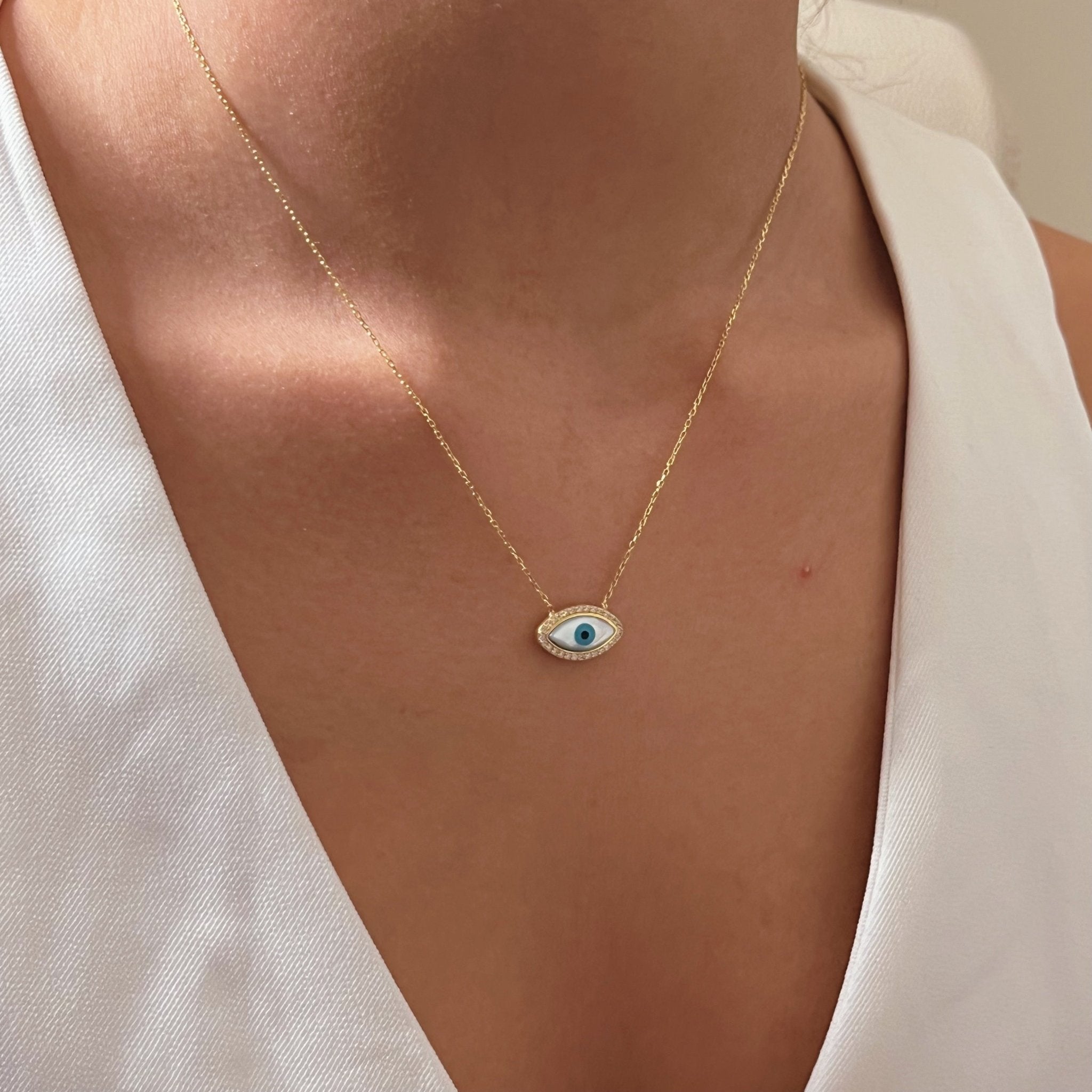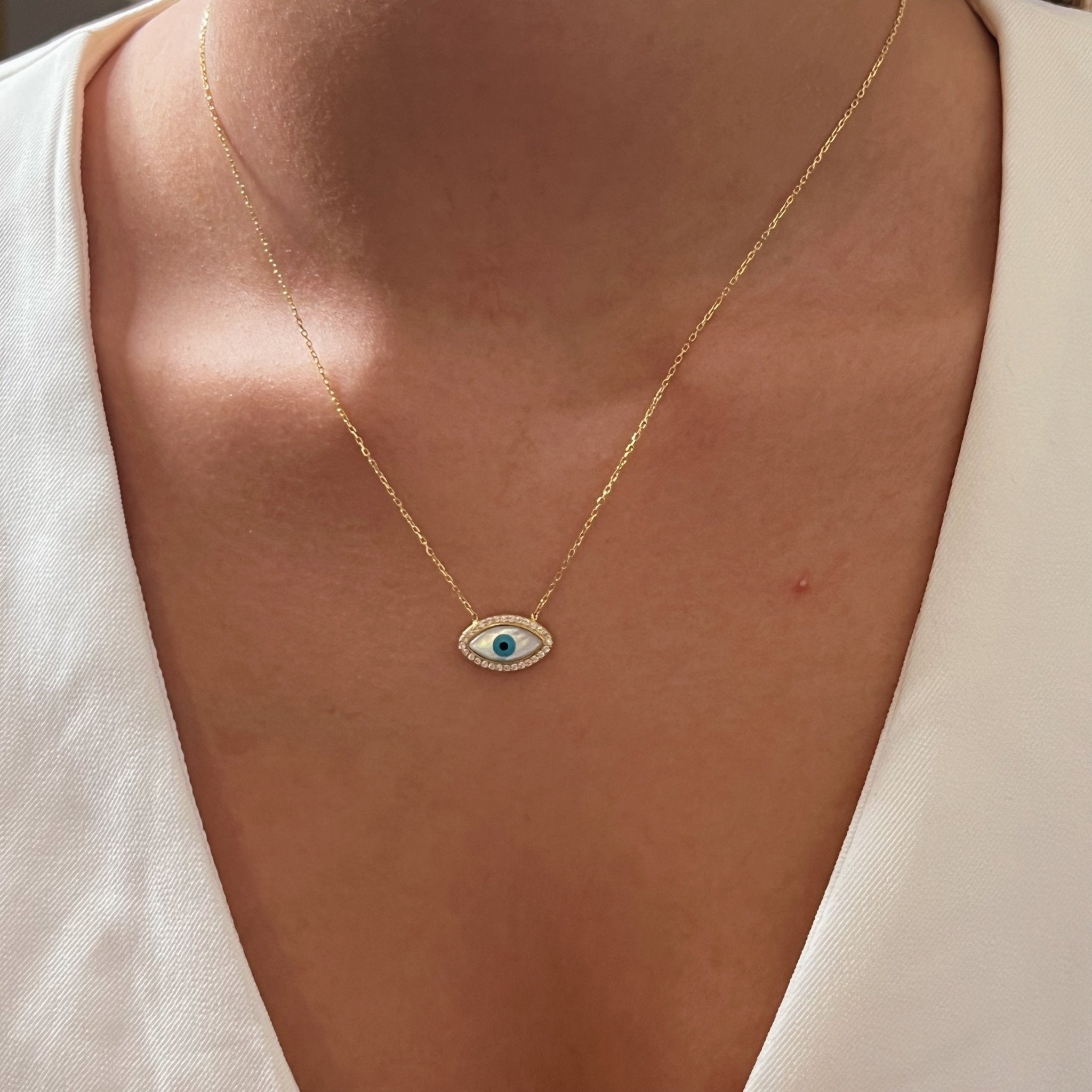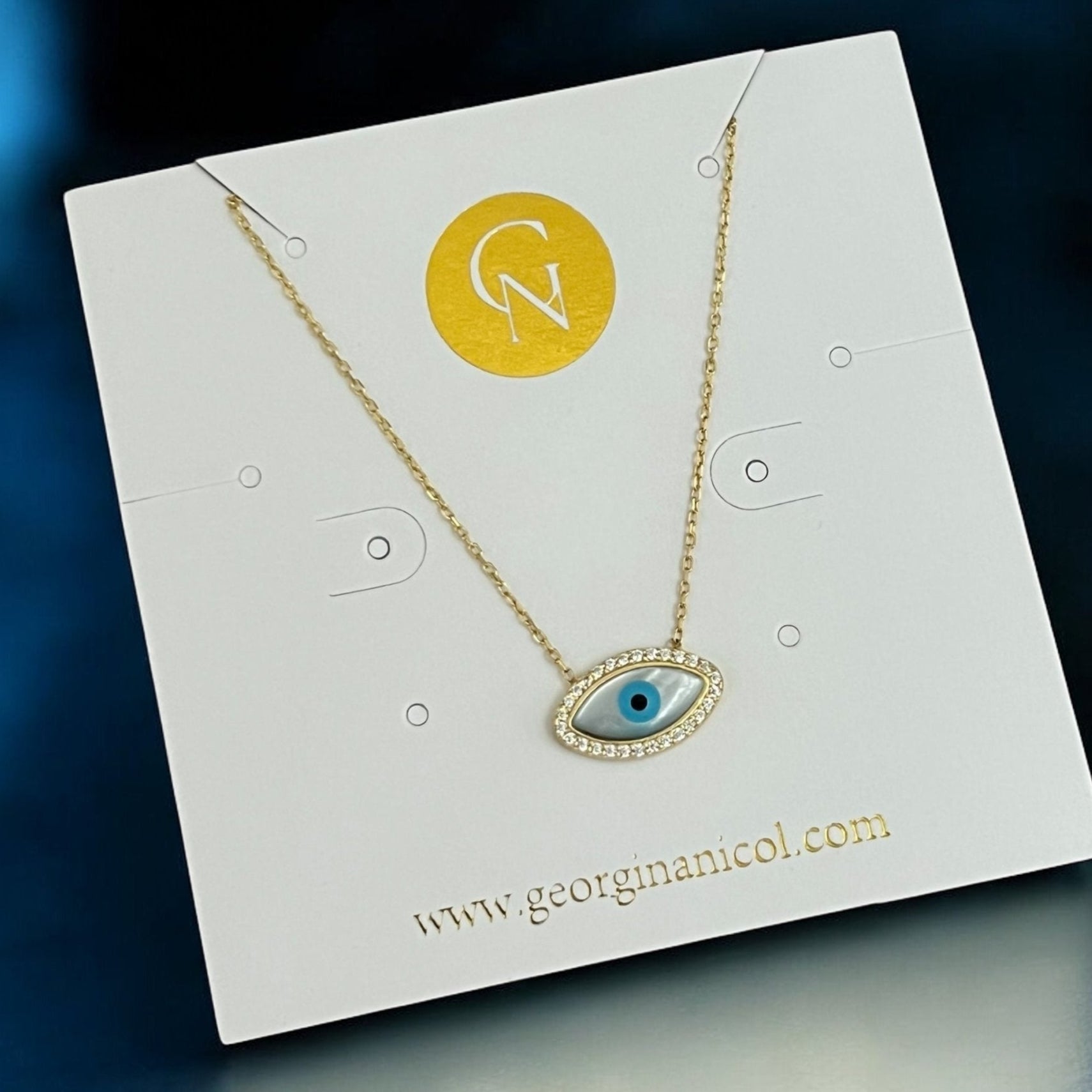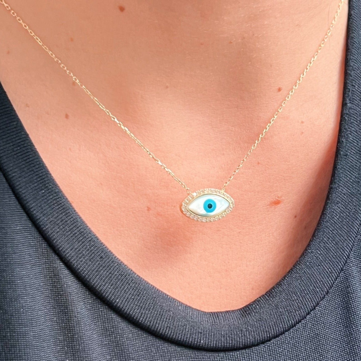 This elevated take on the classic evil eye blends meaning and elegance in one radiant piece. The mother-of-pearl center symbolizes clarity and calm, framed by CZ stones for a subtle sparkle. Designed to protect your energy while enhancing your everyday layers with refined beauty.