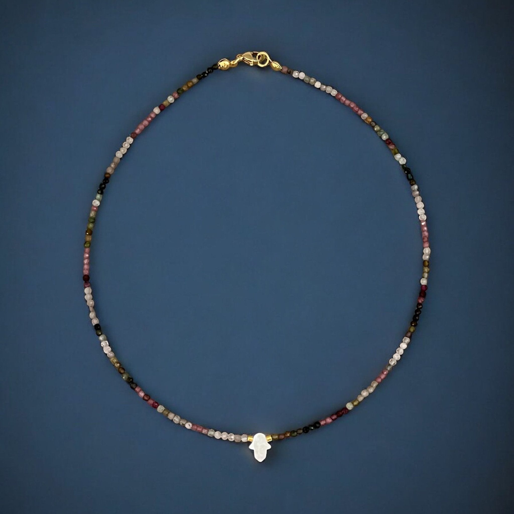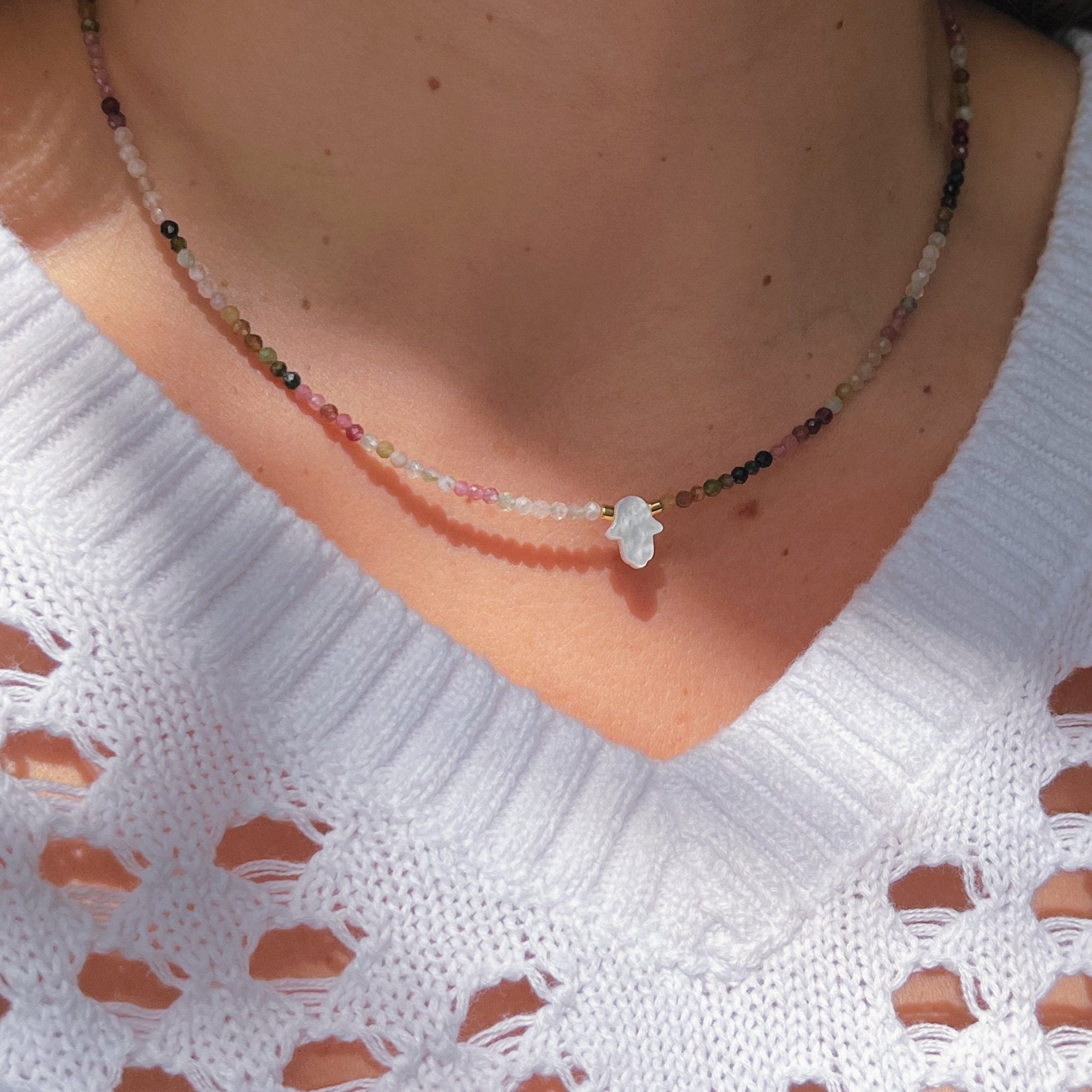This delicate tourmaline gemstone necklace combines the energy of love, emotional balance, and spiritual protection. The Mother of Pearl Hamsa hand adds a timeless symbol of blessings and good fortune, making it a meaningful piece to wear every day.
