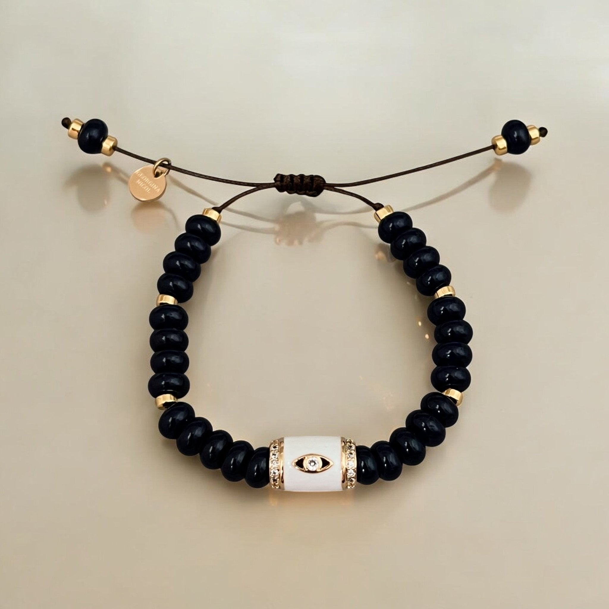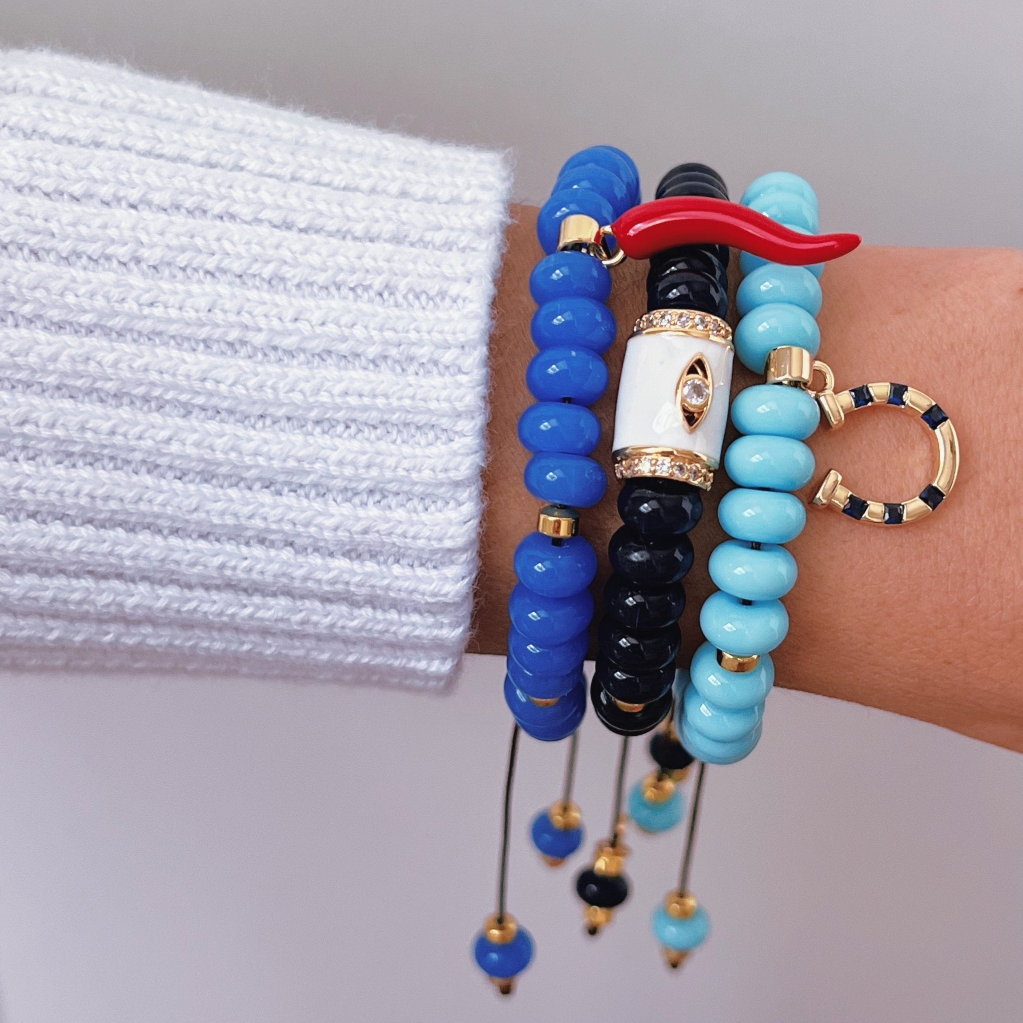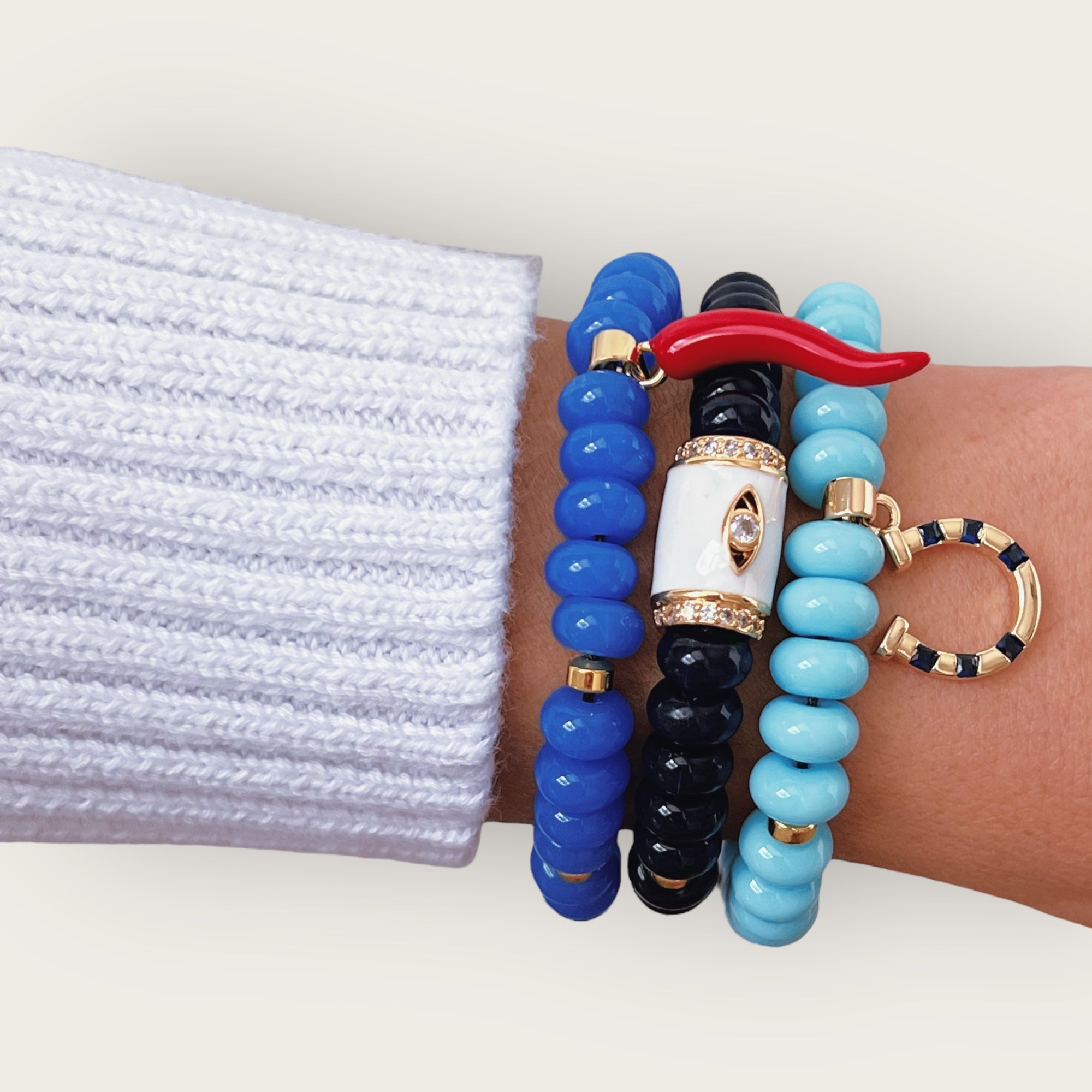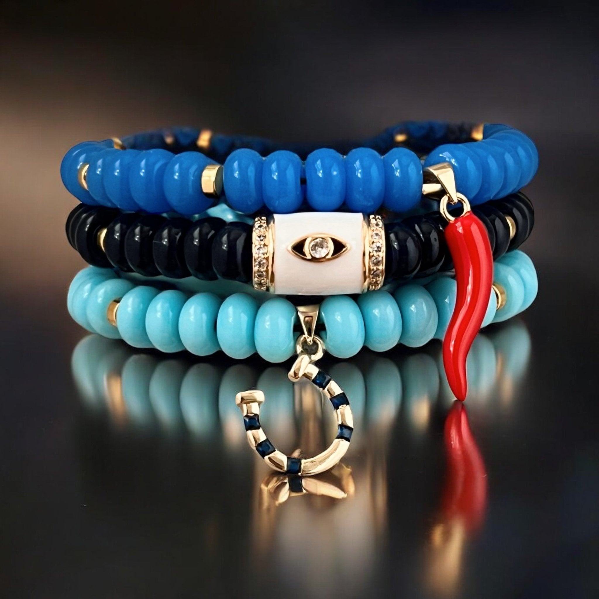 This limited edition set of three bracelets is crafted to be worn together as a talisman of personal power. Each charm symbolizes a sacred force: protection, good luck, and energetic clarity. The deep, layered blues evoke wisdom and calm, while the charms activate a magnetic field of positive outcomes. Designed to be meaningful, bold, and unmistakably yours.