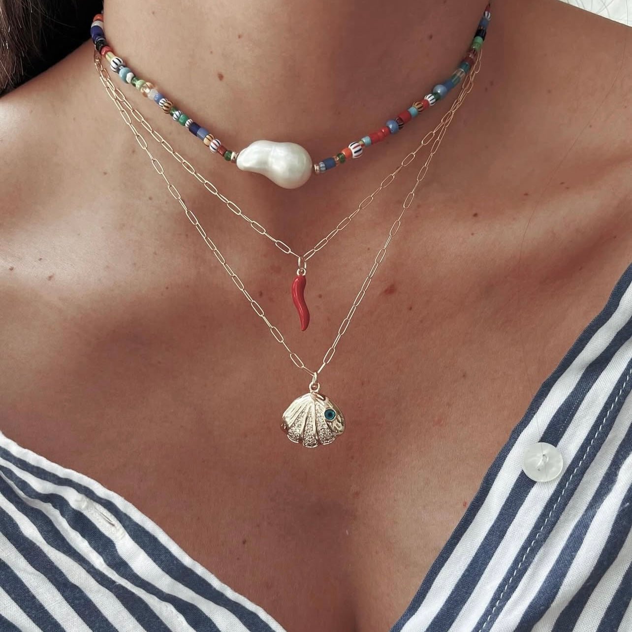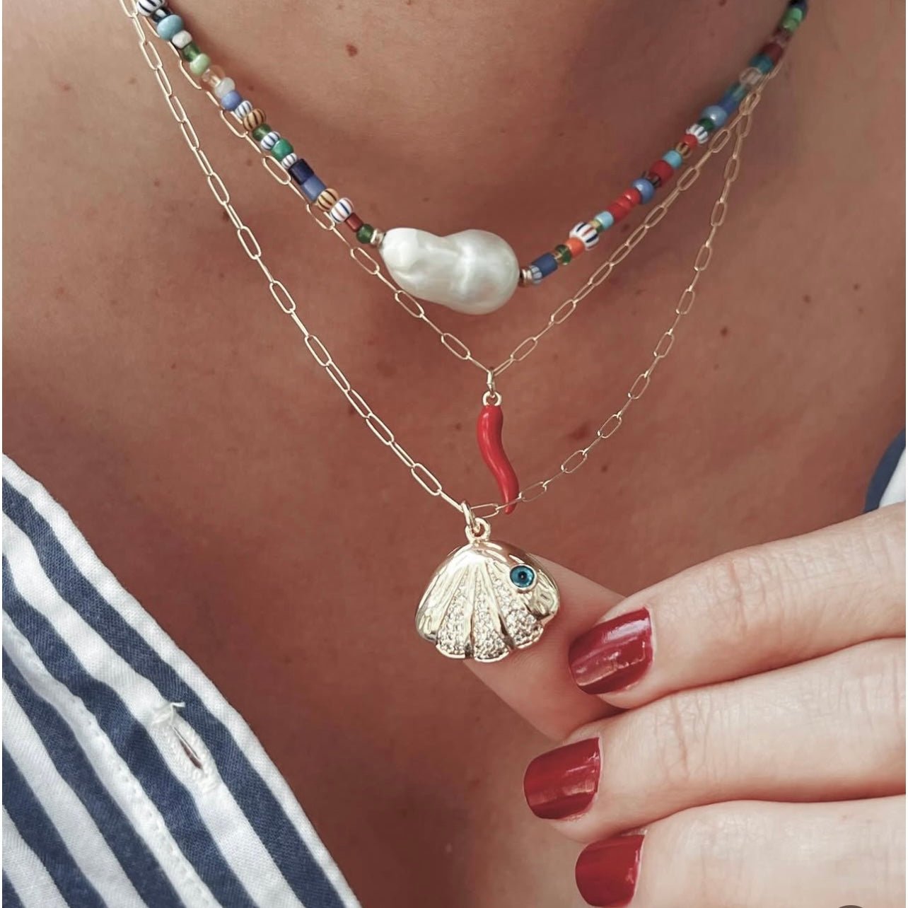 This necklace is more than a beachy statement — it’s a daily reminder that you are always protected and aligned with the flow of life. The seashell, symbol of intuition and feminine energy, meets the evil eye, guardian of your peace. Lightweight, luminous, and made to empower.