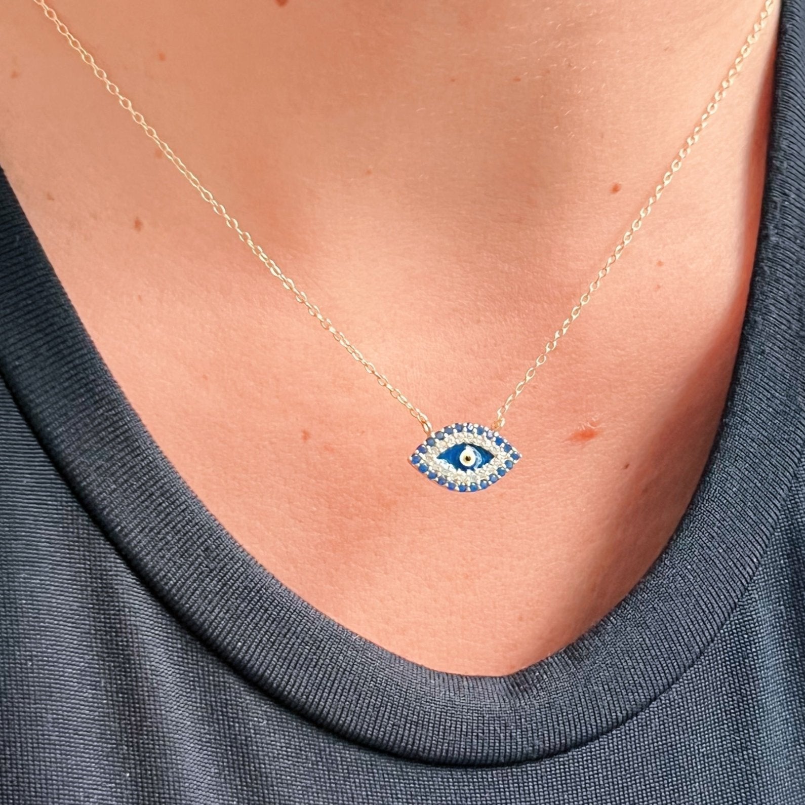 • Charm: 1.5 cm evil eye with blue and clear CZ stones