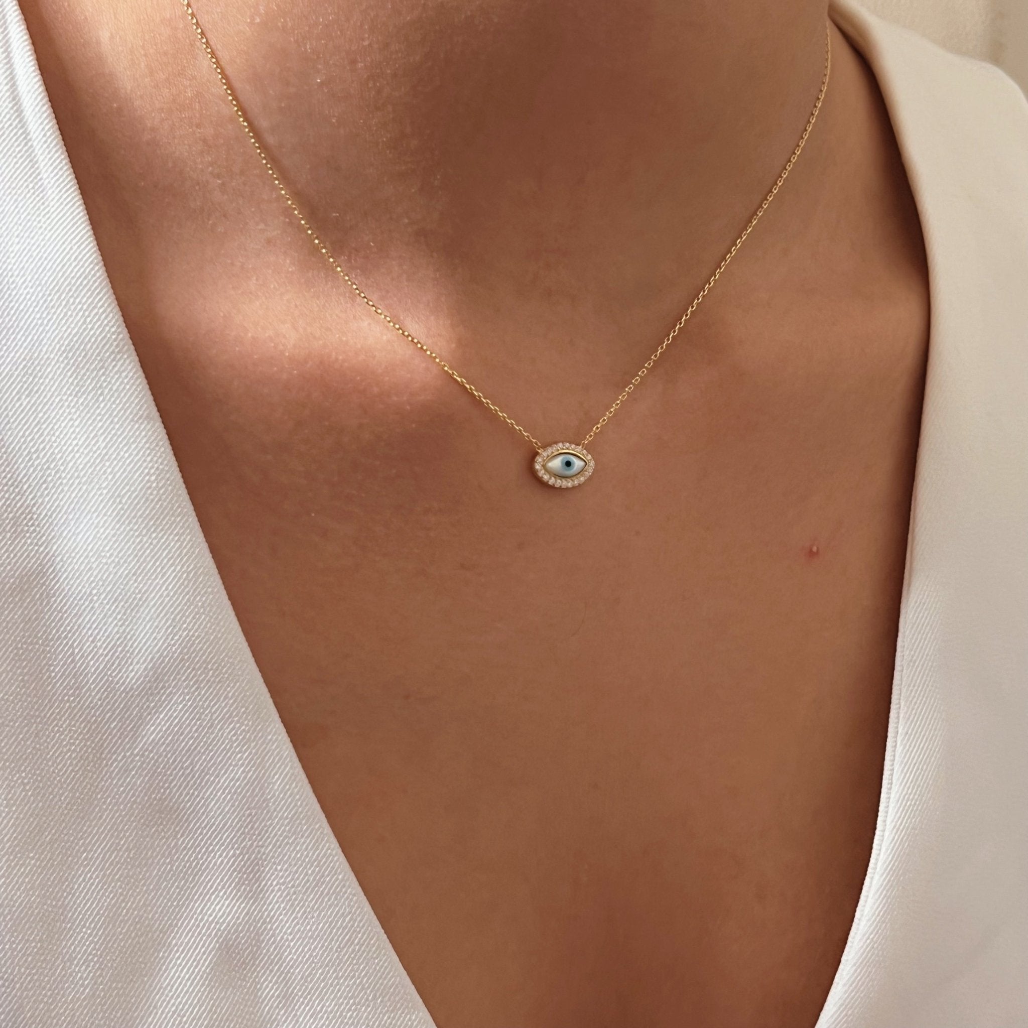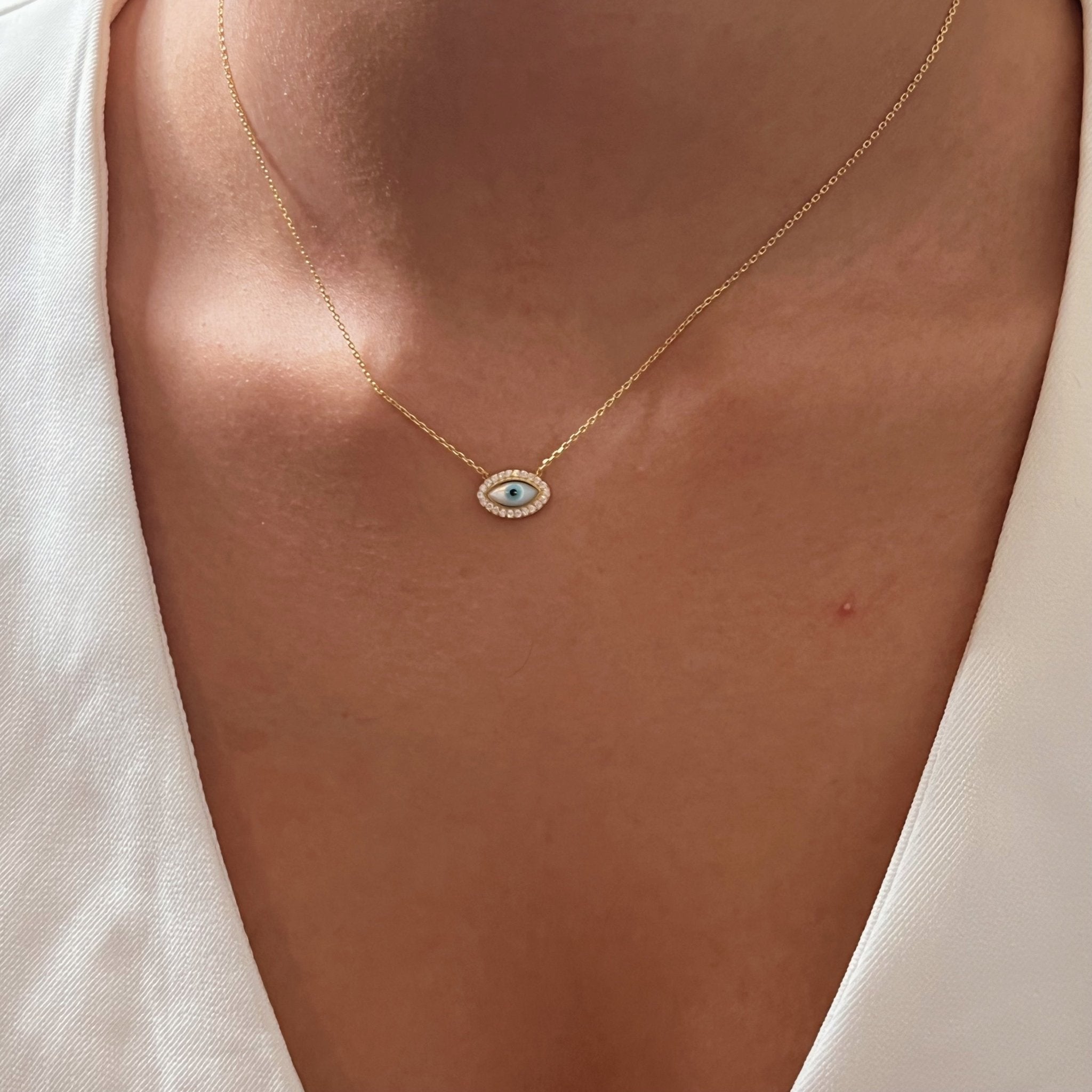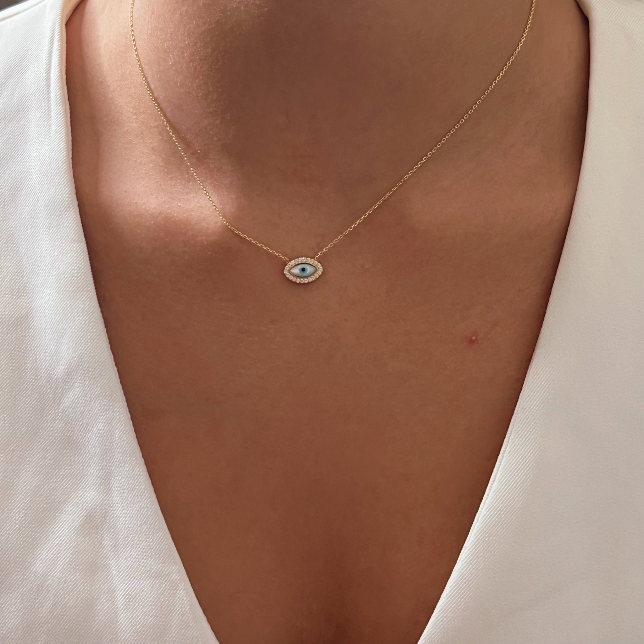 Small in size but rich in symbolism, this necklace features a mother-of-pearl evil eye framed by CZ stones — a modern talisman for spiritual protection and clarity. Designed to be worn with purpose, it shields your energy while adding a soft yet meaningful statement to your everyday style.