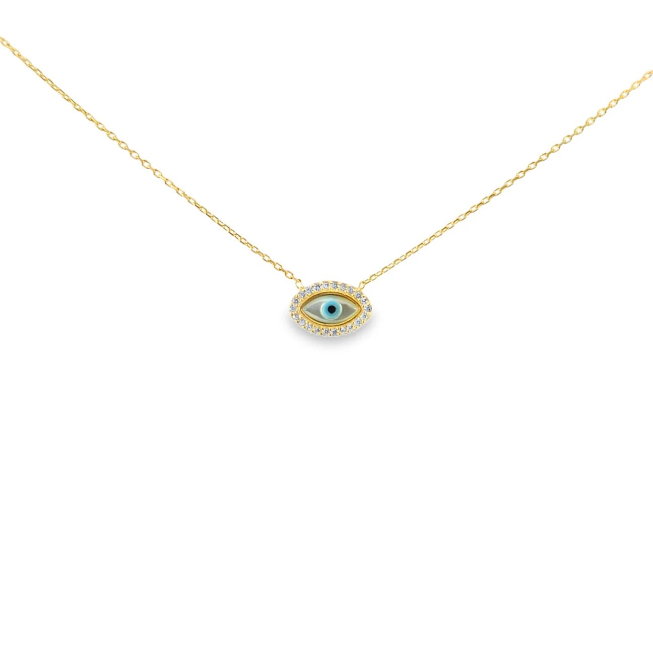 • Charm: 1.2 cm width x 0.8 cm height, mother-of-pearl evil eye with CZ border