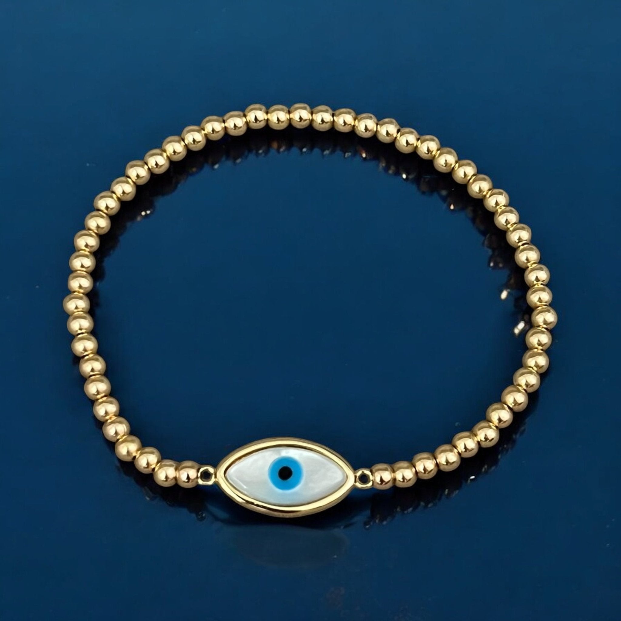 This bracelet blends symbolic protection with timeless elegance. The polished gold beads and the luminous mother of pearl evil eye create a delicate balance between style and intention. A daily reminder that beauty and protection can walk hand in hand.