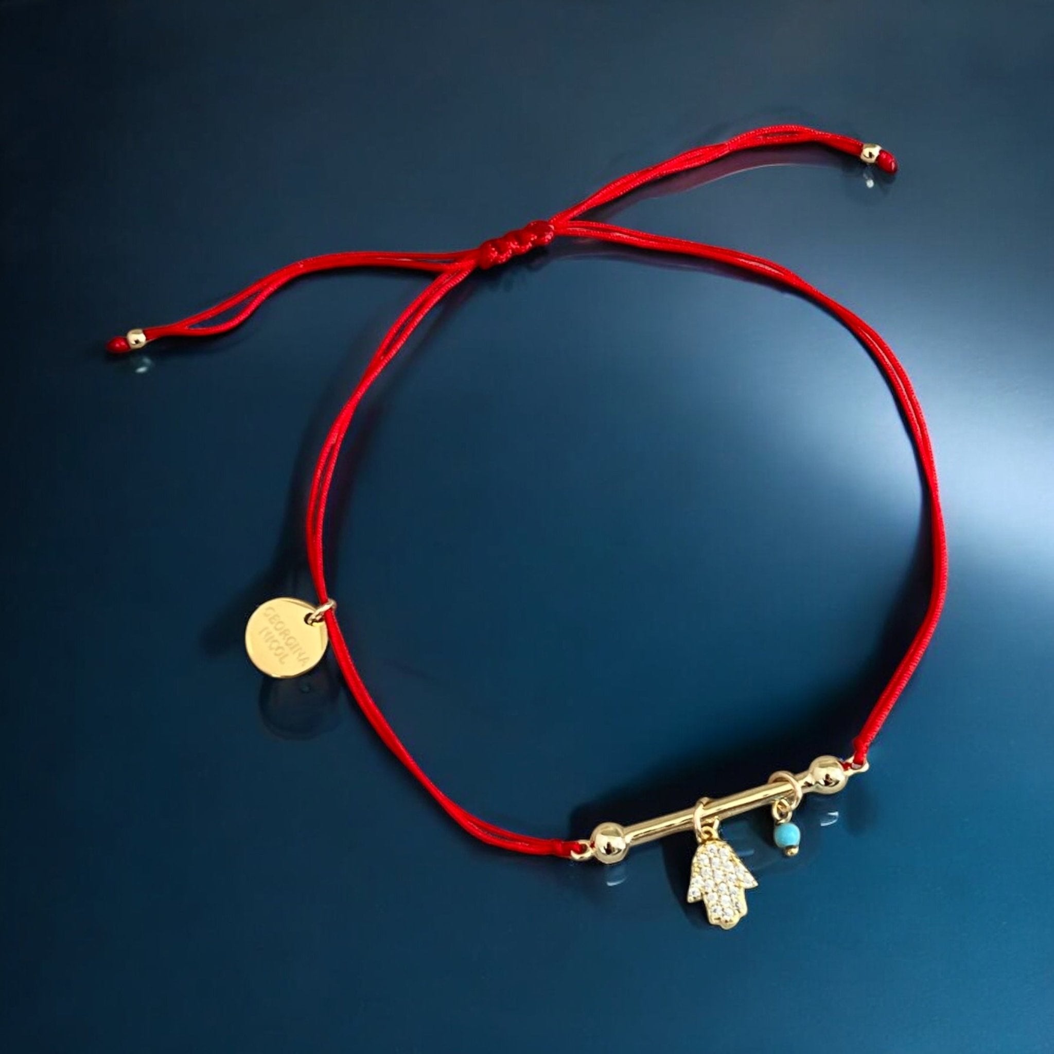 • Red string bracelet with CZ hamsa hand charm and blue bead