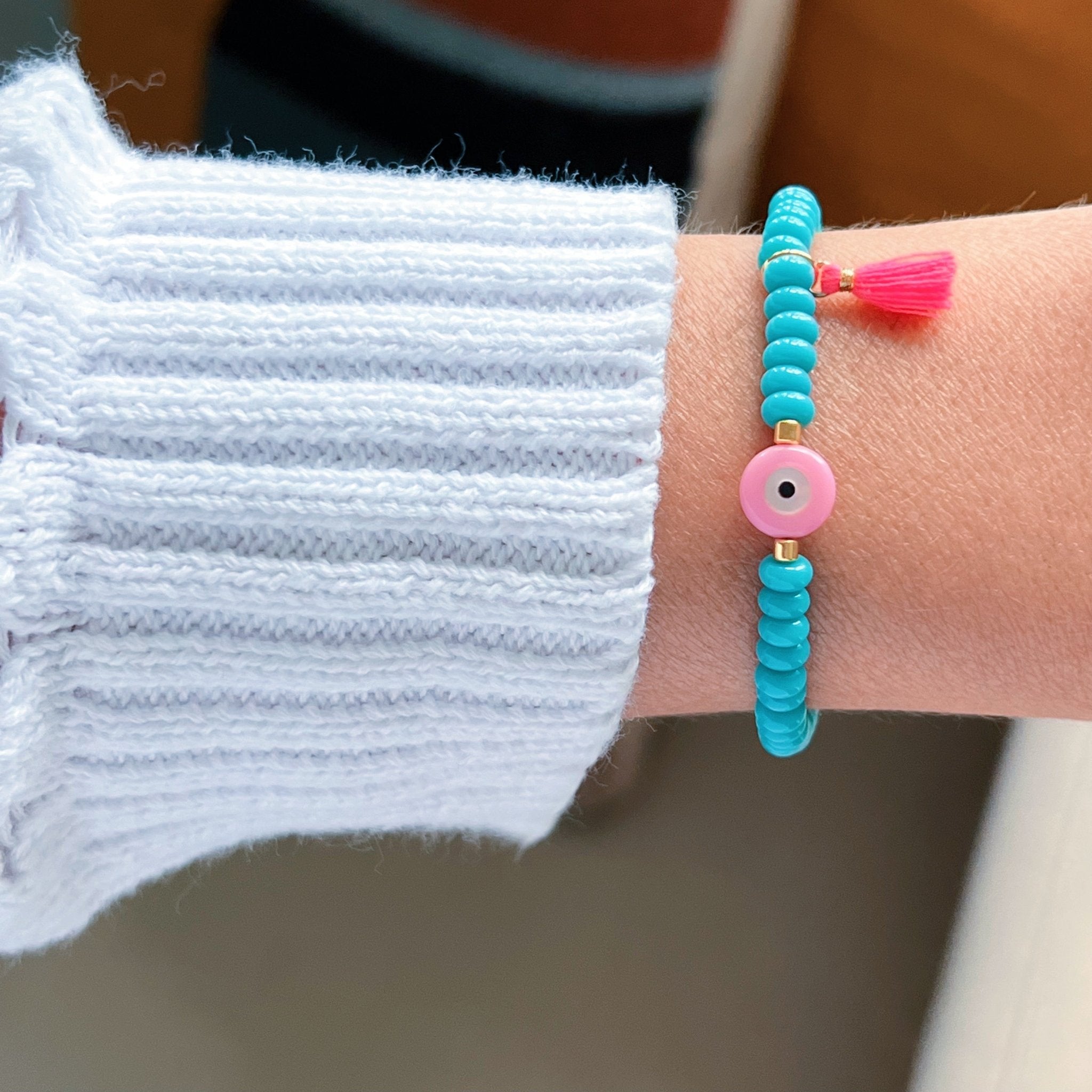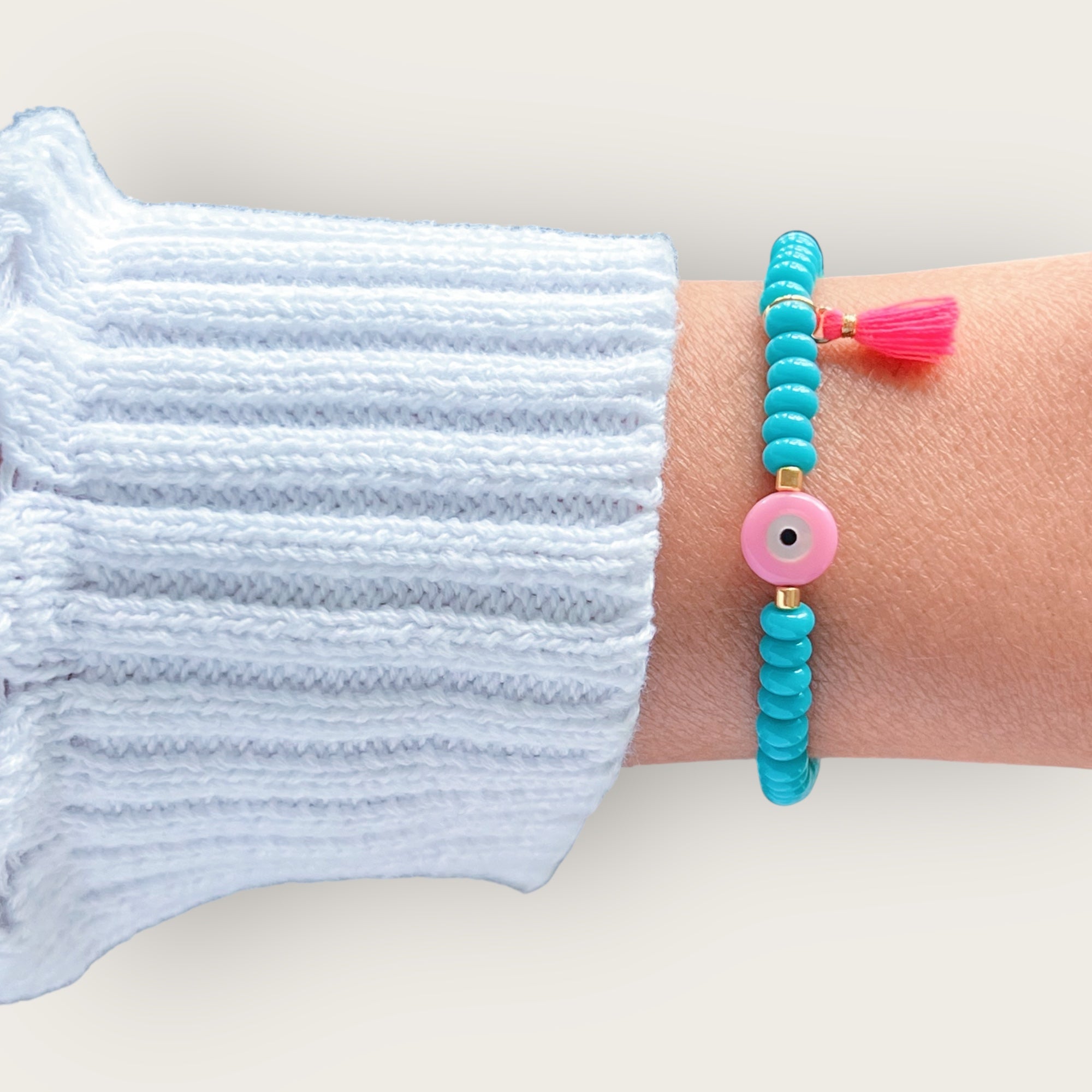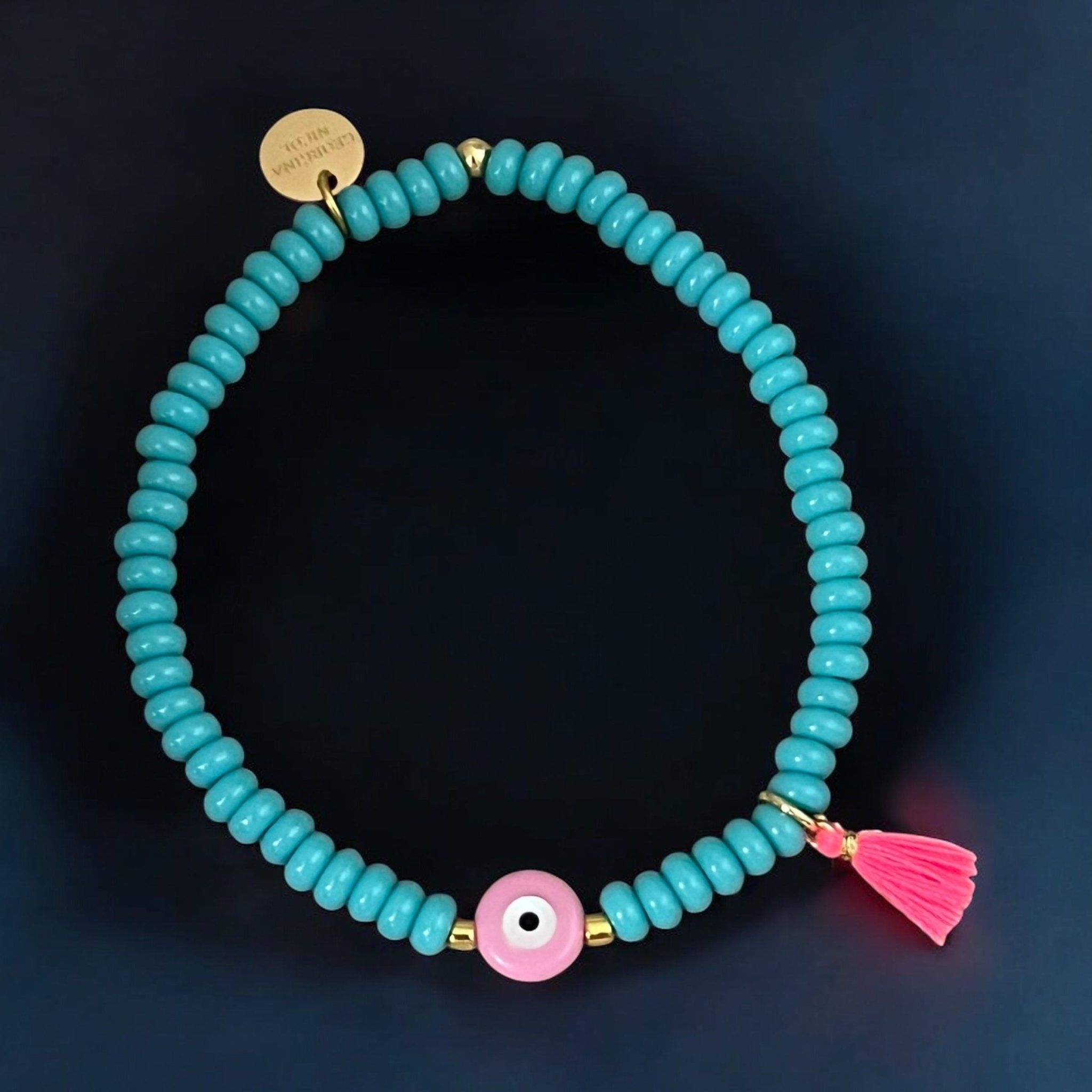 This one-of-a-kind bracelet combines turquoise-toned beads with a pink evil eye charm, creating a powerful symbol of clarity and protection. The tassel detail adds a playful touch, making it both meaningful and chic. Handmade with care, it’s adjustable for comfort and designed to be your everyday shield of positive energy.