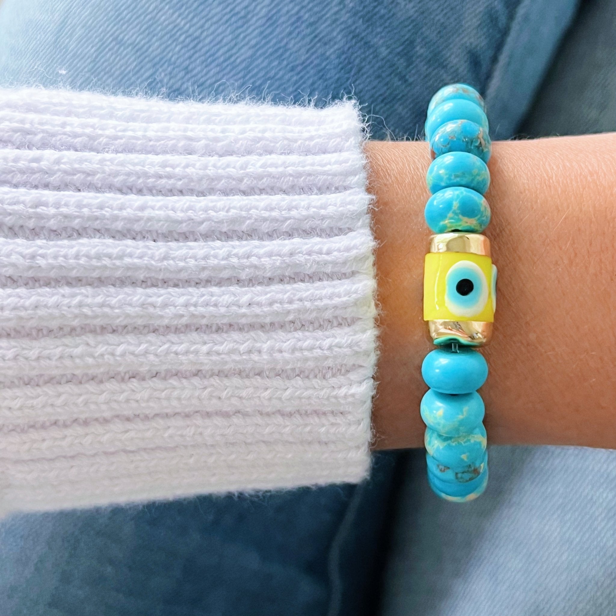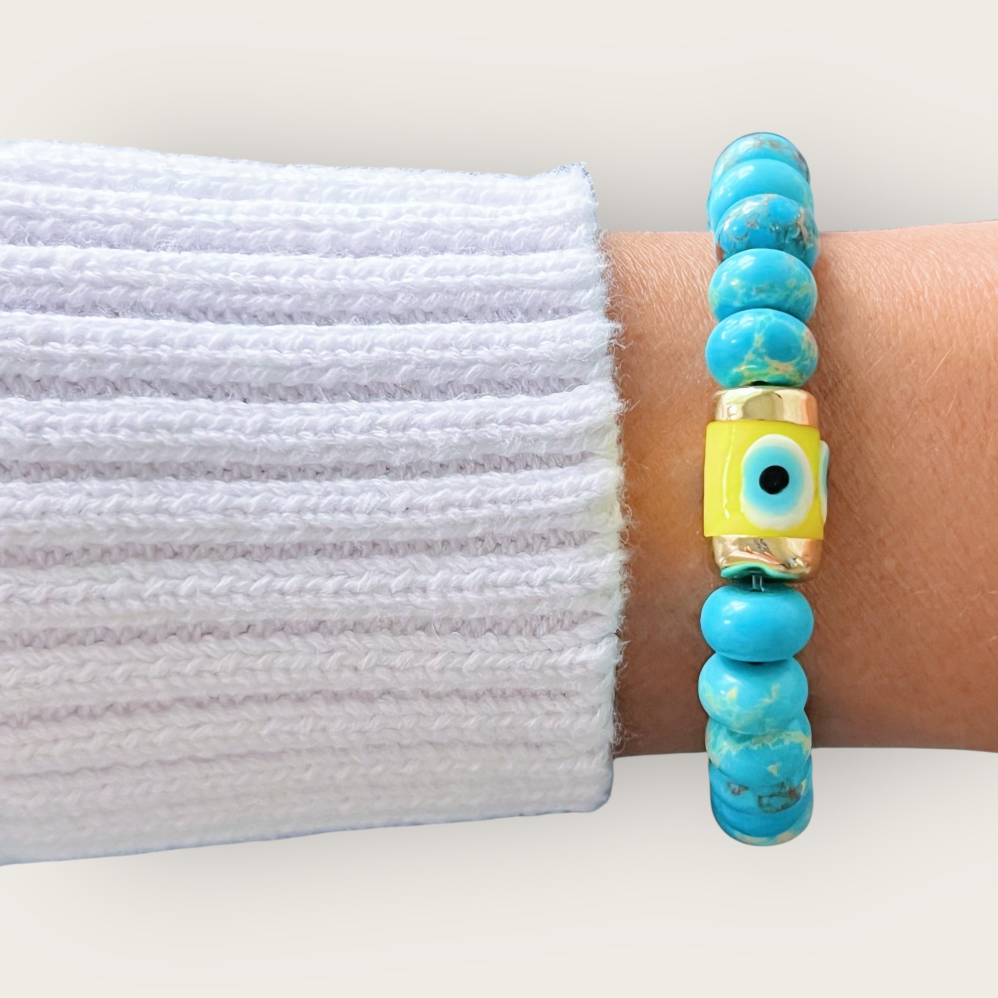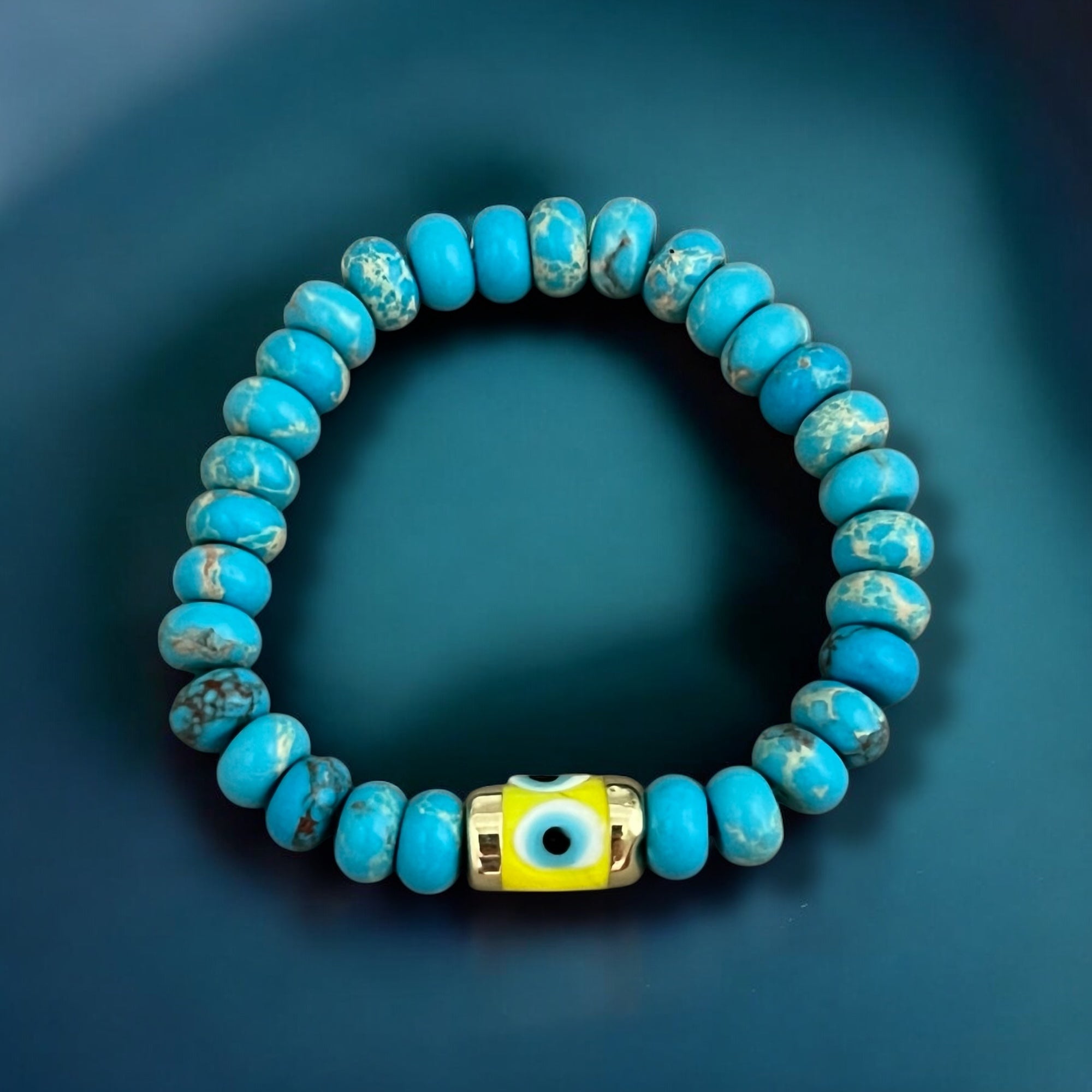This vibrant turquoise beaded bracelet is centered with a yellow evil eye bead, a symbol of clarity, protection, and positive energy. Designed to be worn daily, it serves as both a style statement and a meaningful reminder of your strength and vision.