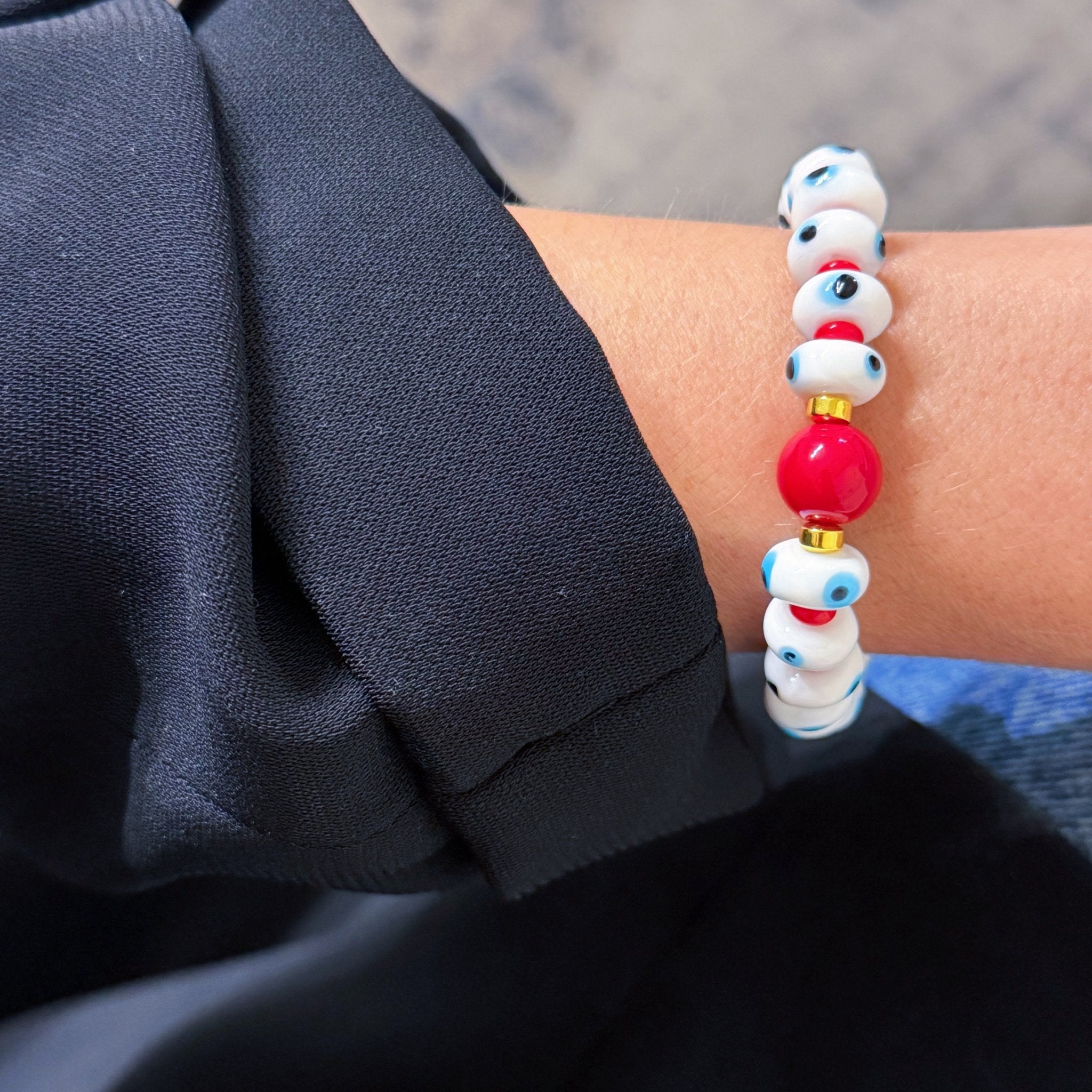 Handcrafted with Murano glass beads, this bracelet embodies the protective power of the evil eye — a timeless symbol believed to attract good fortune and repel negativity. Its bold red center bead and golden accents make it a meaningful statement piece designed to elevate your everyday stack.