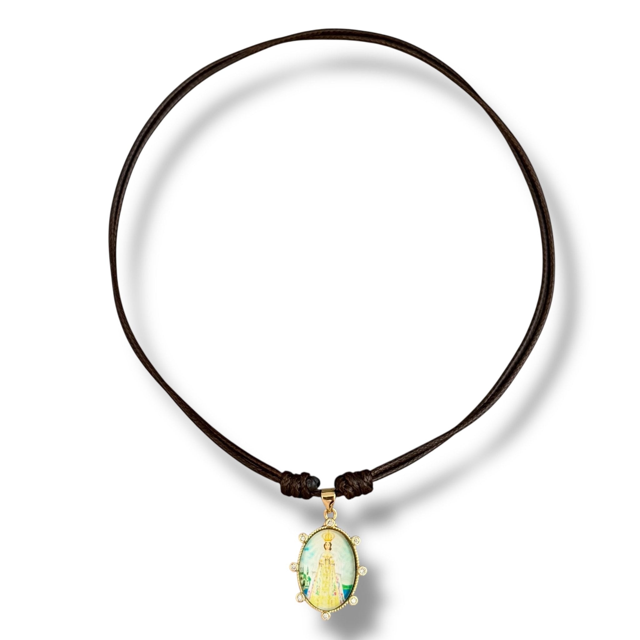 A meaningful necklace inspired by Del Valle Virgin, symbol of grace, hope, and protection. Designed with CZ details and an adjustable brown cord you can wear at your desired length, this piece carries a serene energy that uplifts your faith and spirit.