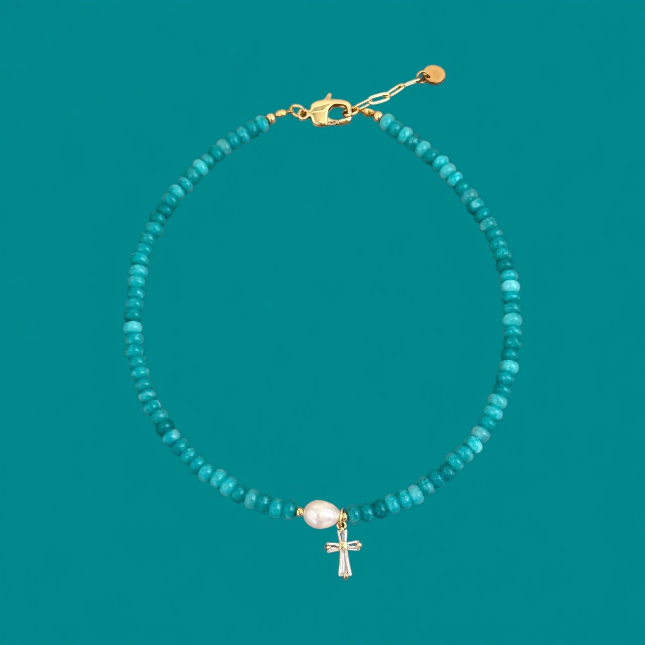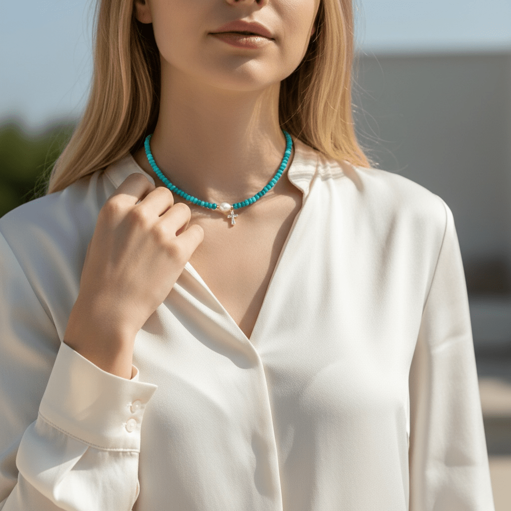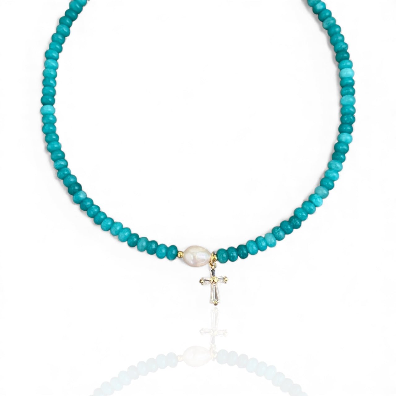 A refined beaded necklace designed with genuine freshwater pearls and a luminous cubic zirconia cross at the center. Its clean, polished look makes it perfect for layering or wearing on its own.