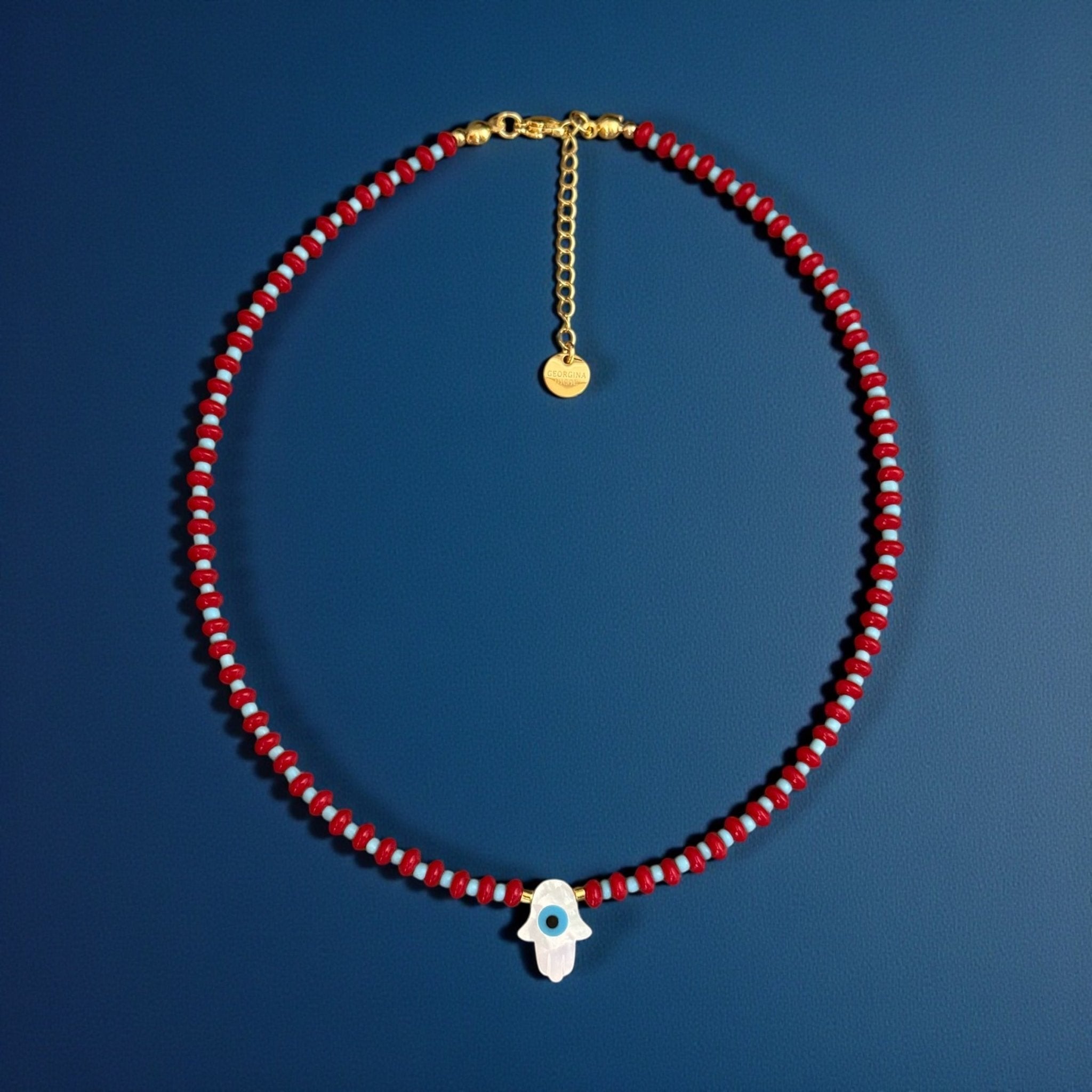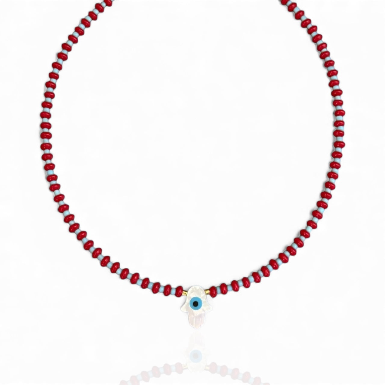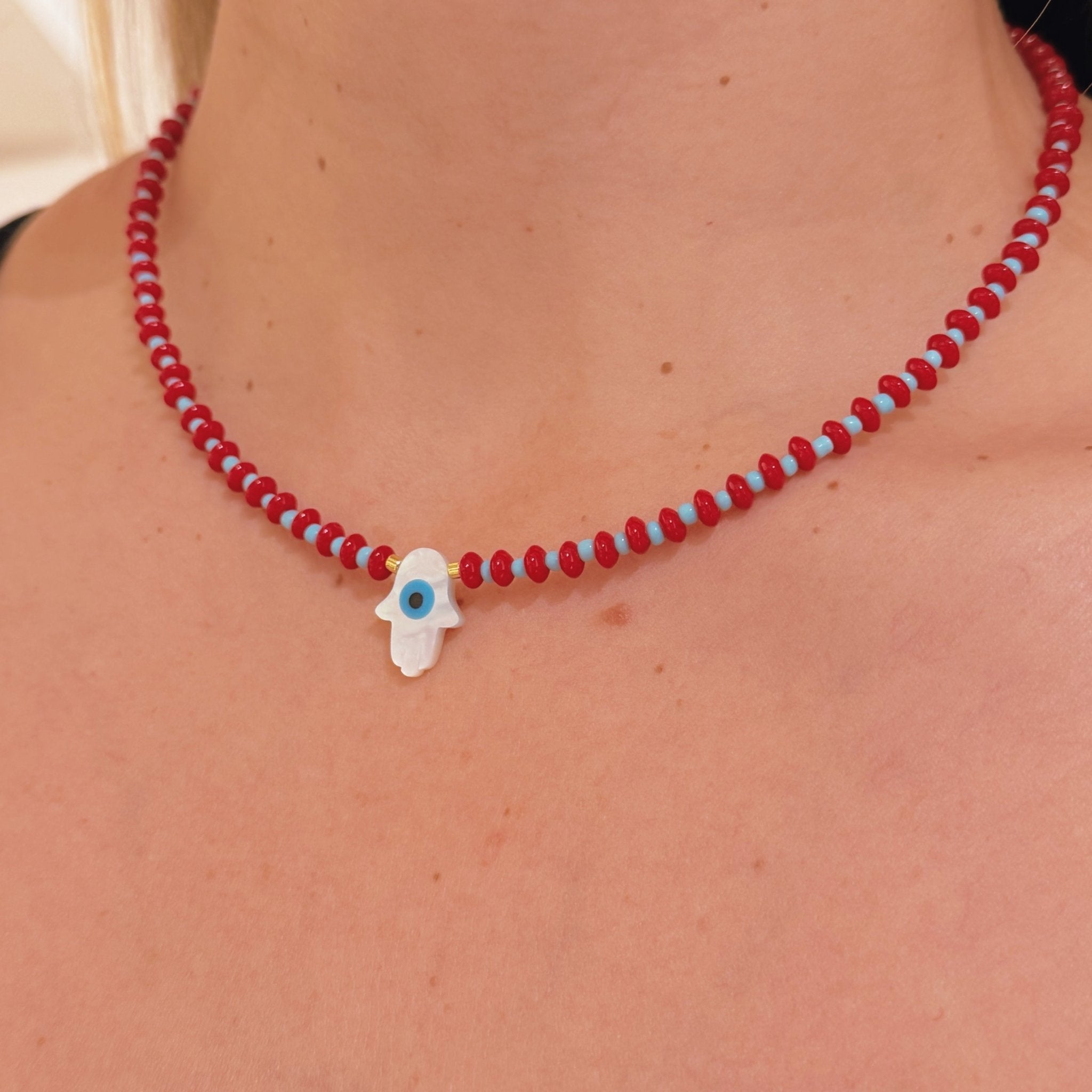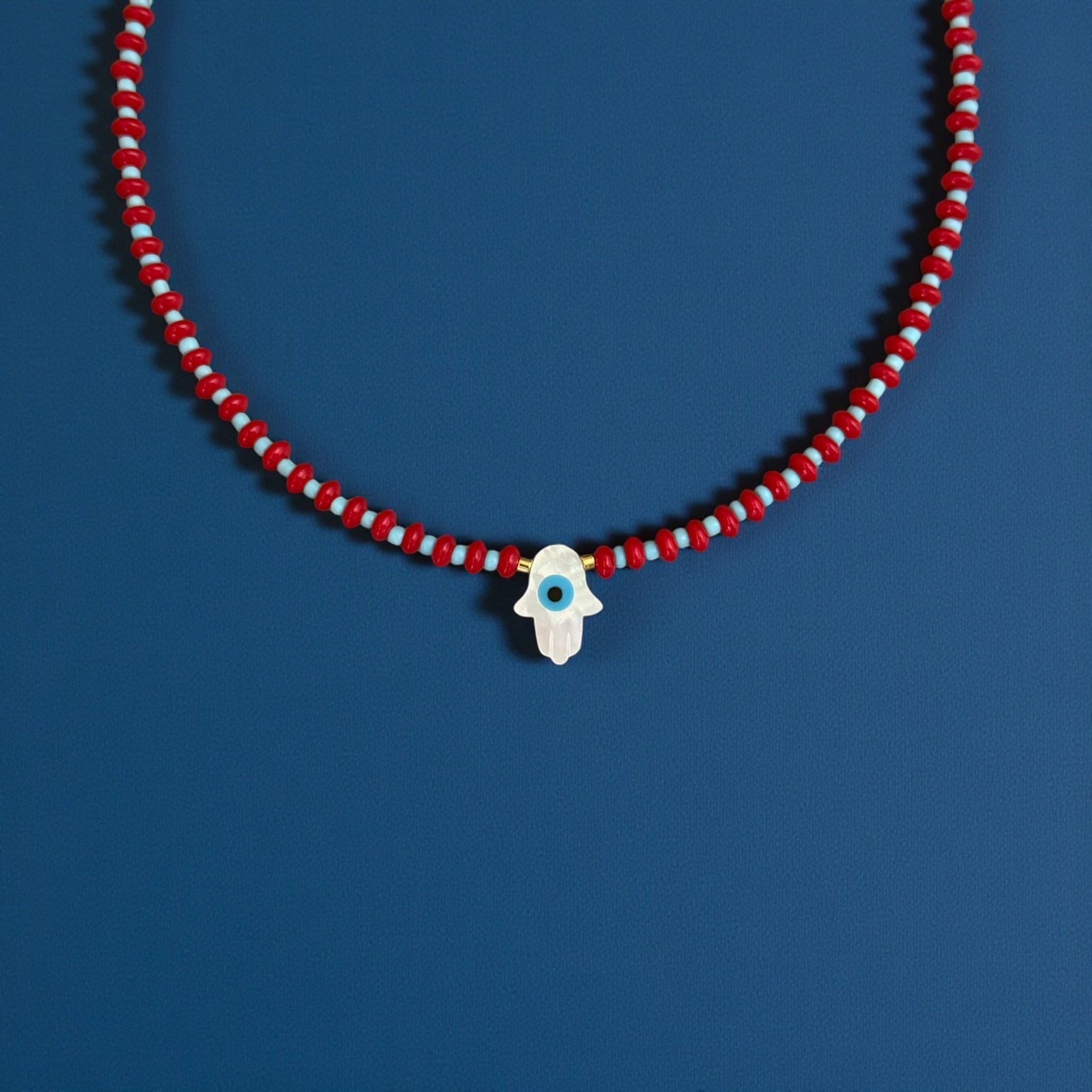 A symbolic beaded necklace designed to bring protection, clarity and elevated beauty into your everyday life. The mother of pearl Hamsa hand features a delicate evil eye at the center, creating a powerful blend of calmness and spiritual safeguarding. The red and turquoise beads add vibrancy and balance, while the gold hematite accents bring a soft, elegant glow. Its adjustable length makes it perfect for layering or wearing on its own.