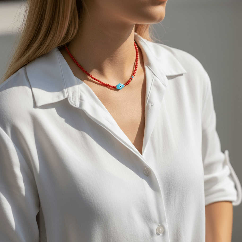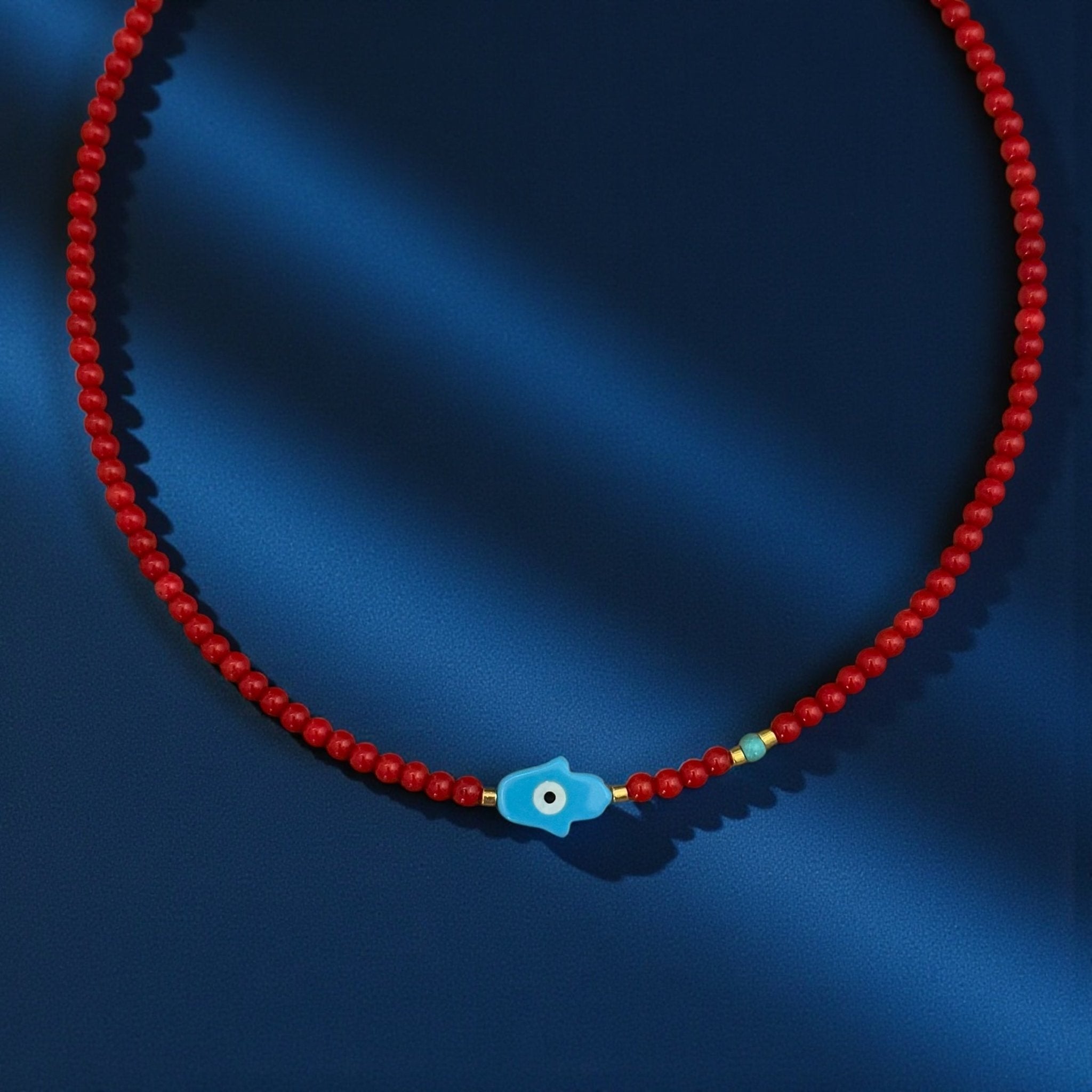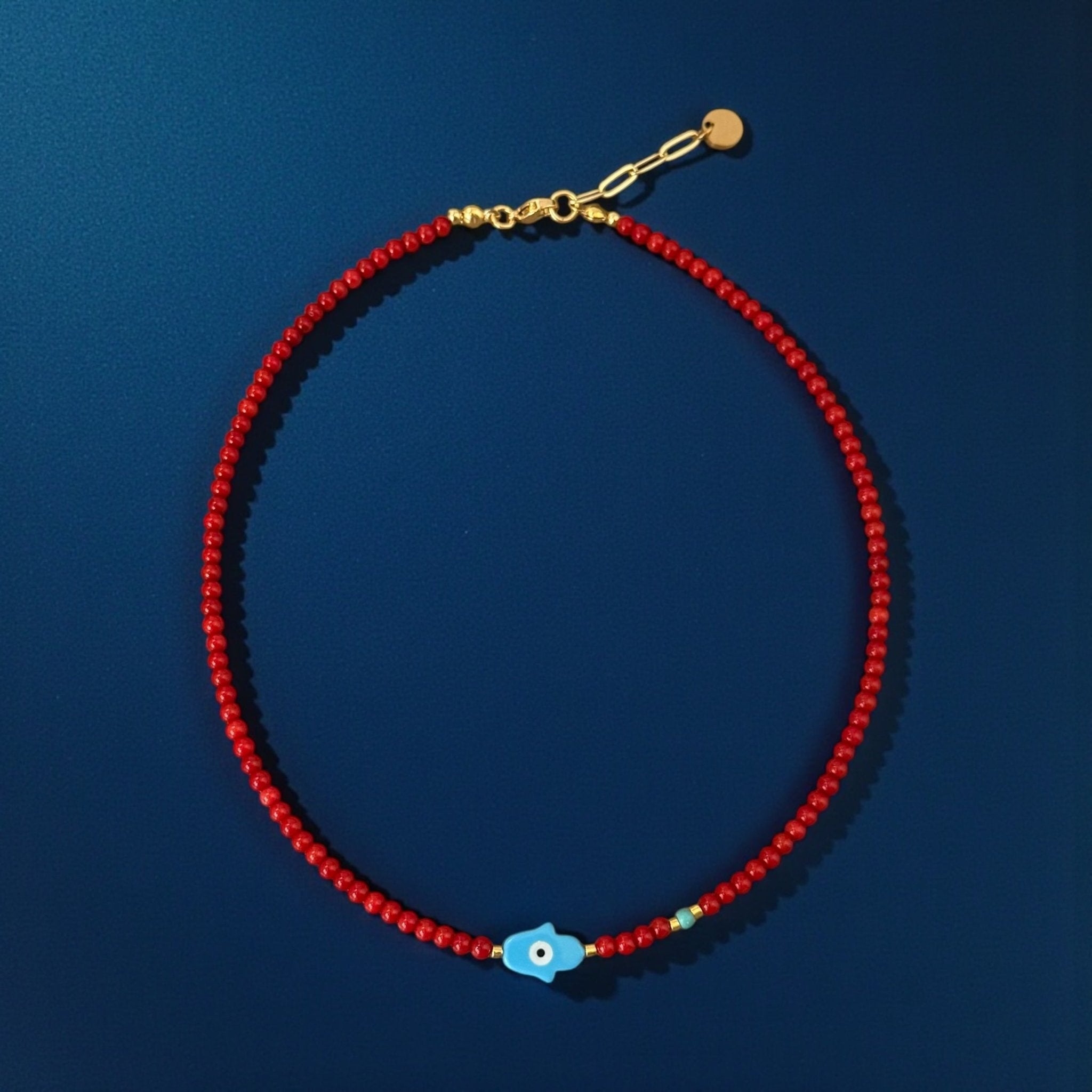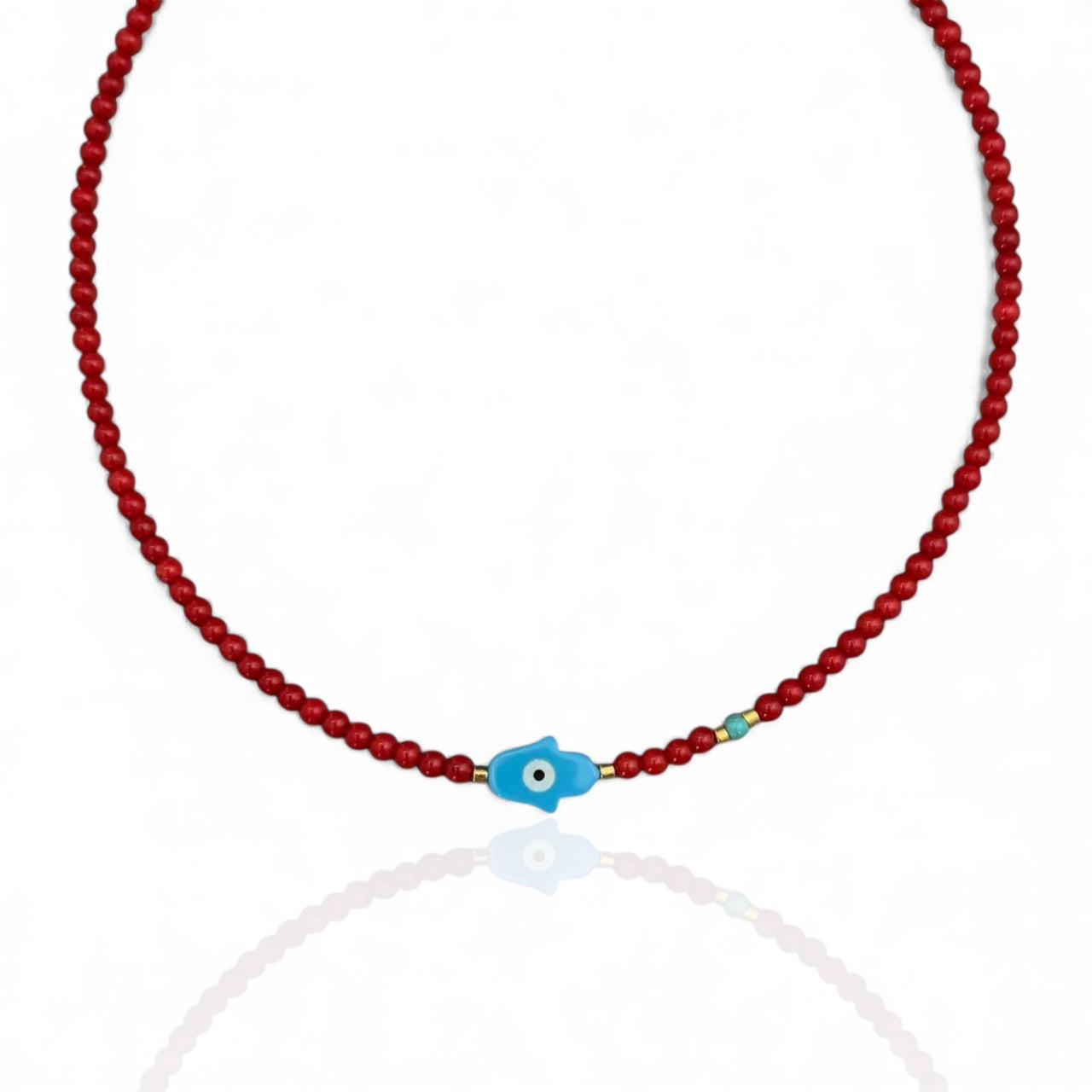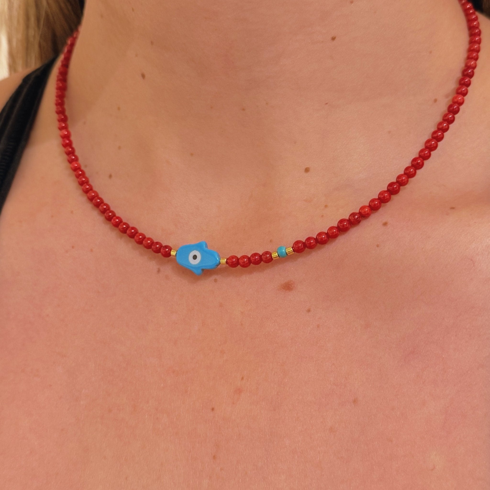 A vibrant protection necklace designed to elevate your energy with symbolic meaning. The blue Hamsa hand at the center represents guidance, clarity and powerful safeguarding, while the coral beads bring warmth and positive vibrancy. A touch of turquoise and gold accents completes the look with a refined and modern feel. Its adjustable length makes it easy to wear every day and layer effortlessly.