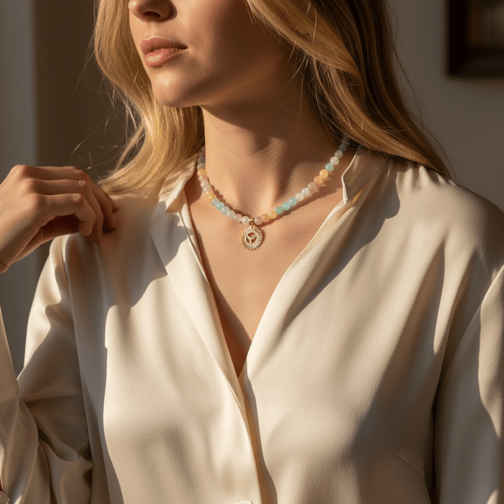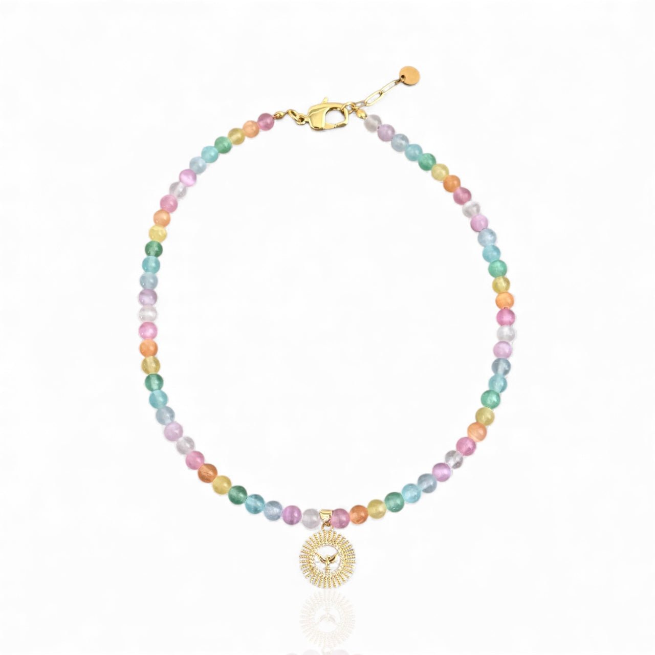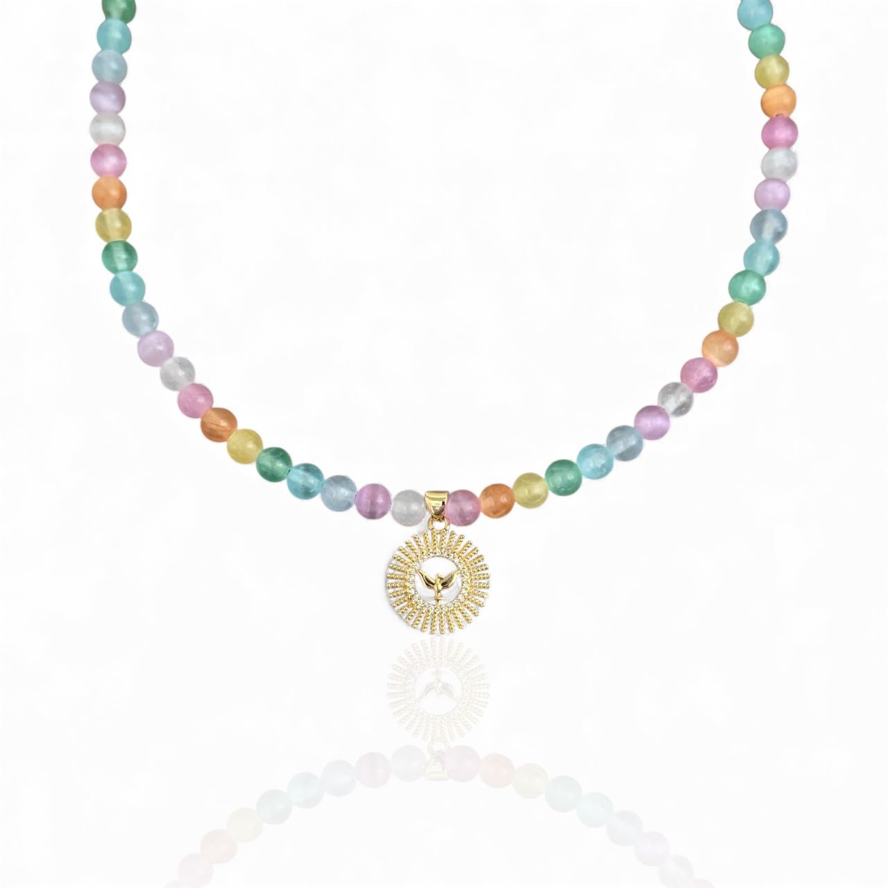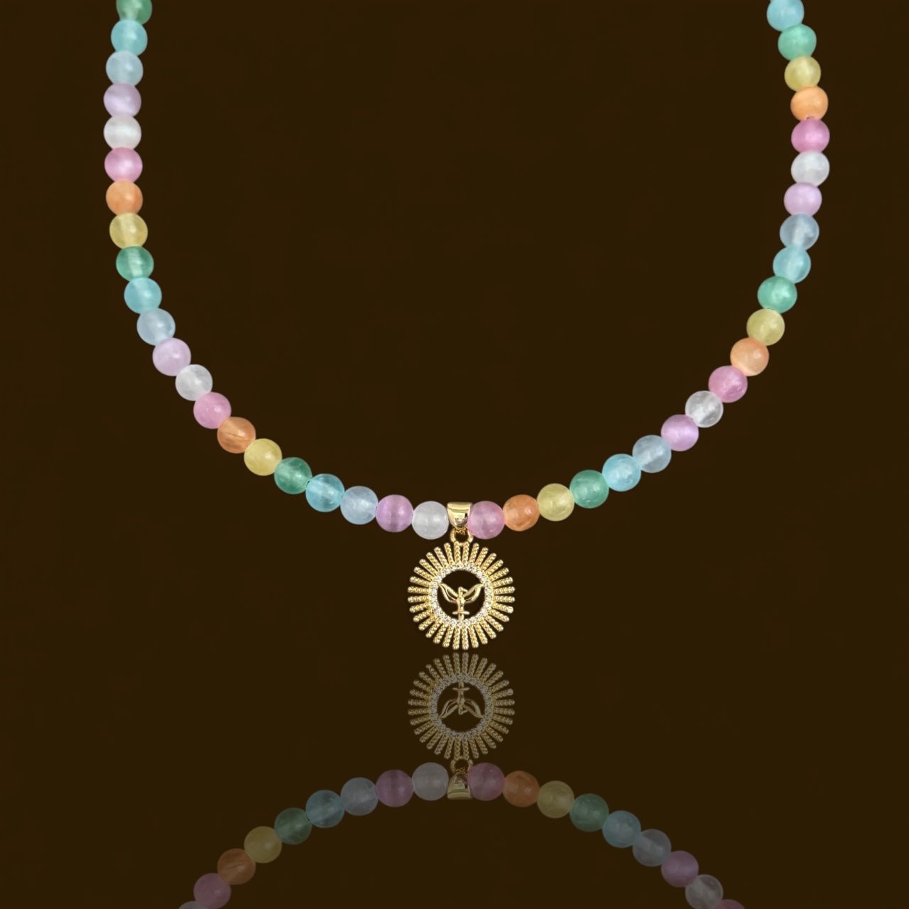 A radiant handcrafted necklace designed with multicolor cat’s eye gemstones and a detailed Holy Spirit pendant surrounded by delicate cubic zirconias. The soft glow of the gemstones brings a luminous, uplifting touch, while the pendant adds a symbolic and elevated finish. Adjustable for everyday styling or layering.