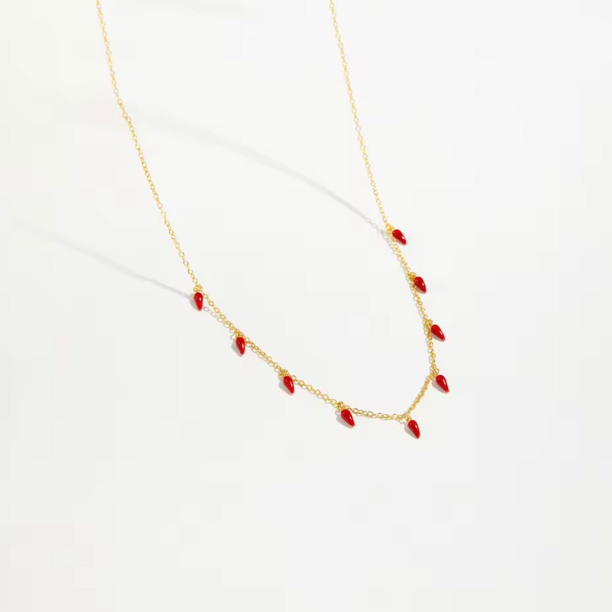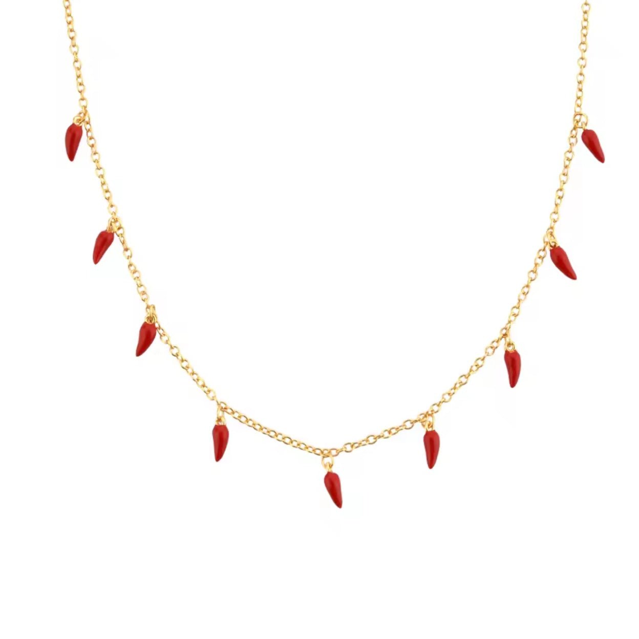 This necklace brings a bold and playful energy, featuring vibrant red enamel chili charms that symbolize protection and good fortune. Perfect for layering or wearing solo, it adds a chic and trendy touch to any look while carrying a powerful meaning.