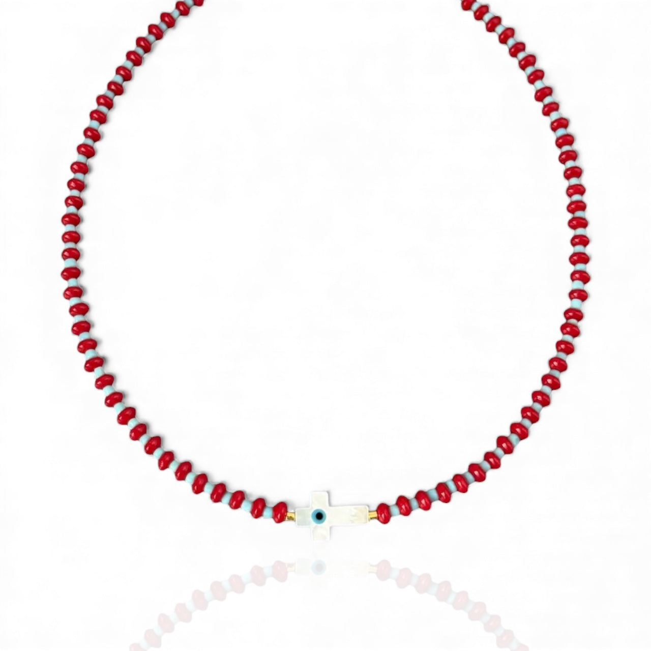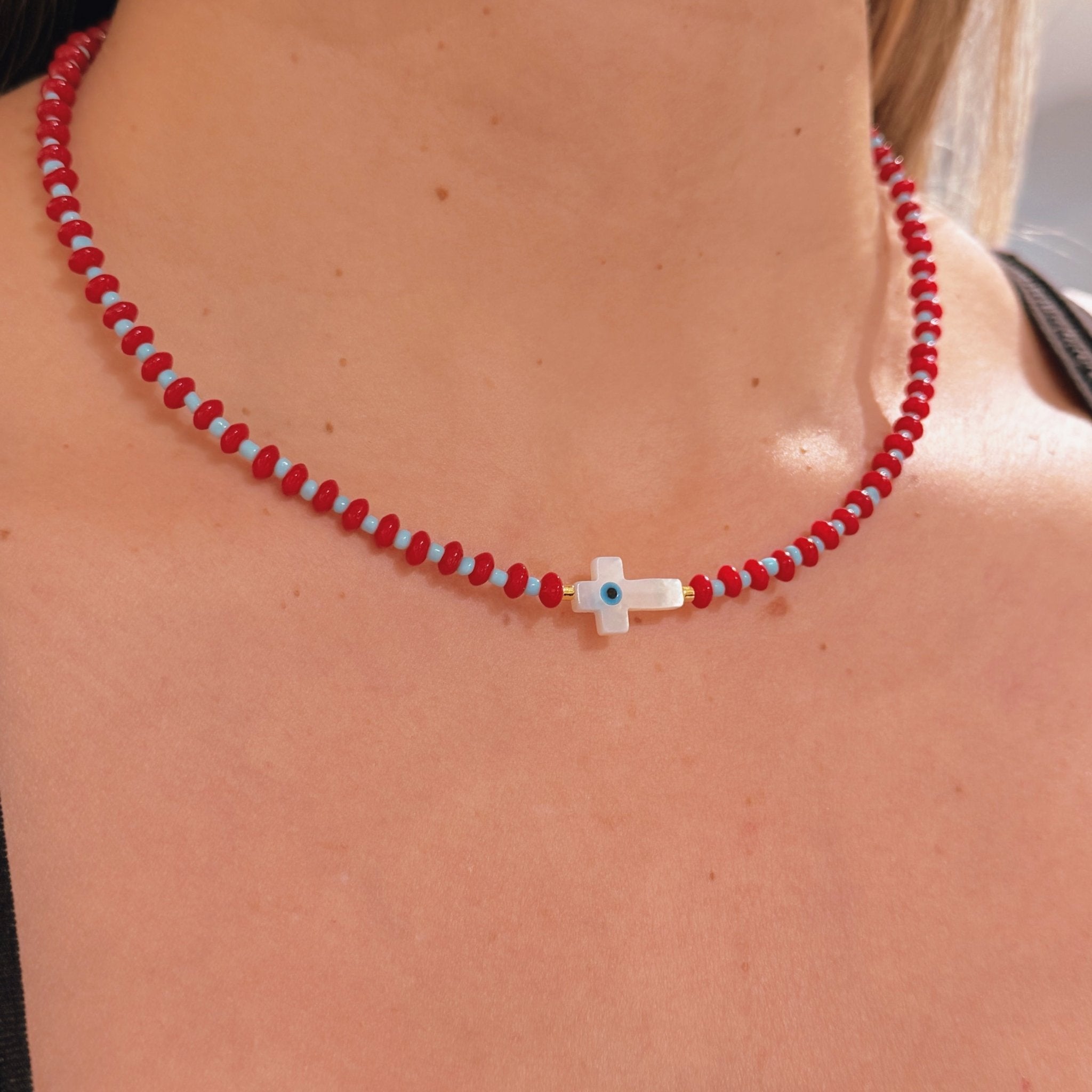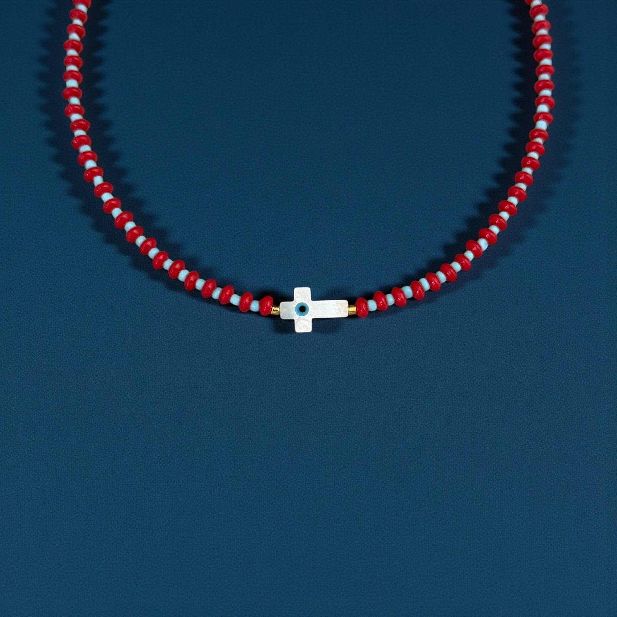 A symbolic beaded necklace designed to bring protection, clarity and elevated beauty into your everyday life. The mother of pearl cross features a tiny evil eye at the center, creating a powerful blend of spiritual safeguarding and soft luminous energy. The red and turquoise beads add vibrancy and balance, while the gold hematite accents complete the look with a refined touch. Its adjustable length makes it perfect for layering or wearing on its own.