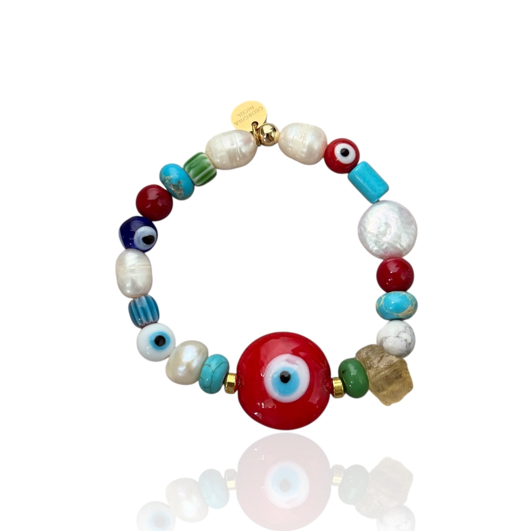 An artisanal blend of color, protection, and meaning. This limited-edition bracelet features a red Murano glass evil eye centerpiece surrounded by an elegant mix of turquoise, citrine, freshwater pearls, baroque pearl, and gold hematite accents. A bold yet refined statement that radiates protection and elevated style.