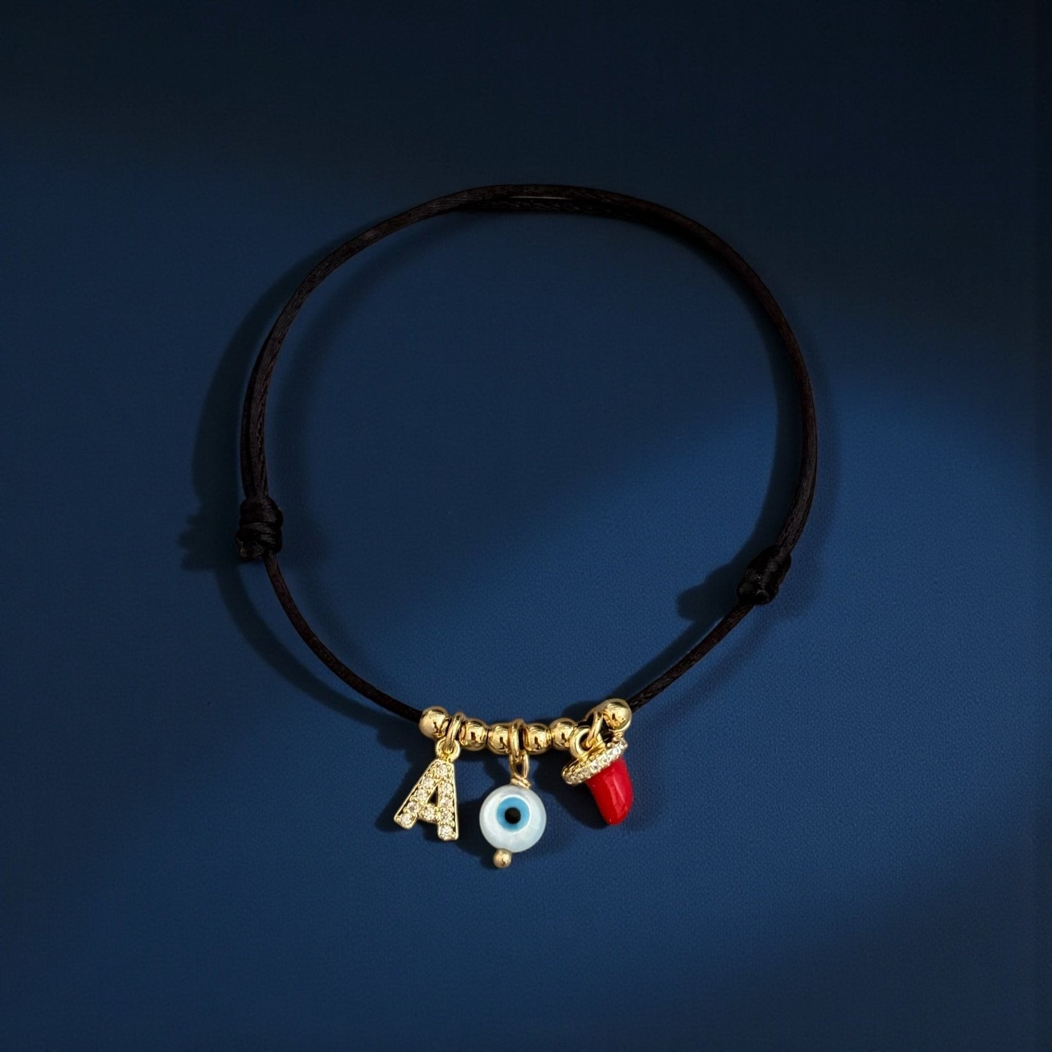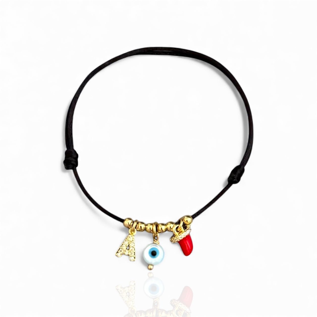 A bracelet designed to feel personal, powerful and elevated. The black cord creates a modern, sleek look, while the CZ initial, mother of pearl evil eye and Italian Cornicello come together to bring you protection, luck and intention in every moment.