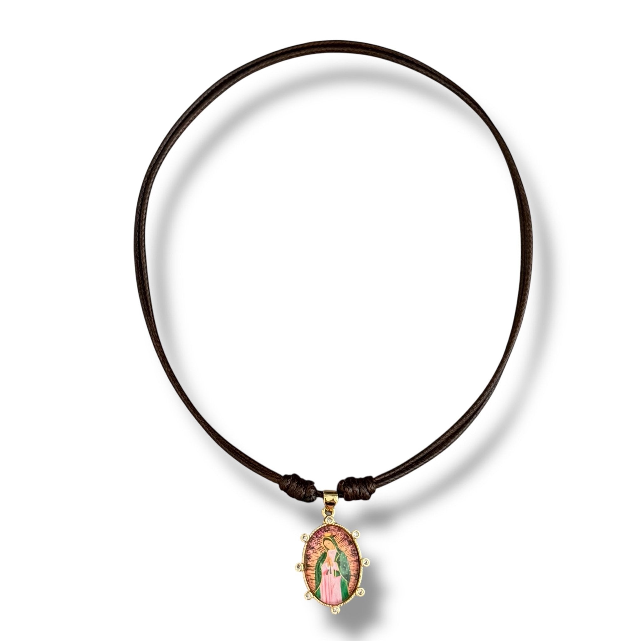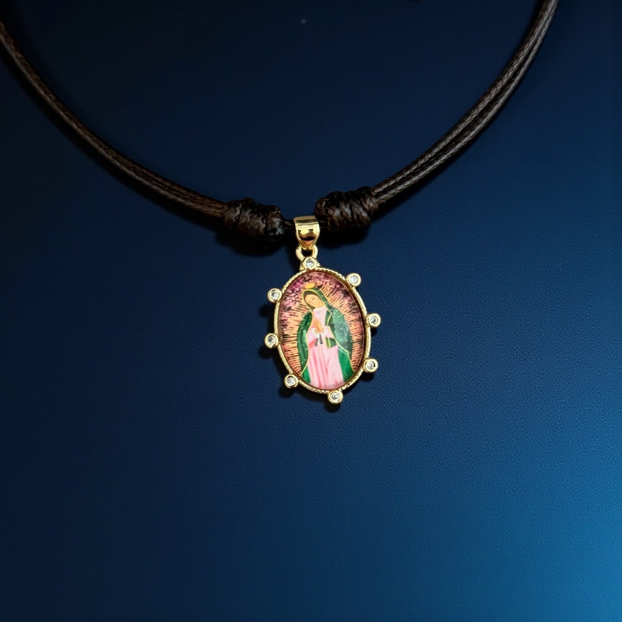 This necklace celebrates the powerful presence of Our Lady of Guadalupe — a symbol of faith, love, and divine protection. Designed with CZ accents and a brown adjustable cord you can wear at your desired length, it carries a message of devotion and grace.