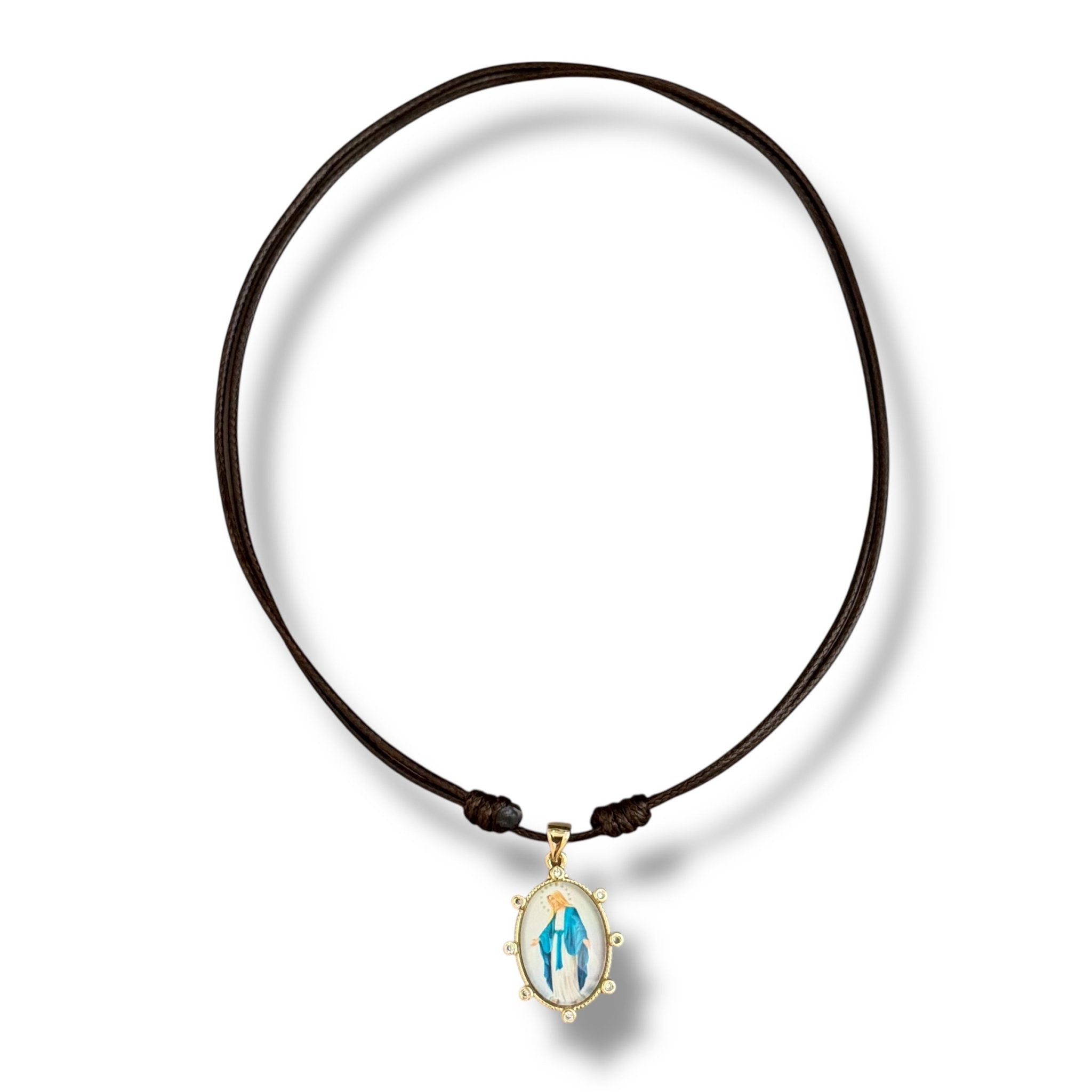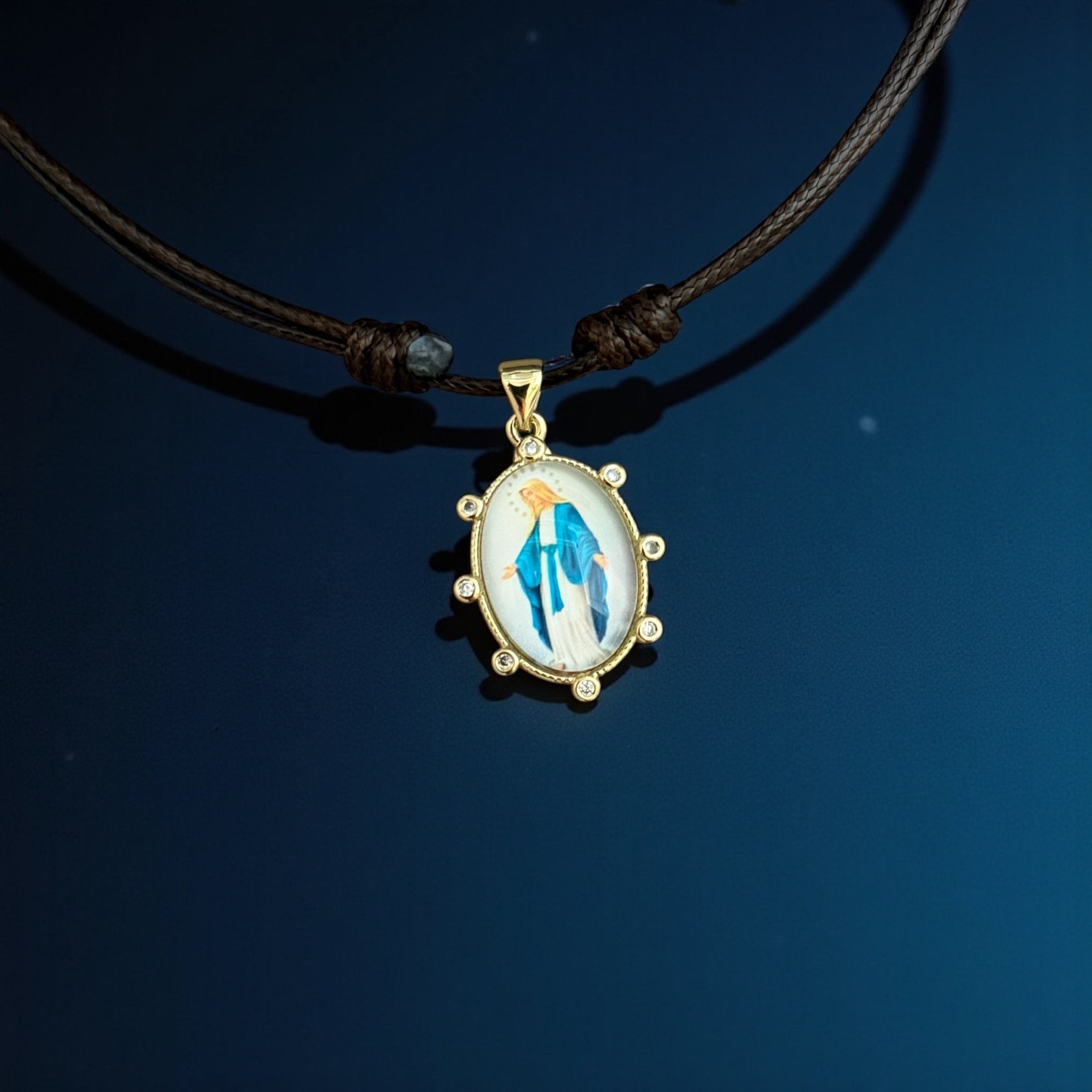 A delicate necklace honoring Our Lady of the Miraculous Medal — symbol of grace, faith, and divine protection. Featuring CZ details and a brown adjustable cord you can wear at your desired length, this piece carries a timeless spiritual energy that inspires peace and devotion.