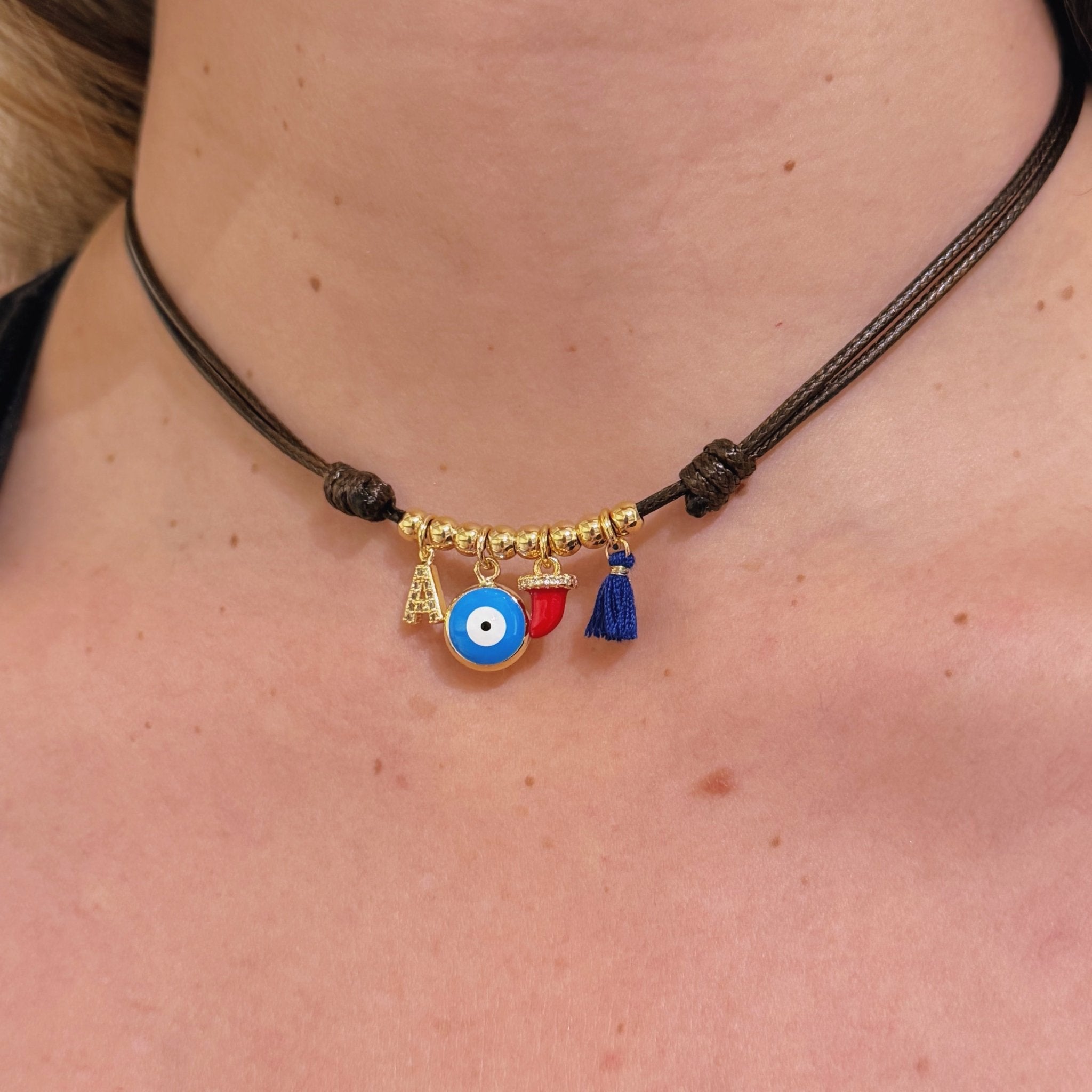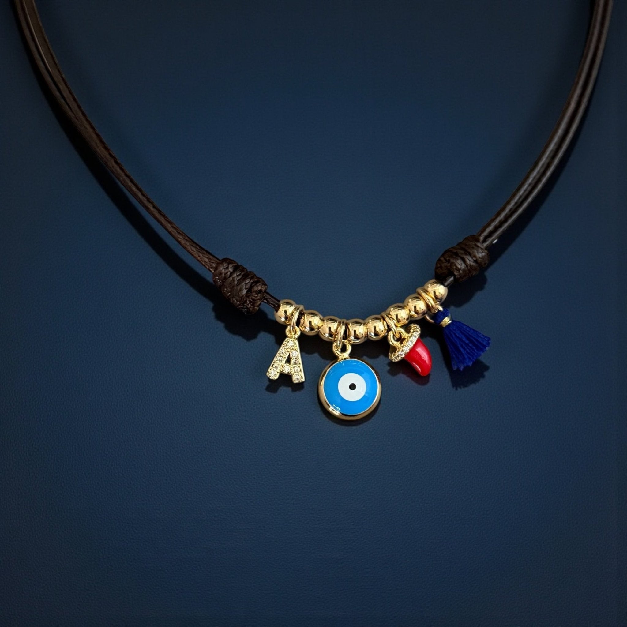A meaningful and personalized necklace designed to bring luck, protection and style into your everyday life. The mix of charms, your CZ initial, the blue enamel evil eye, the tiny Italian Cornicello and the tassel — creates a symbolic blend of clarity, confidence, good energy and personal intention. The brown cord adds an elevated touch, and its adjustable sliding closure allows you to wear it at the exact length you desire.