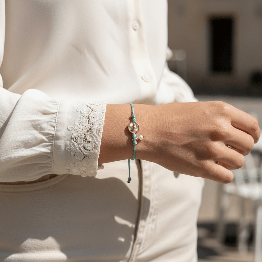 A delicate braided cord bracelet featuring a Virgen del Valle coin paired with a genuine freshwater pearl charm. The soft braided cord adds texture while keeping the design refined and wearable. Finished with an adjustable sliding closure, this bracelet is lightweight, comfortable, and easy to style for everyday wear, whether worn alone or layered with other cord or gold accents.