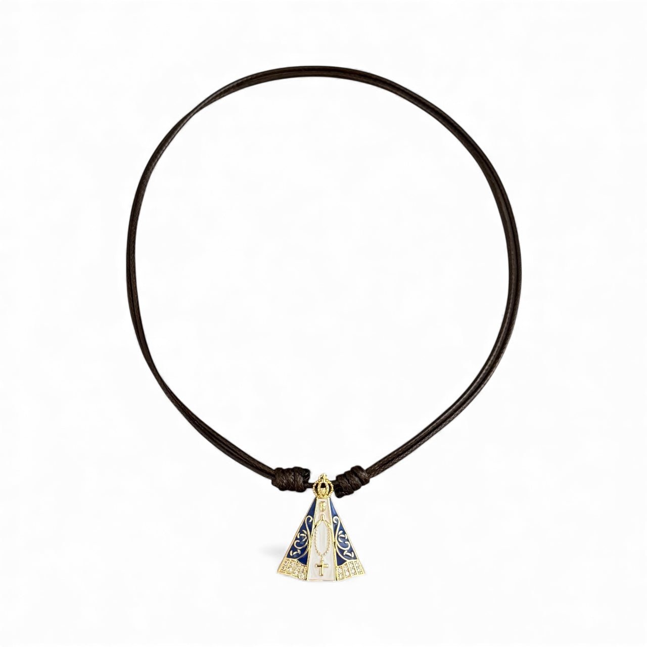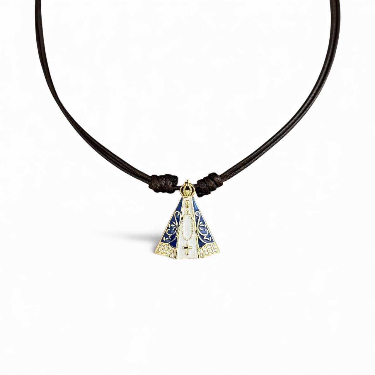 A modern devotional cord necklace featuring a Virgen del Valle charm with enamel details and gold plated finish, designed on a brown adjustable cord for effortless everyday wear. The clean silhouette and refined proportions make this piece easy to style on its own or layered with other necklaces, blending faith-inspired design with a contemporary, elevated aesthetic.