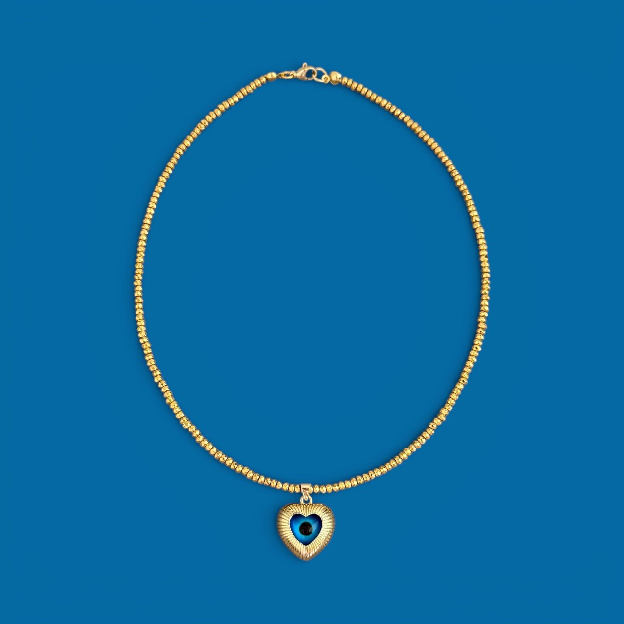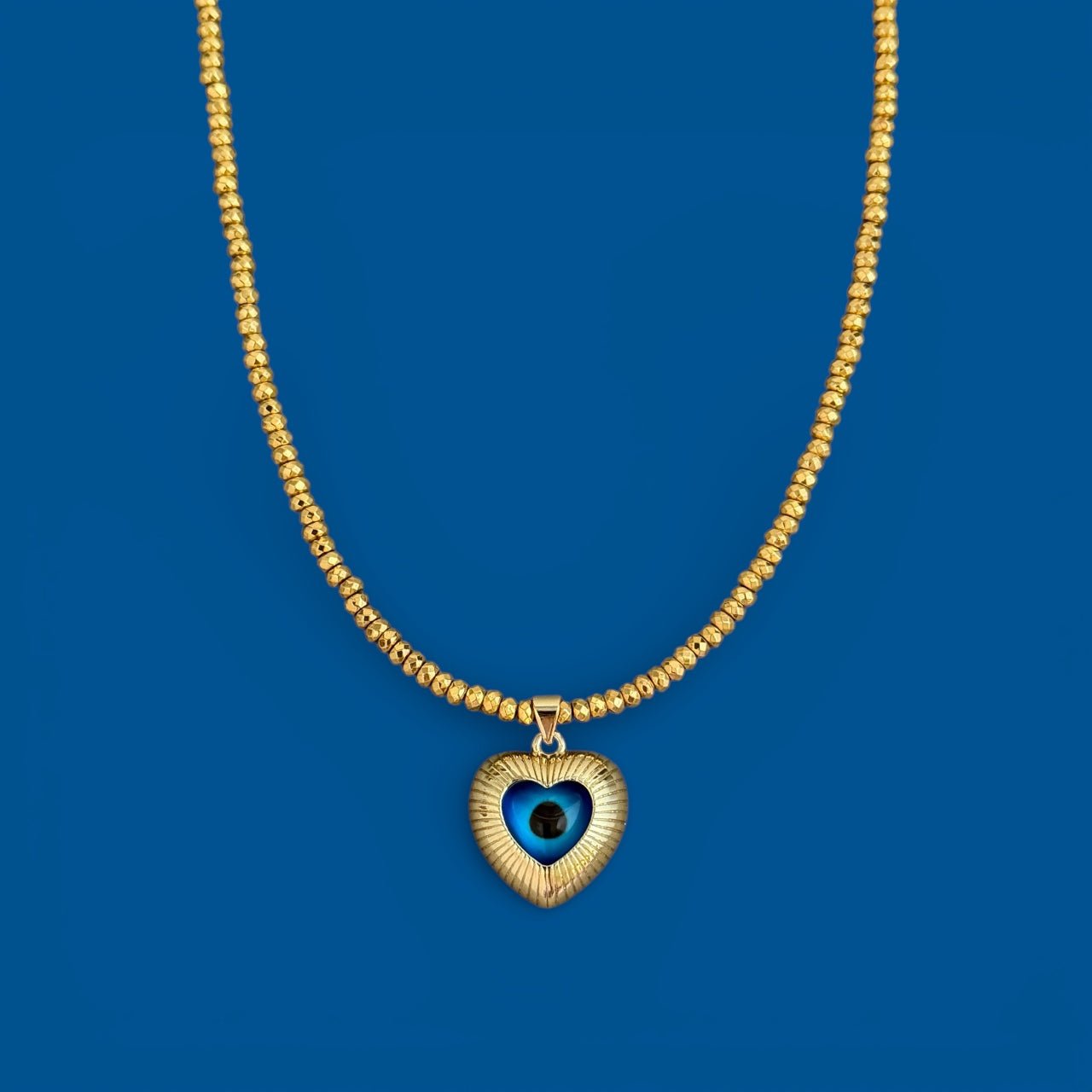Handmade necklace featuring gold hematite beads and a heart-shaped evil eye pendant. The evil eye is traditionally worn as a symbol of protection, believed to help ward off negative energy while adding a meaningful touch to your everyday style. Designed to be worn alone or layered, this piece blends symbolism with a refined, minimal aesthetic.