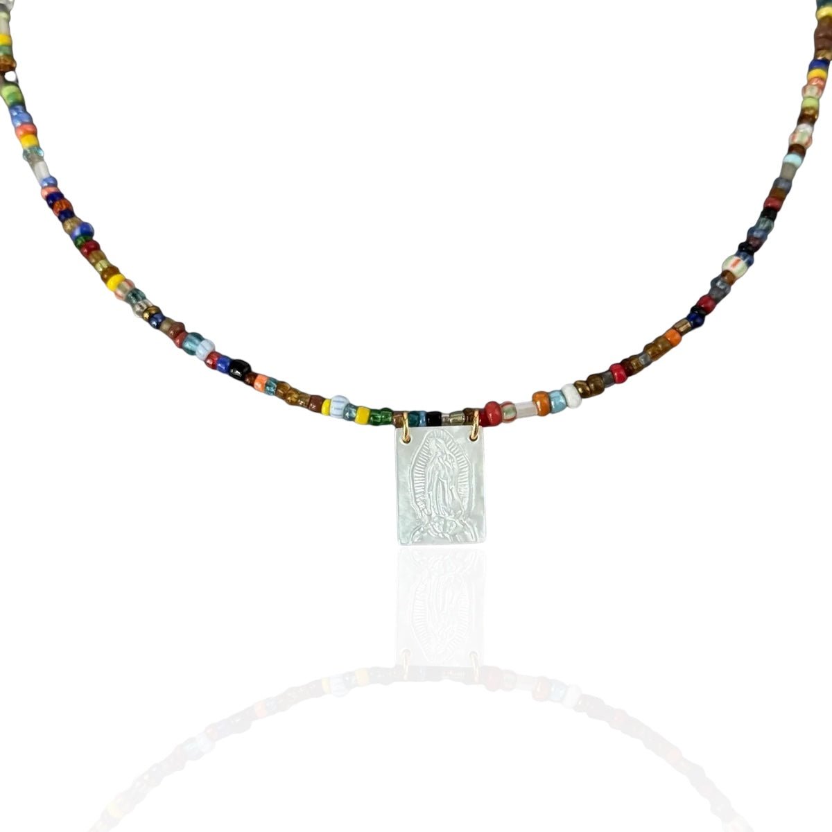 A vibrant expression of faith and joy. This necklace features the Virgin of Guadalupe delicately carved in luminous mother of pearl, symbolizing divine protection and grace. The multicolor beaded design adds a modern, playful touch — a piece that radiates positivity and devotion in perfect harmony.