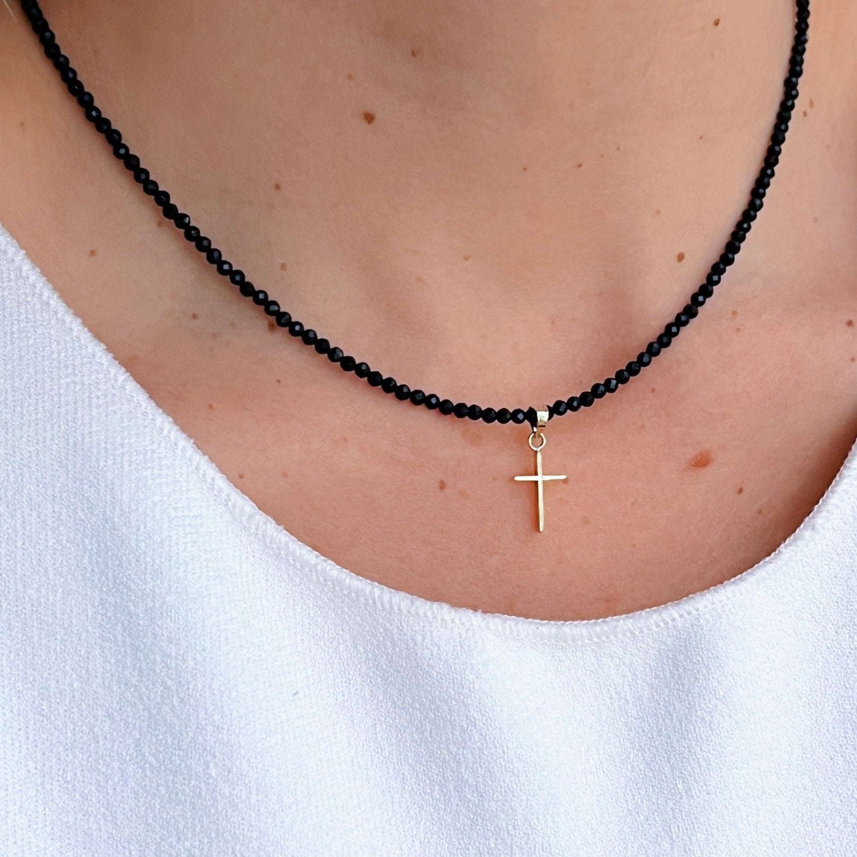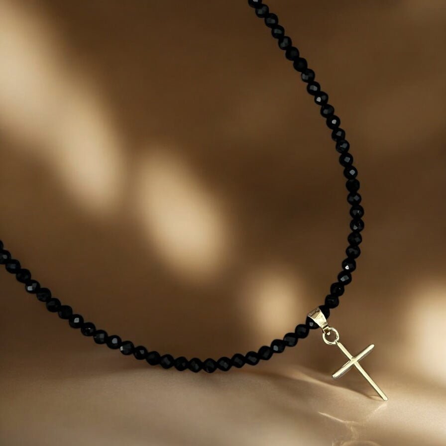 This elegant necklace features genuine black spinel gemstones, known for their grounding and protective properties, paired with a 14K solid gold cross pendant, a timeless symbol of faith, strength, and divine guidance. The contrast between the deep black spinel and the radiant gold creates a sophisticated and meaningful piece, perfect for everyday wear or special occasions.