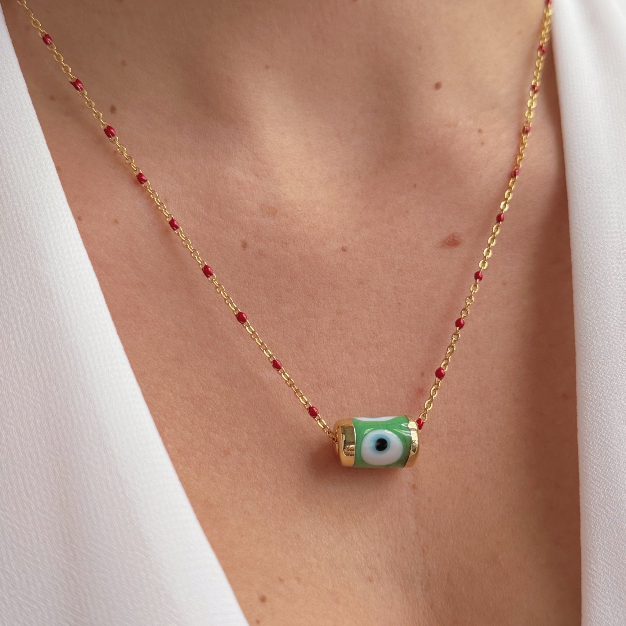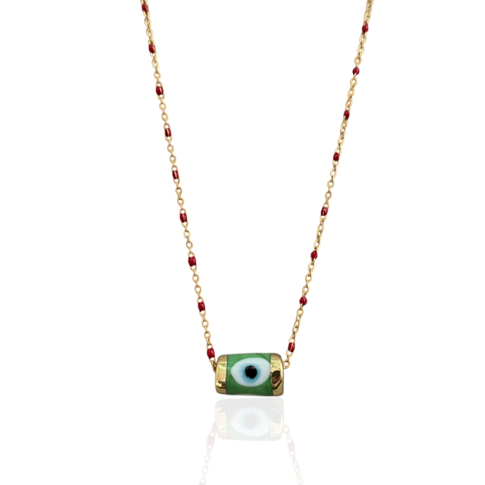 Designed to radiate bold energy and modern elegance, this necklace combines the timeless symbolism of the evil eye with the vibrance of red enamel beads. The green glass evil eye represents healing, balance, and growth — while the red accents add strength and protection. A chic reminder that your energy is always protected.