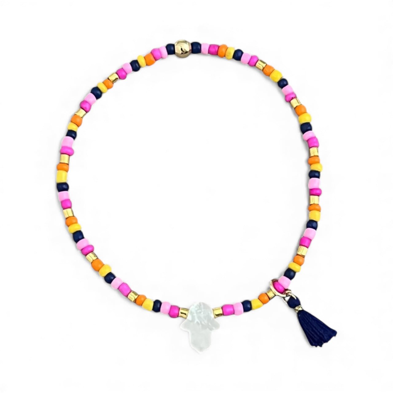 A joyful mix of warm and bold tones with a luminous mother of pearl hamsa hand, this bracelet symbolizes protection, good fortune, and positive energy. Perfect for adding a vibrant yet meaningful touch to your everyday look.